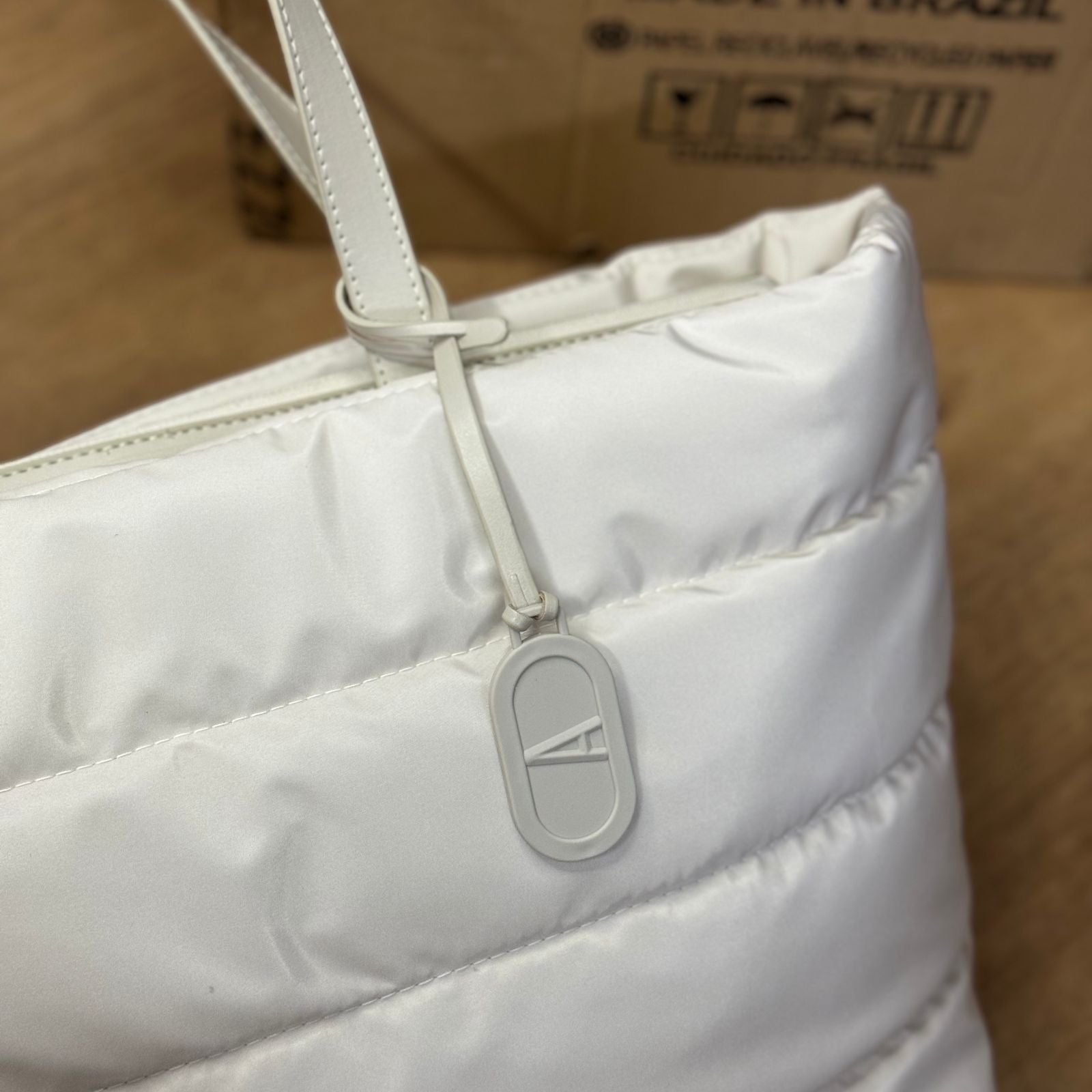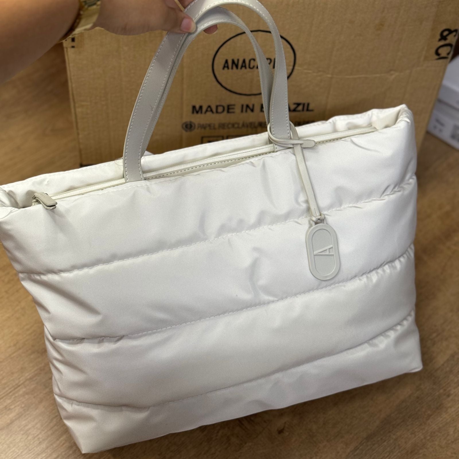 De tamanho grande, possui duas alças de mão em tiras finas com contorno em pesponto e fecho superior em zíper com puxador em tira. O modelo apresenta capas costuradas em matelassê linear com efeito fluffy e aplicação de etiqueta lateral com assinatura Anacapri. Forrada na parte interna, essa bolsa possui compartimento para carregar notebook e demais eletrônicos com total segurança. Acompanha bag charm emborrachado removível em formato de cápsula com inscrição da inicial “A” - assinatura Anacapri. O acessório pode ser utilizado separadamente da bolsa.