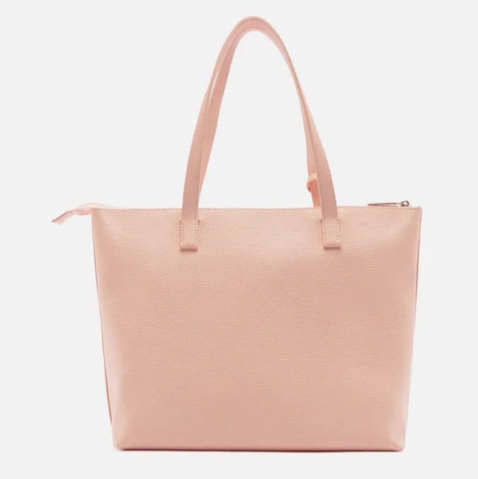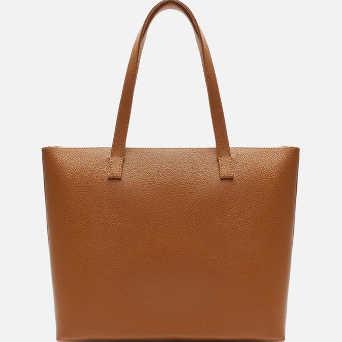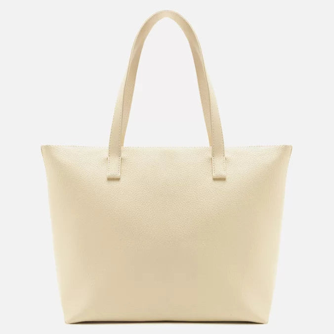 O modelo tem formato estruturado e acabamento texturizado. Traz duas alças de ombro, fecho superior em zíper e puxador. Acompanha bag charm removível em formato envelope, que funciona também como necessaire e bolsa de mão, preso à alça por tira e com fecho por encaixe.
