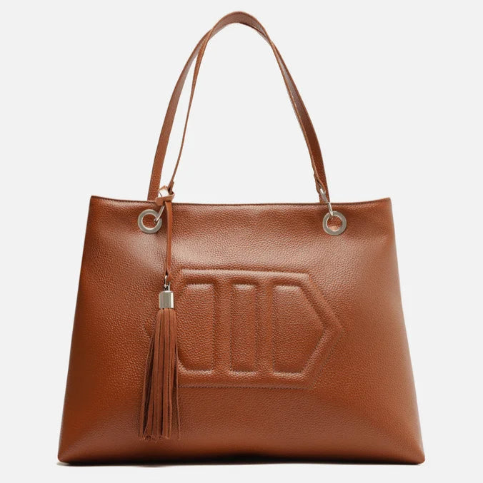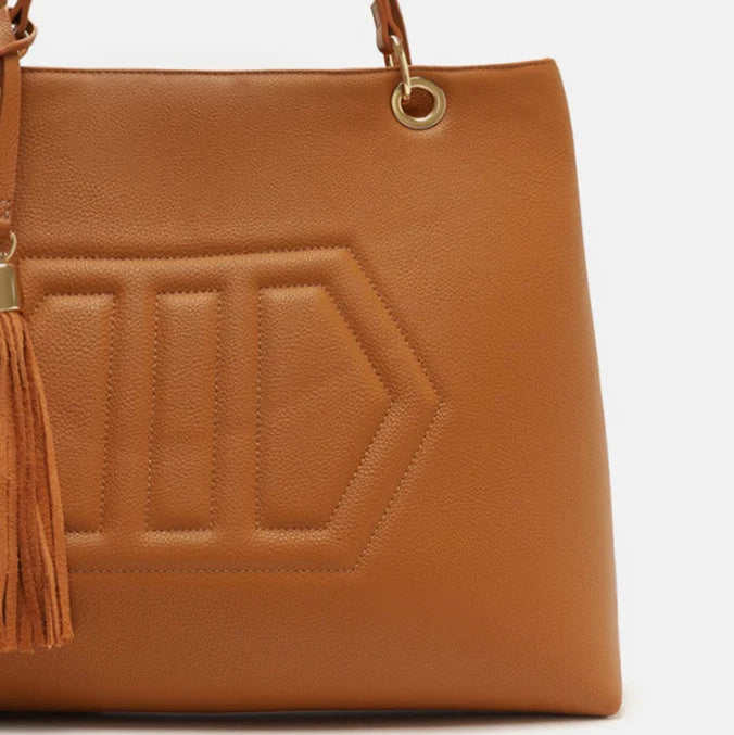 Descrição: O modelo tem formato estruturado, laterais arredondadas e acabamento acetinado. Traz duas alças de mão em tiras finas e bag charm removível em barbicacho. Possui fecho em zíper e puxador e detalhe de costuras em forma geométrica na capa.