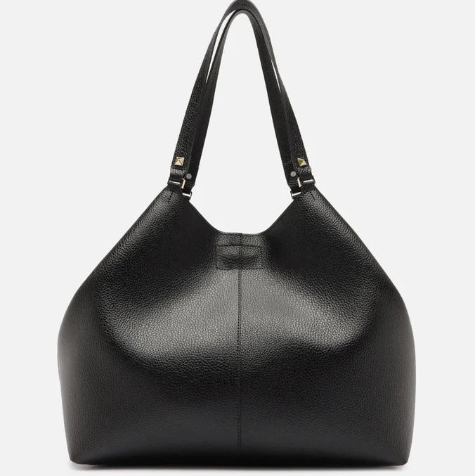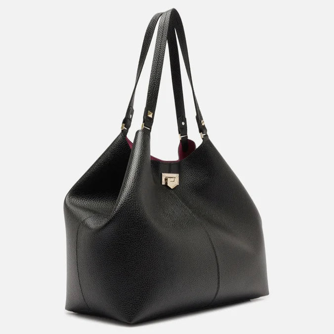 Descrição: O acessório tem formato estruturado e laterais retas. Traz alças de ombro com detalhe em tachas metálicas. Com fecho superior por encaixe em peça metálica. Pode ser regulada nas laterais para ser usada como hobo.