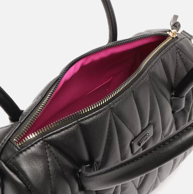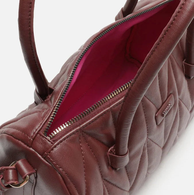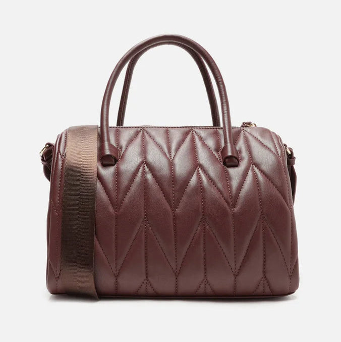 Descrição: O modelo tem formato estruturado e retangular, laterais arredondadas e capas em matelassê zig zag. Traz alça lateral regulável, alças de mão bombadas e porta-alça imponente sobre as capas. Possui fecho superior em zíper, puxador em tira e aplicação discreta do nome da marca.