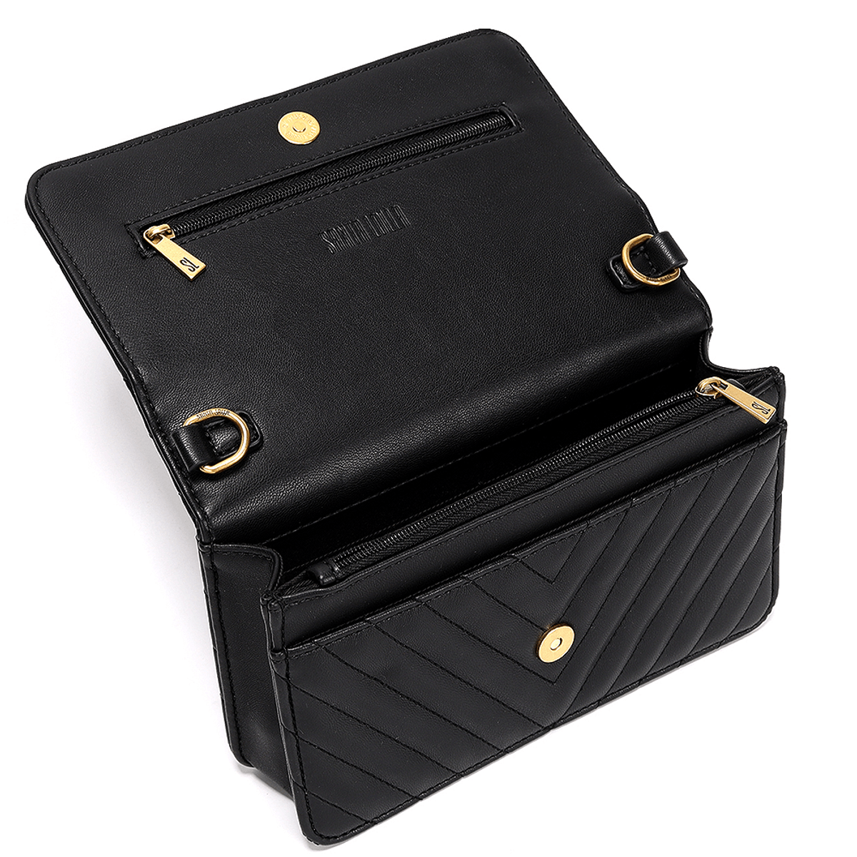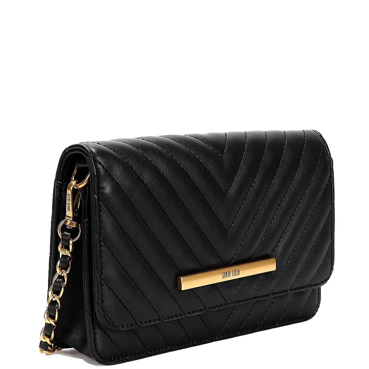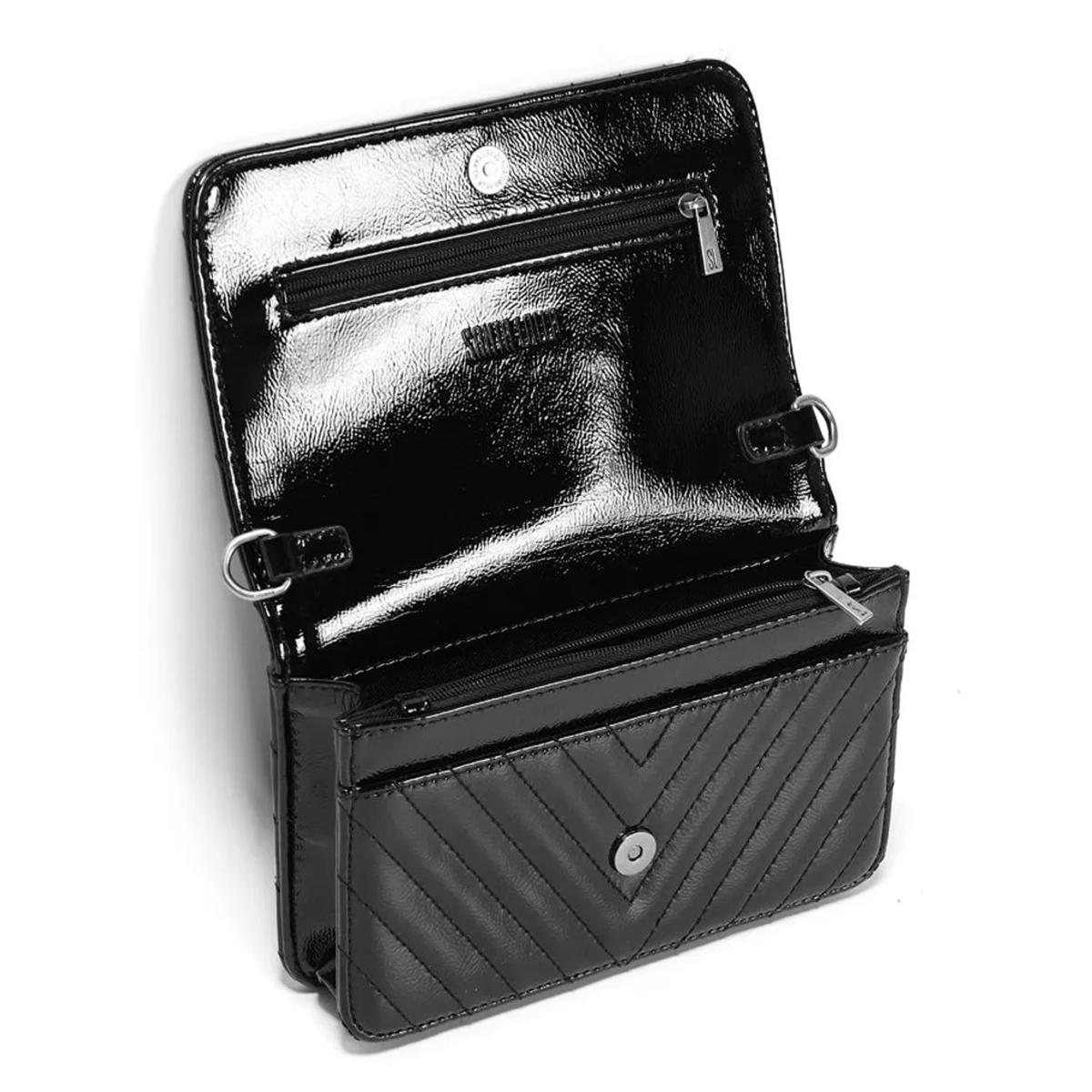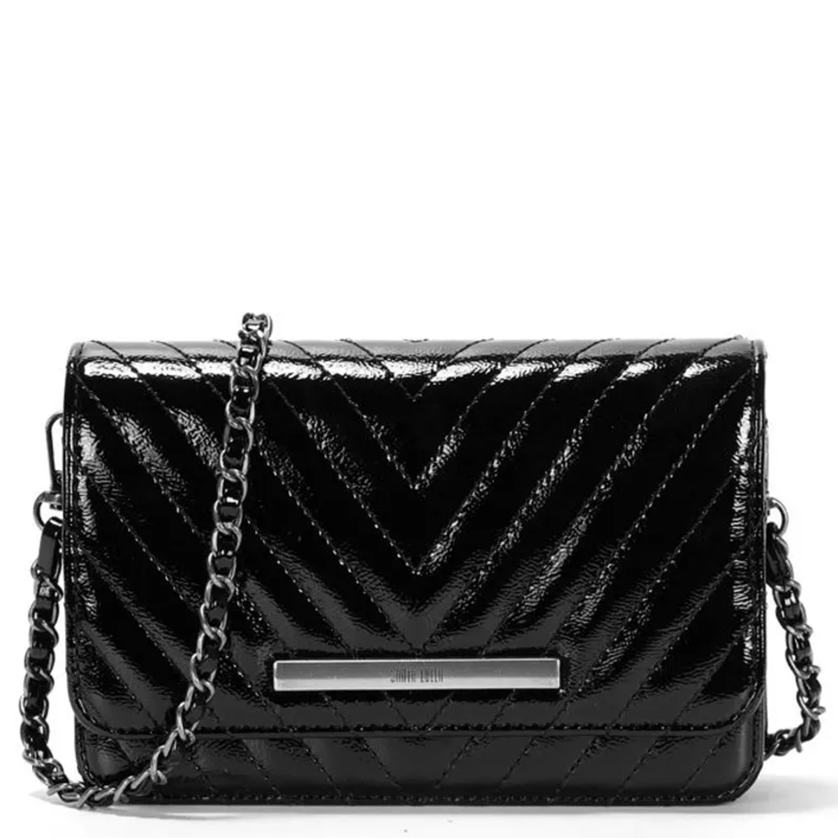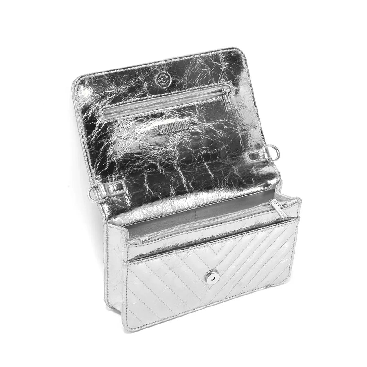 Bolsa pequena confeccionada em material metalizado crinkle com acabamento em costura matelassê, apresentando um design em formato quadrado. O modelo possui alça transversal de corrente, compartimento interno ideal para armazenar itens essenciais, placa frontal metalizada com o logo da marca e fechamento em ímã, unindo praticidade e sofisticação em um único acessório.