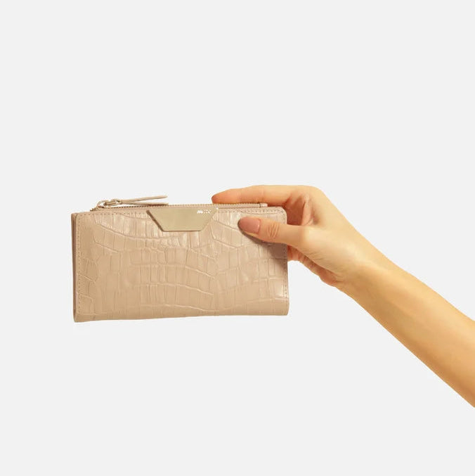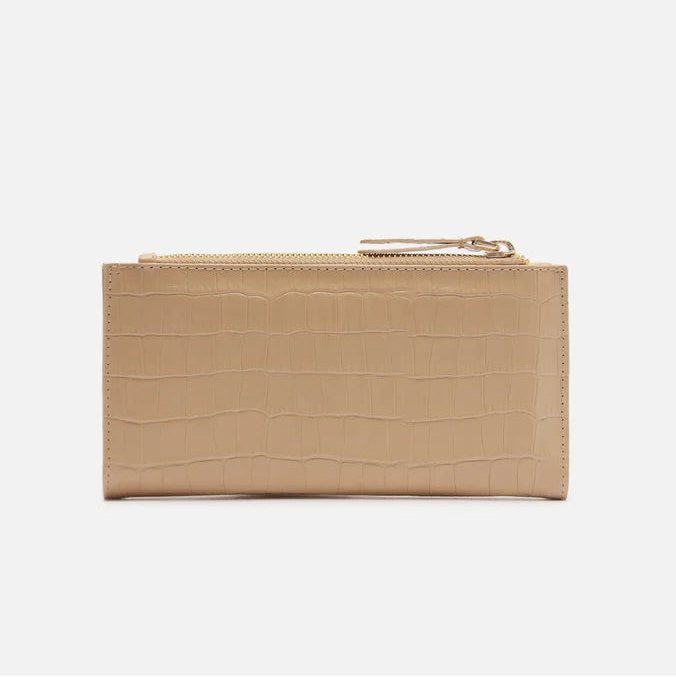 A carteira destaca o acabamento em croco e acomoda dinheiro, documentos e cartões com facilidade. Perfeita para o dia a dia, oferece ótimo espaço interno e confere elegância.