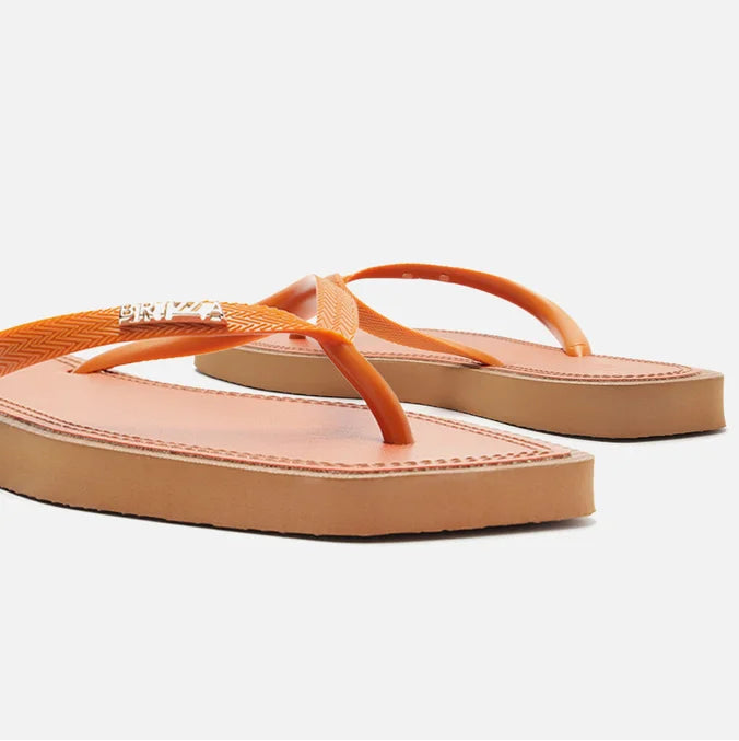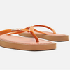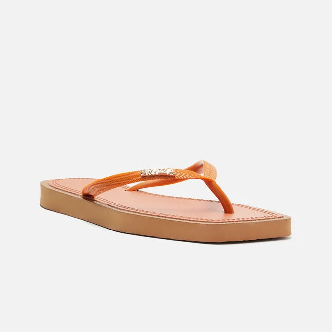 Descrição: O sapato tem sola rasteira flat emborrachada marrom e palmilha rosa lisa com contorno em costura pesponto e nome da marca. Com ponta quadrada, traz tiras finas injetadas, dividindo os dedos, e com aplicação de inscrição metálica do nome da marca em uma delas. Aberto, o chinelo de dedo exibe todo o pé.