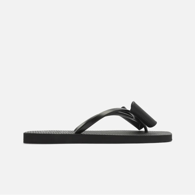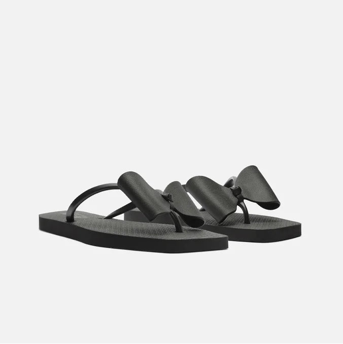 Descrição: O modelo tem sola rasteira flat emborrachada e palmilha texturizada com inscrição do nome da marca. De bico quadrado, traz tiras finas injetadas, dividindo os dedos, e com aplicação de laço grande no centro. Aberto, o chinelo de dedo exibe todo o pé.