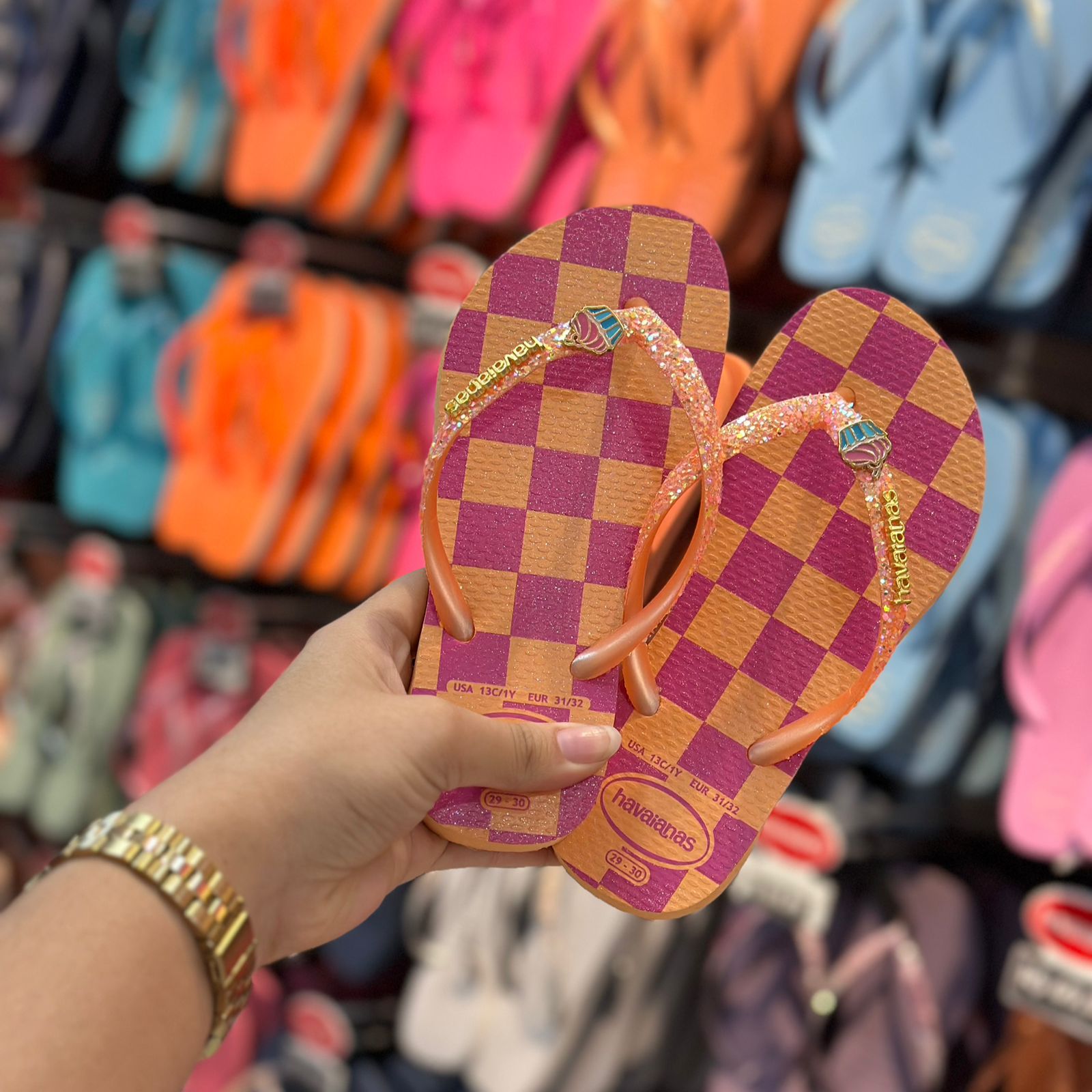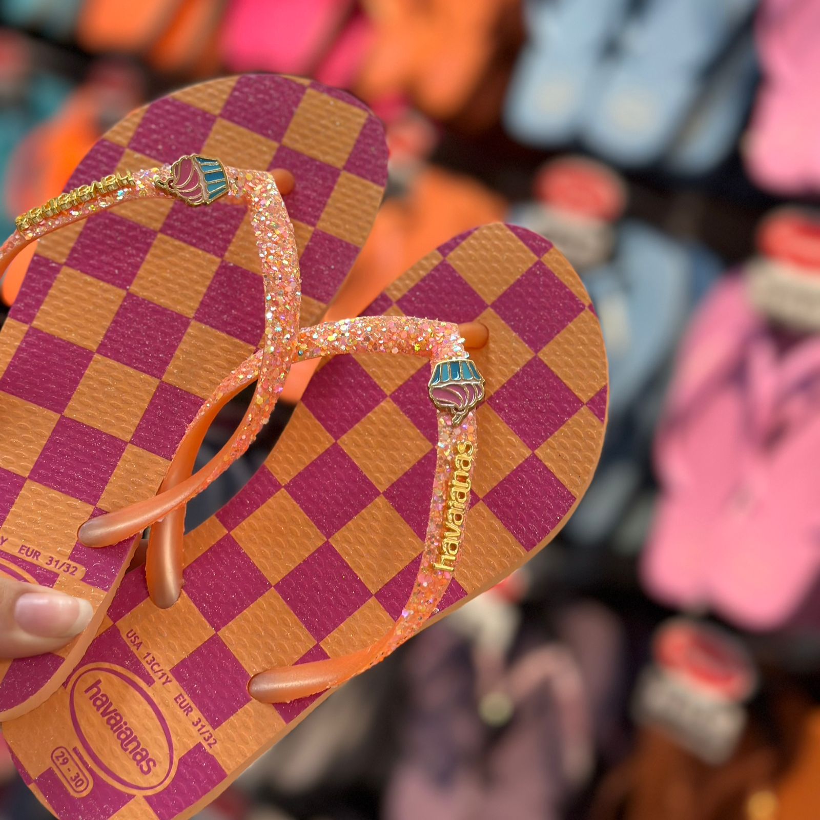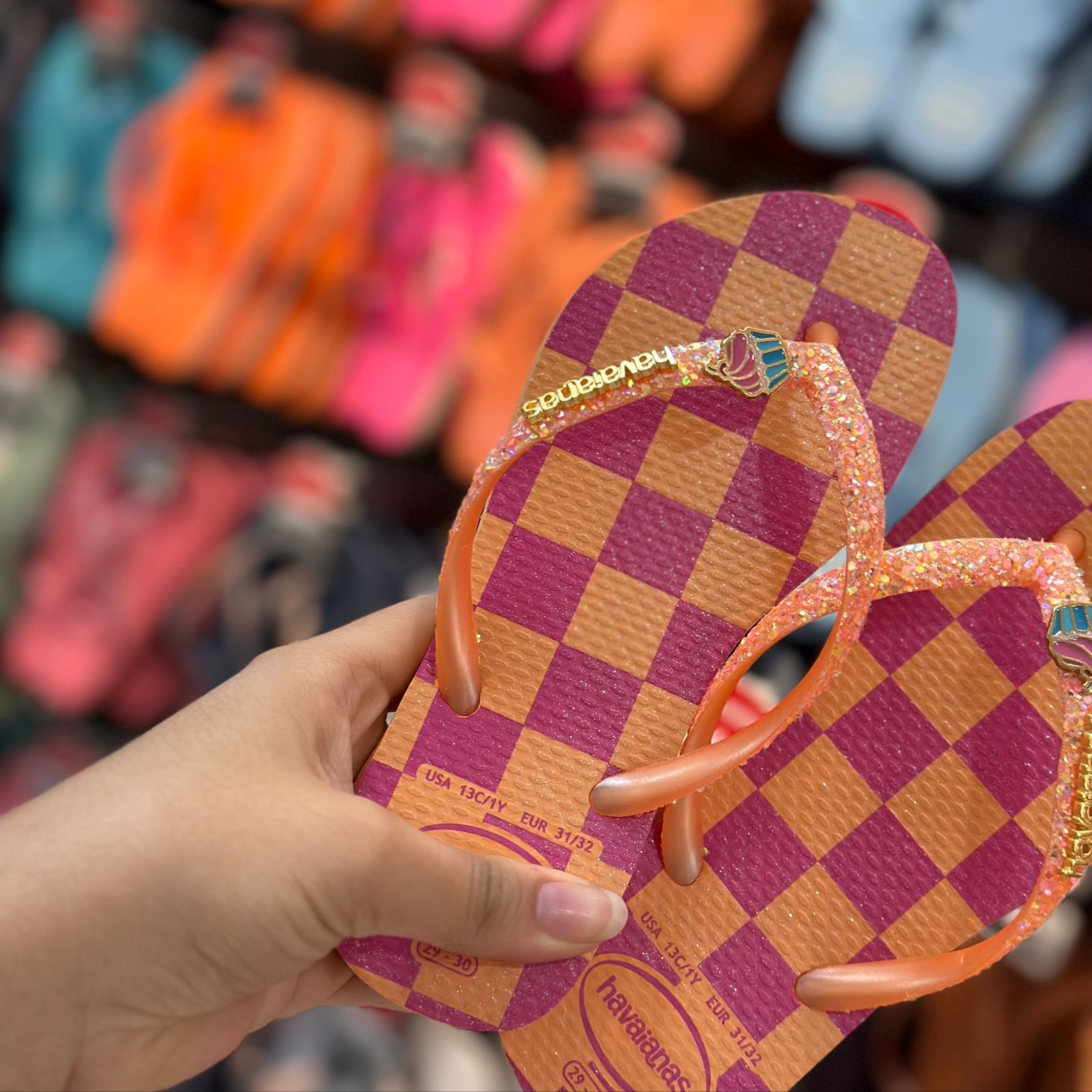 As crianças fashionistas vão pirar com as Havaianas Kids Slim Glitter II, que tem estampas de animal print super coloridas e tiras cobertas por glitter holográfico. Uma lindeza!