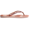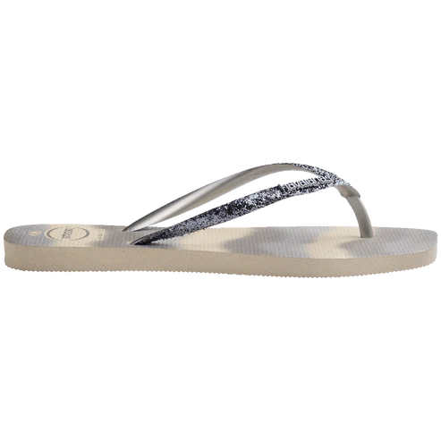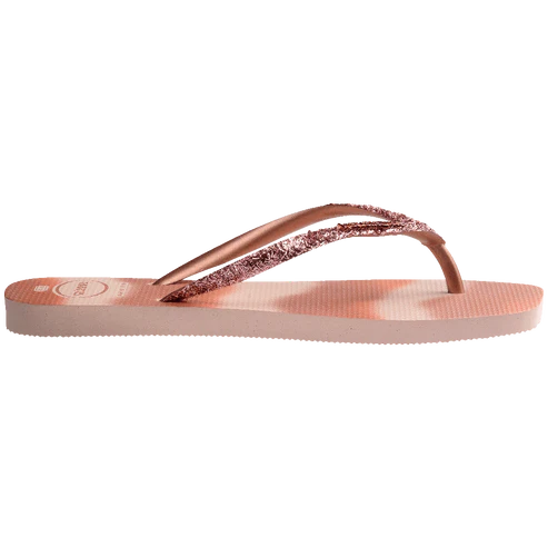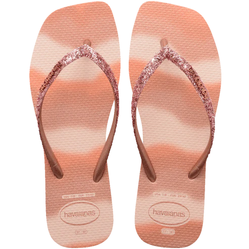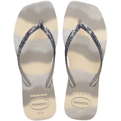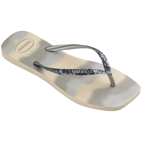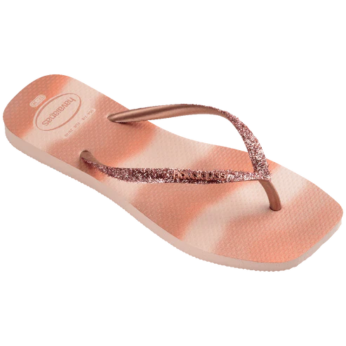 A Havaianas Slim Square Glitter Party junta várias coisas boas: glitter metálico nas tiras, logo metalizado, uma sola estampada com leve degradê e o bico quadrado que virou sucesso por aqui. Elegante e interessante, na mesma medida.