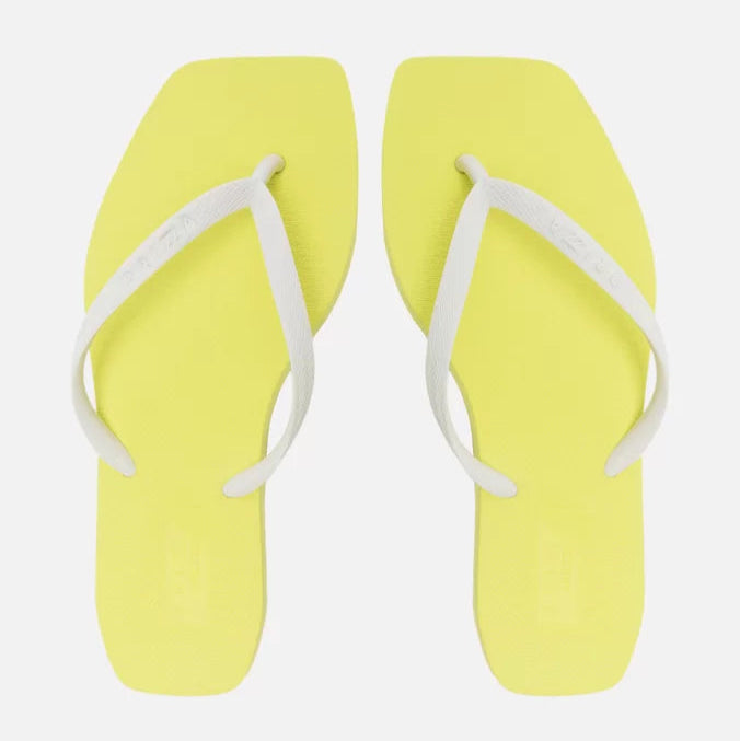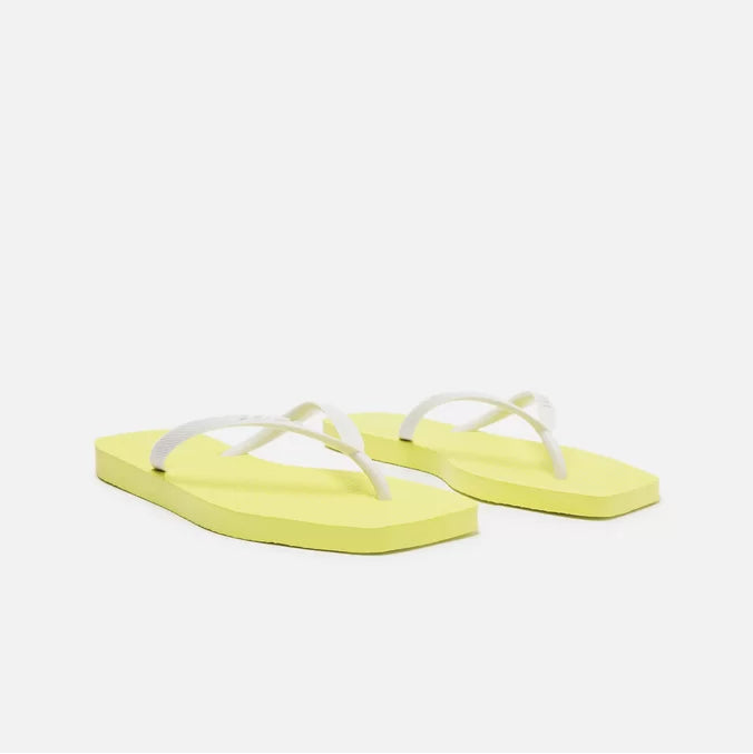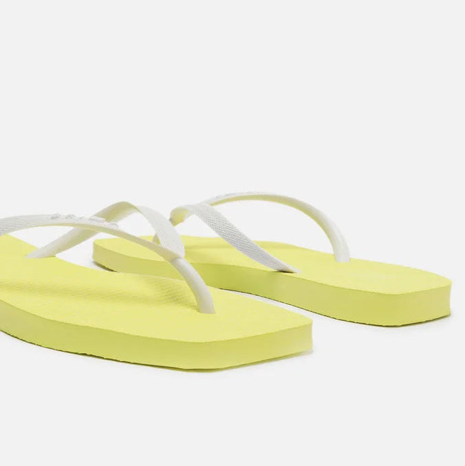 Descrição: O modelo tem sola rasteira flat emborrachada e palmilha texturizada com inscrição do nome da marca. De bico quadrado, traz tiras finas injetadas amarelas, dividindo os dedos, com nome da marca em uma delas. Aberto, o chinelo de dedo exibe todo o pé. Acompanha pouch amarela com fecho em zíper e alça lateral em cordão, além de tag do nome da marca.
