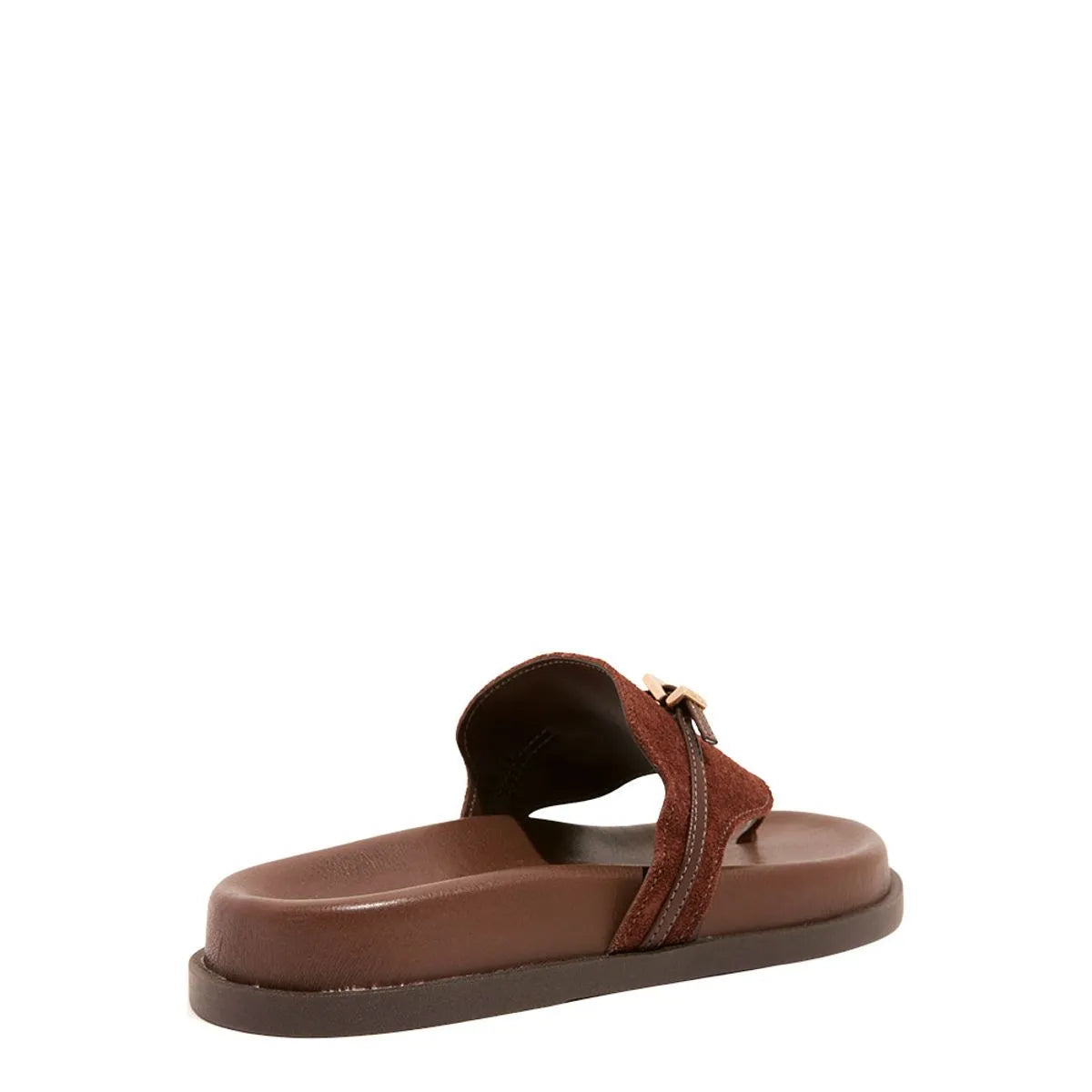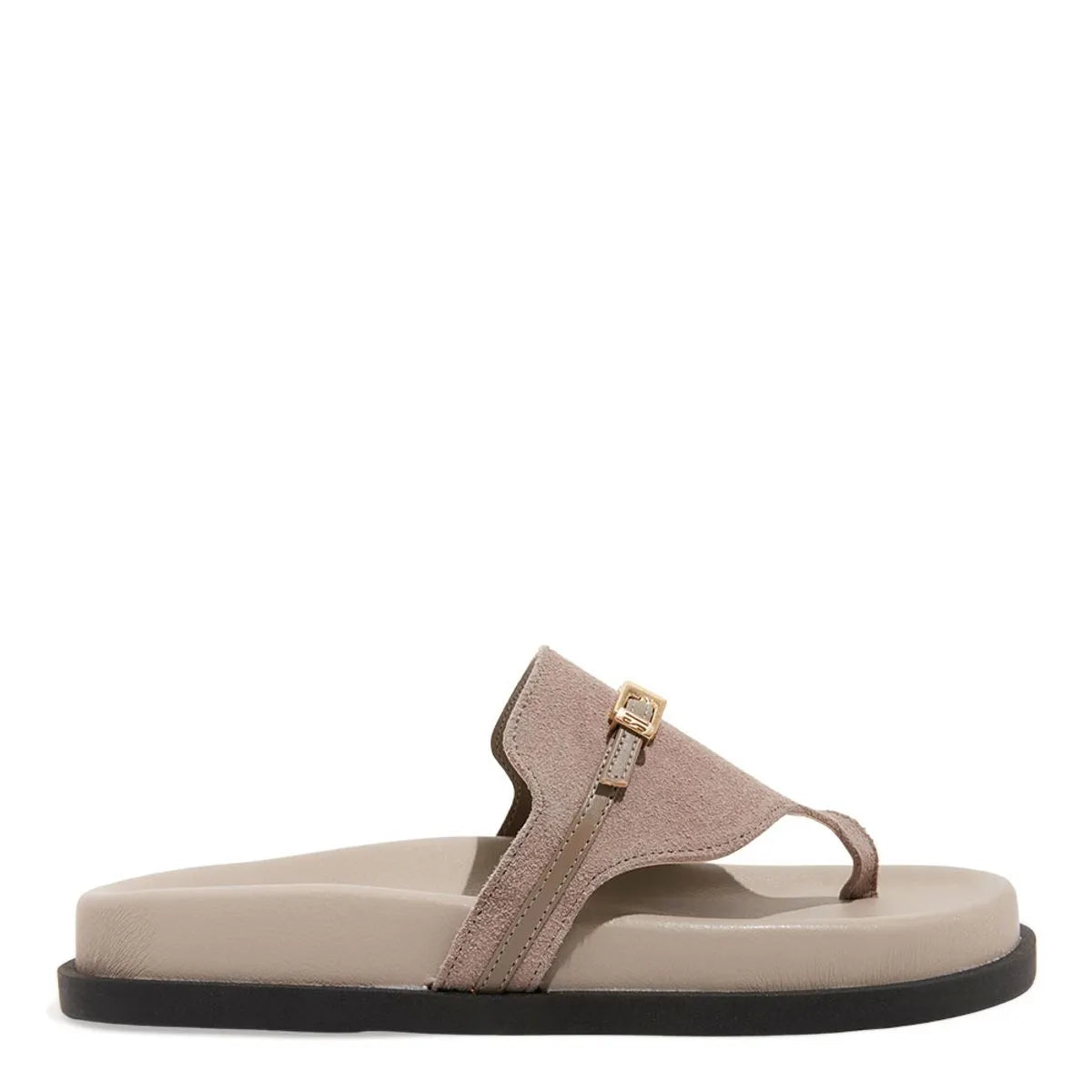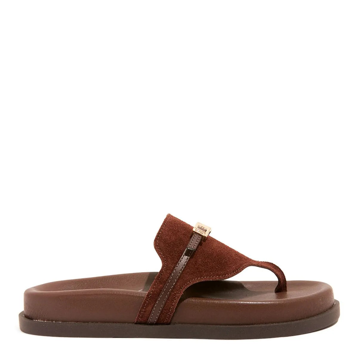 Papete confeccionado em couro camurça. Possui bico redondo, salto flat e tira dividindo os dedos, que proporciona uma estética única pela sua forma elegante e moderna.