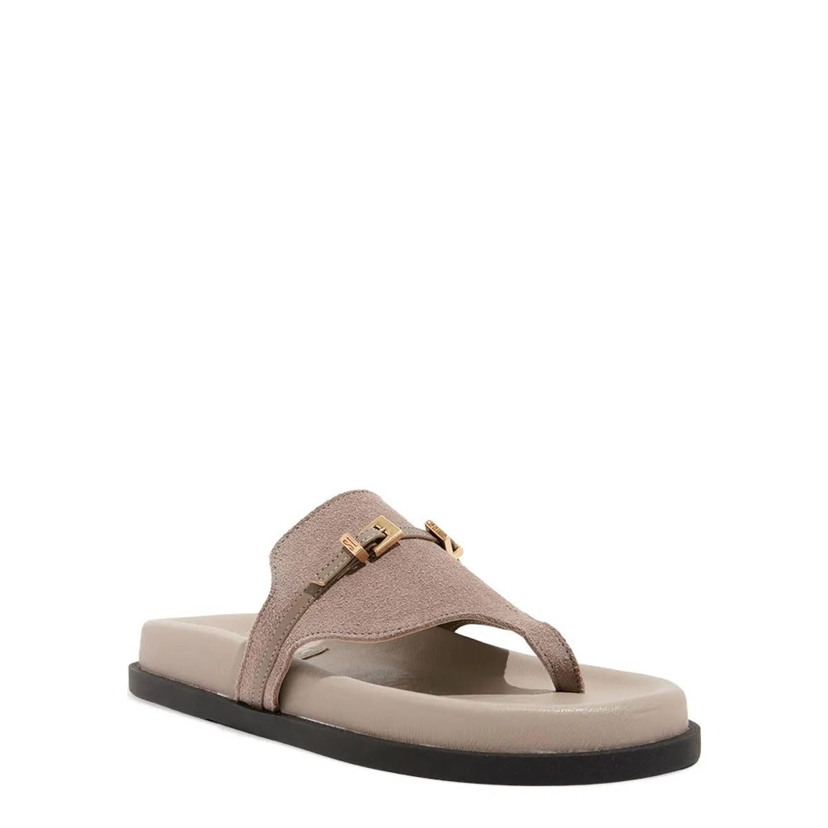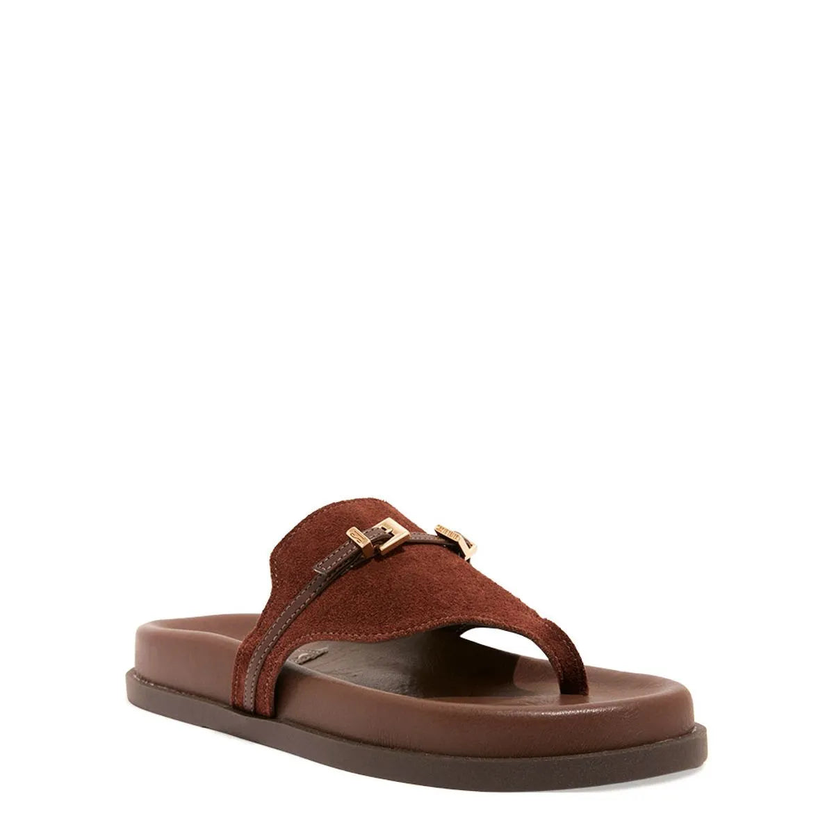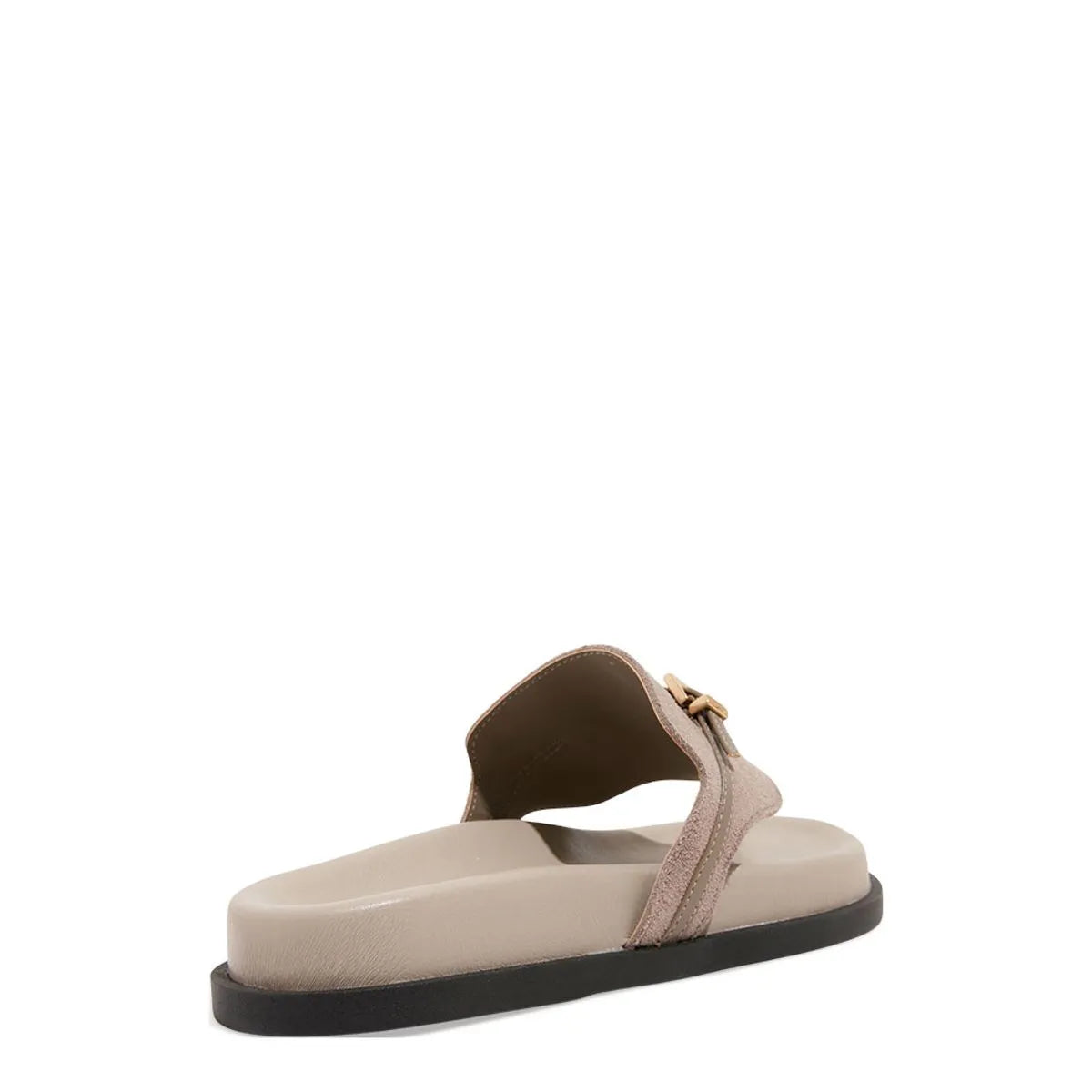 Papete confeccionado em couro camurça. Possui bico redondo, salto flat e tira dividindo os dedos, que proporciona uma estética única pela sua forma elegante e moderna.