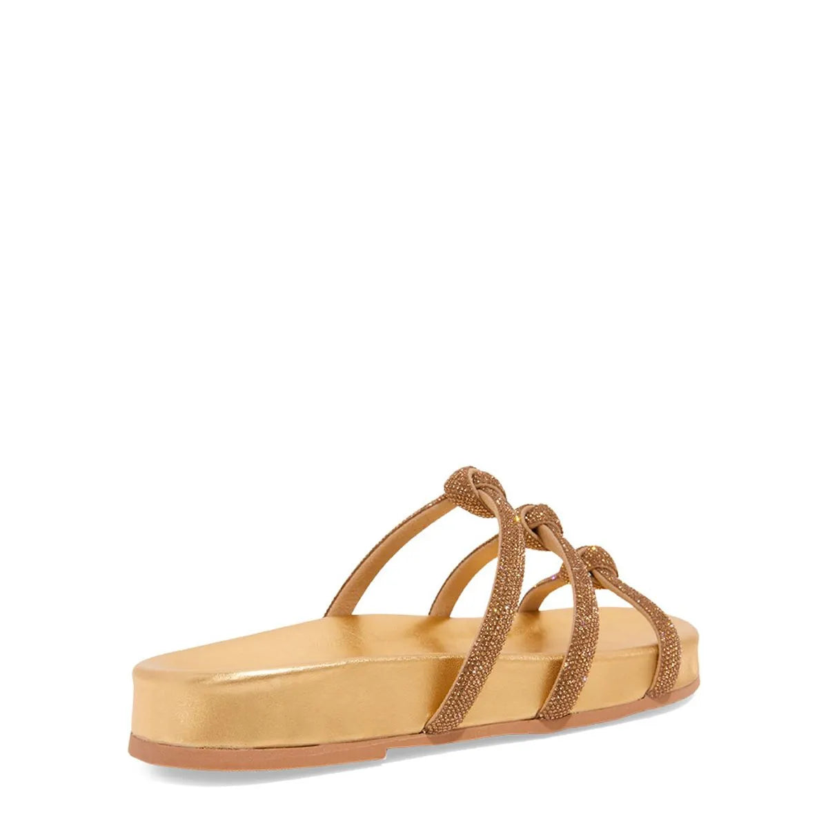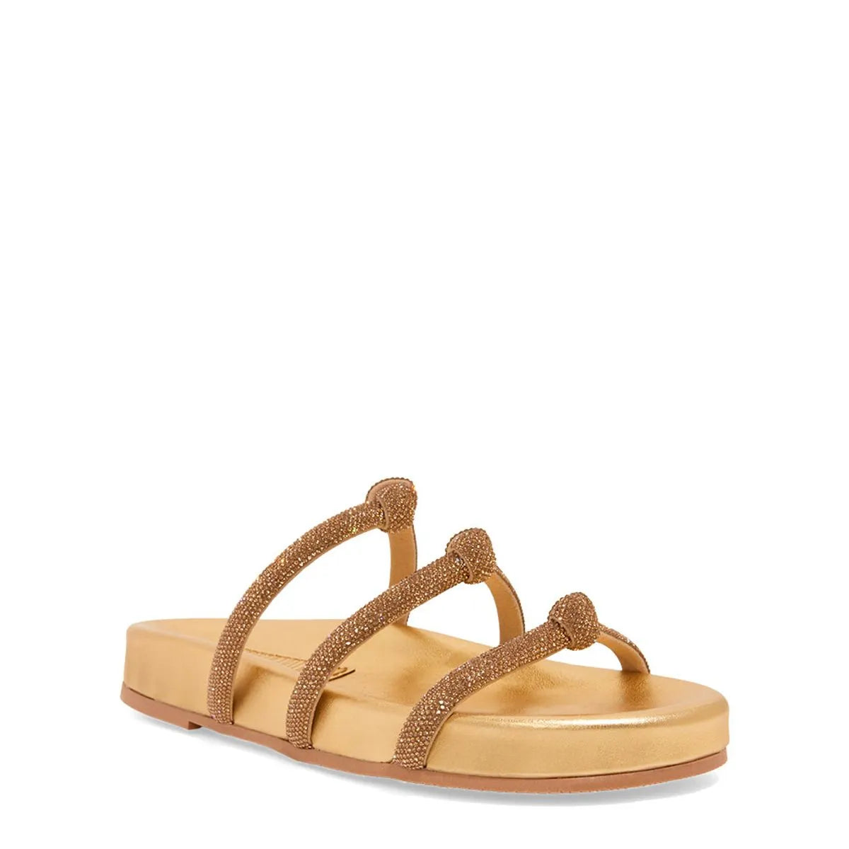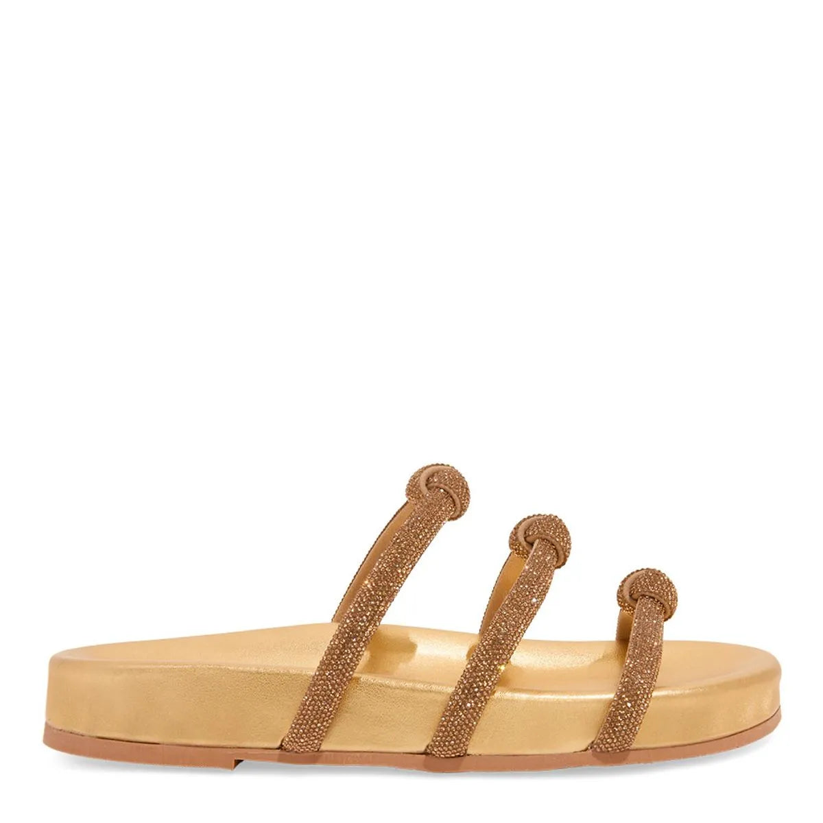 Papete metalizada confeccionada em material metallic soft. Possui salto flat, bico redondo e se destaca pelas tiras finas adornadas com brilhos em strass. Ideal para adicionar um toque de glamour a qualquer look.