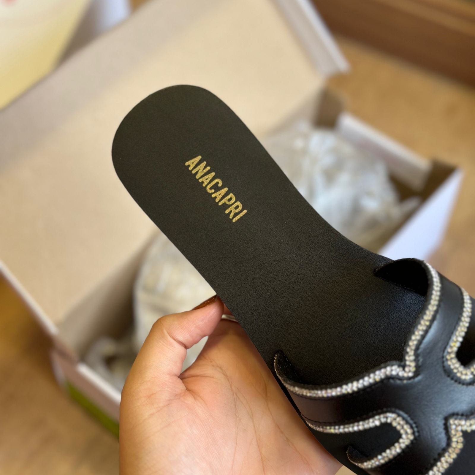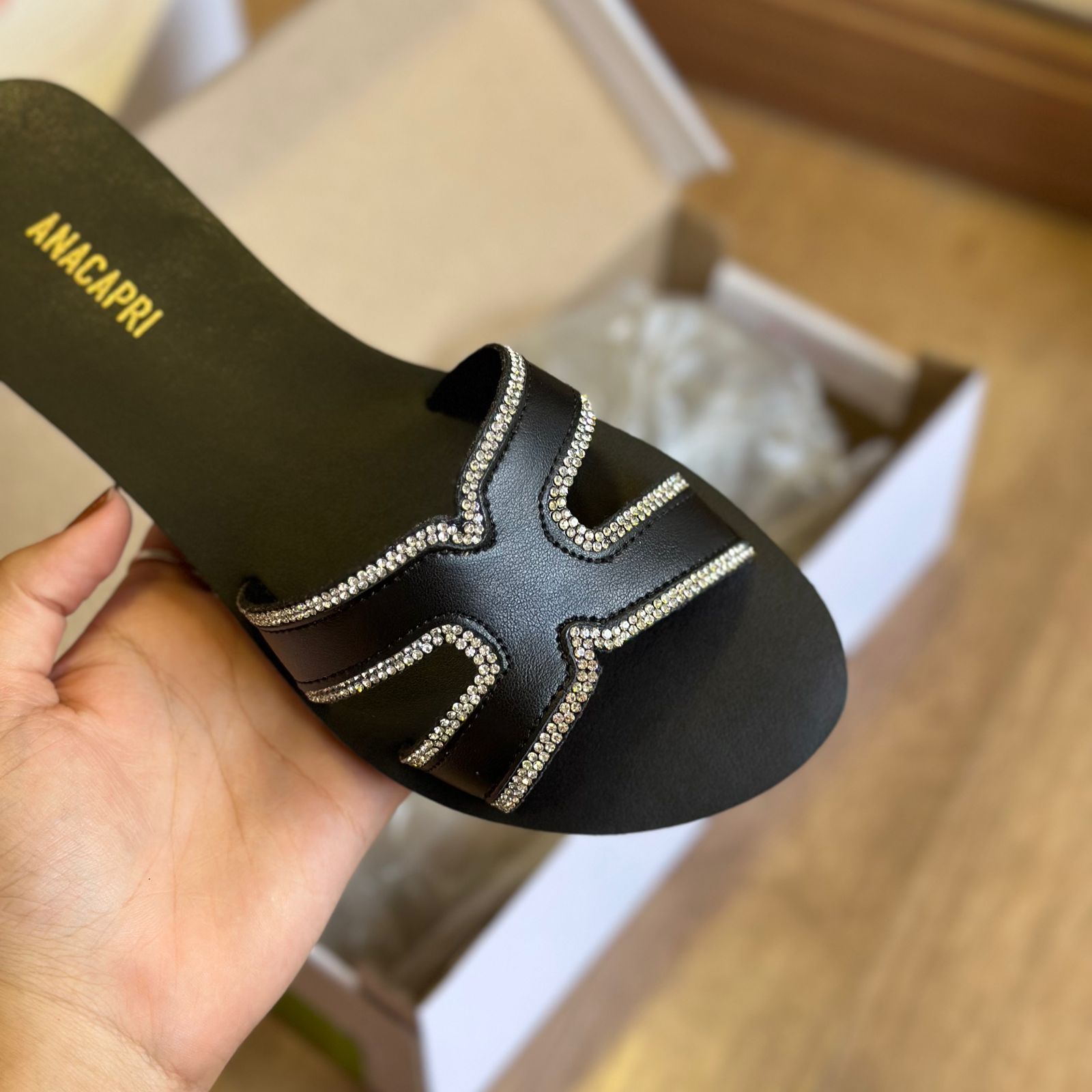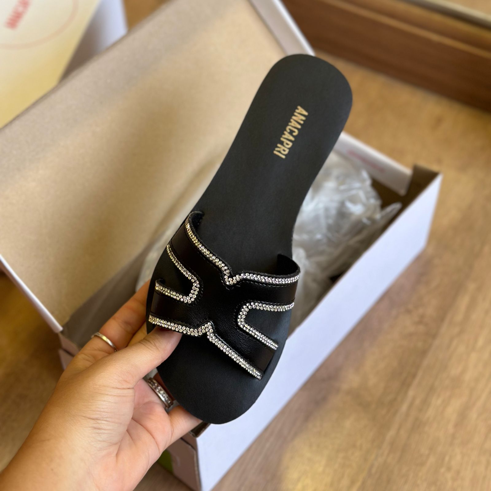 De material similar ao couro, o modelo tem solado rasteiro e bico arredondado. Traz cabedal com design de recortes em tiras vazadas formando um H, além de aplicação de manta com strass por todo o contorno. Aberta, o modelo possui palmilha de mesmo tom da rasteirinha, com assinatura Anacapri.