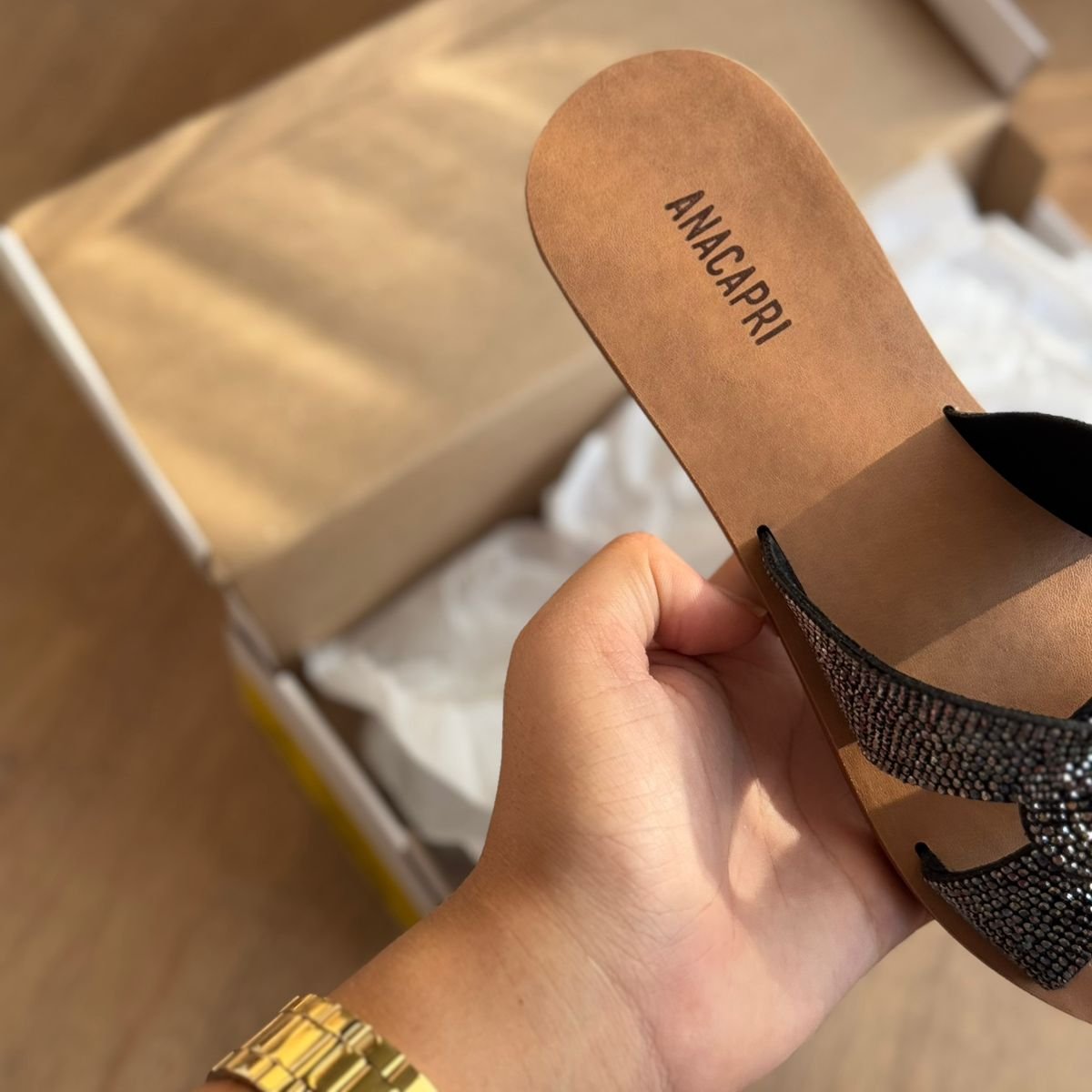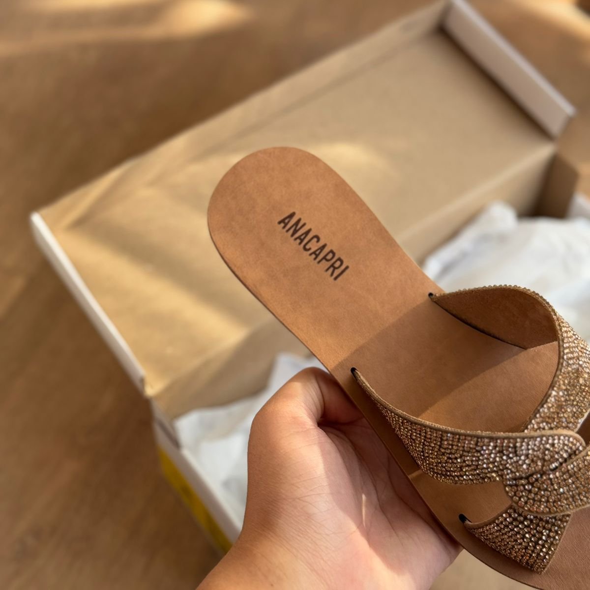 O modelo de solado rasteiro emborrachado com leve saltinho, apresenta cabedal imponente com duas tiras largas que se entrelaçam na lateral, cruzadas sobre os dedos e peito de pé, com aplicação de strass e glitter. Aberta, a rasteirinha traz palmilha nude, com assinatura Anacapri.