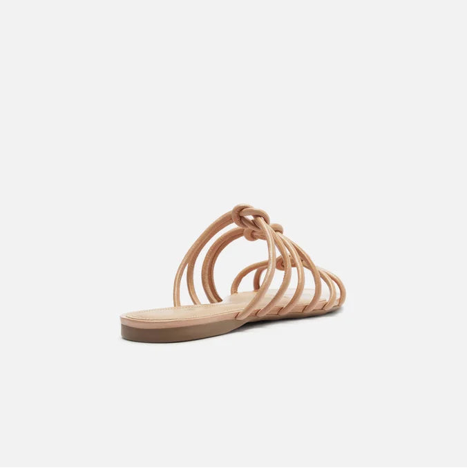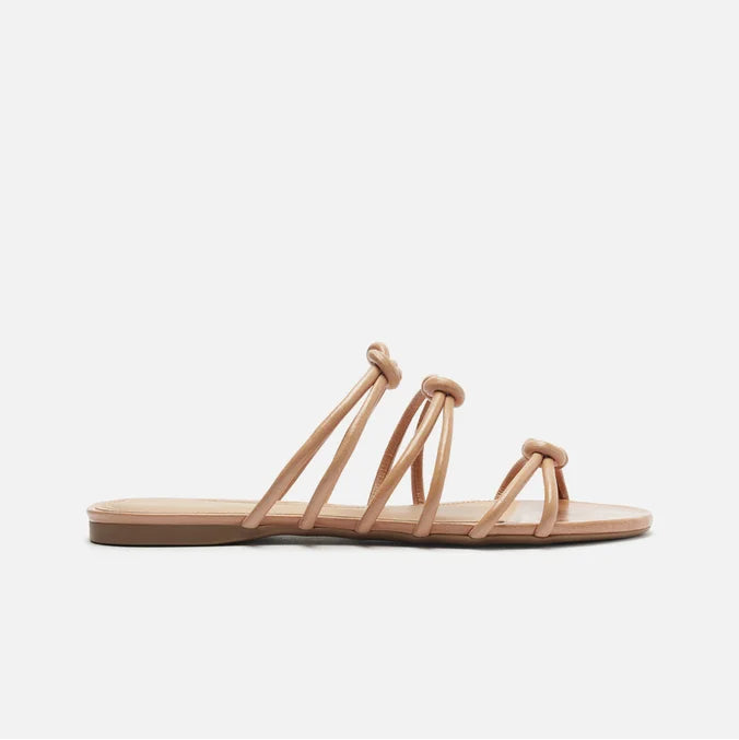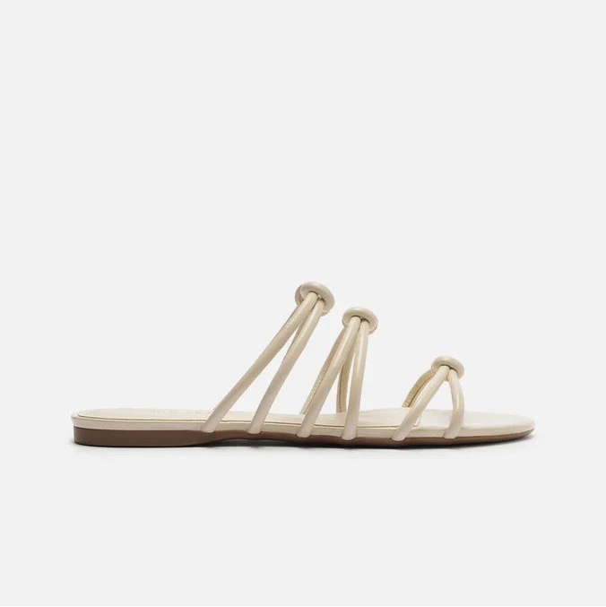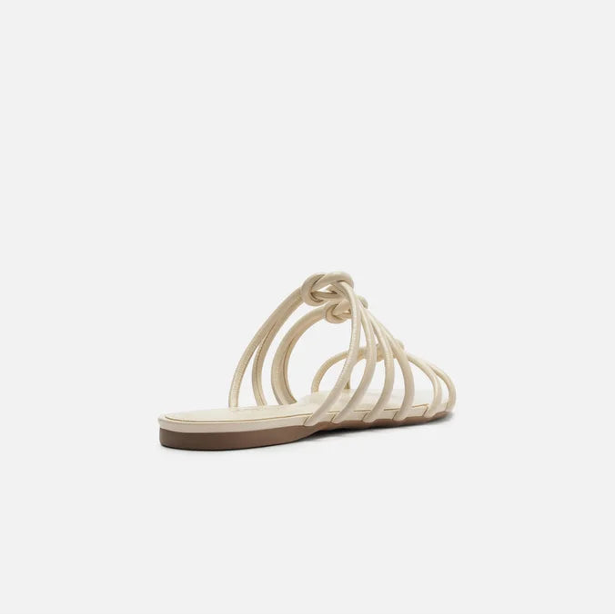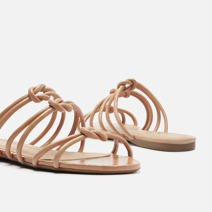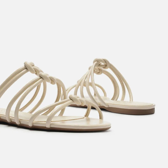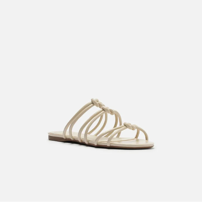 Descrição: O sapato tem sola flat e três duplas de tiras finas e destacadas, unidas por um nó no centro, sobre os dedos e a parte superior do pé. Com ponta redonda, é aberta e exibe todo o pé. Com palmilha bege e inscrição do nome da marca.