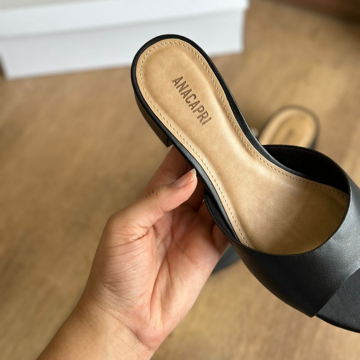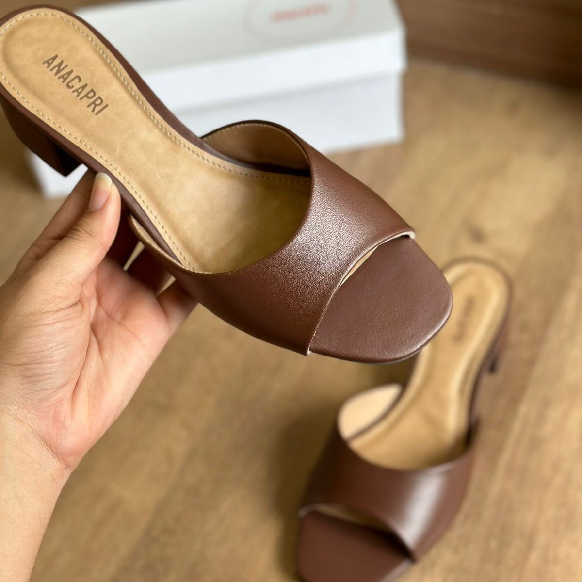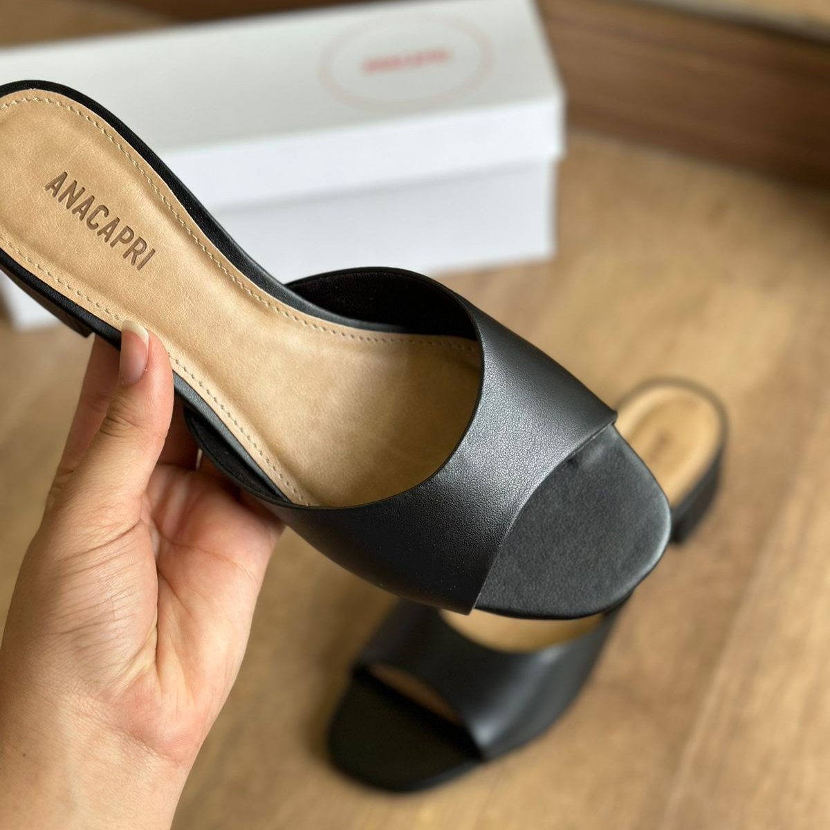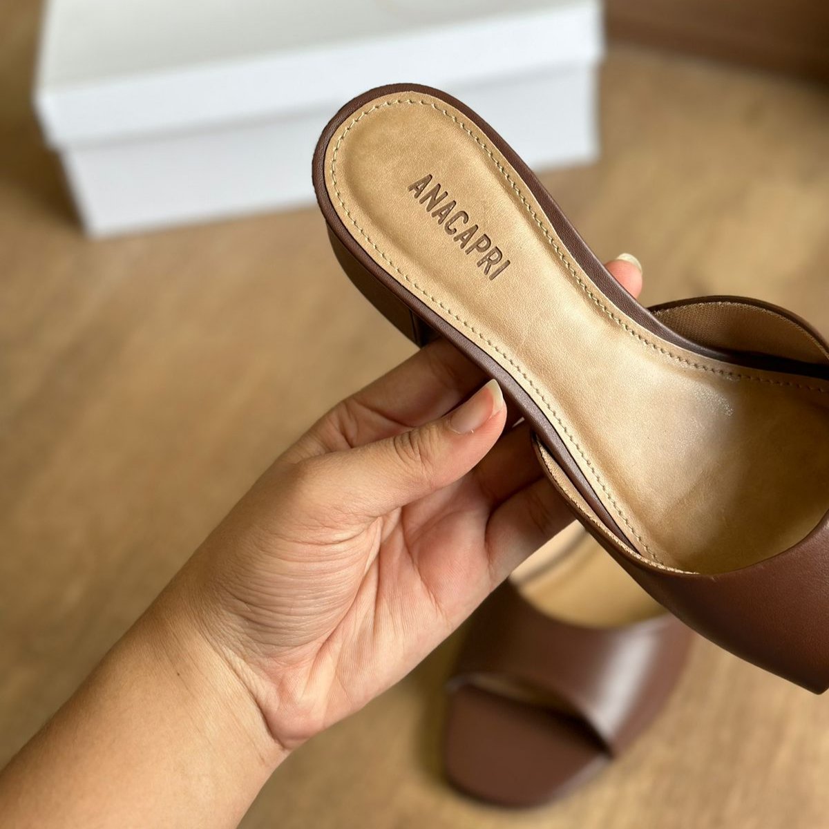 O modelo apresenta salto em bloco e bico redondo. Com tira mais larga com recorte imponente sobre os dedos e peito de pé. Traz palmilha nude com contorno em pespontos e assinatura Anacapri. Aberta, a sandália exibe parte do pé.