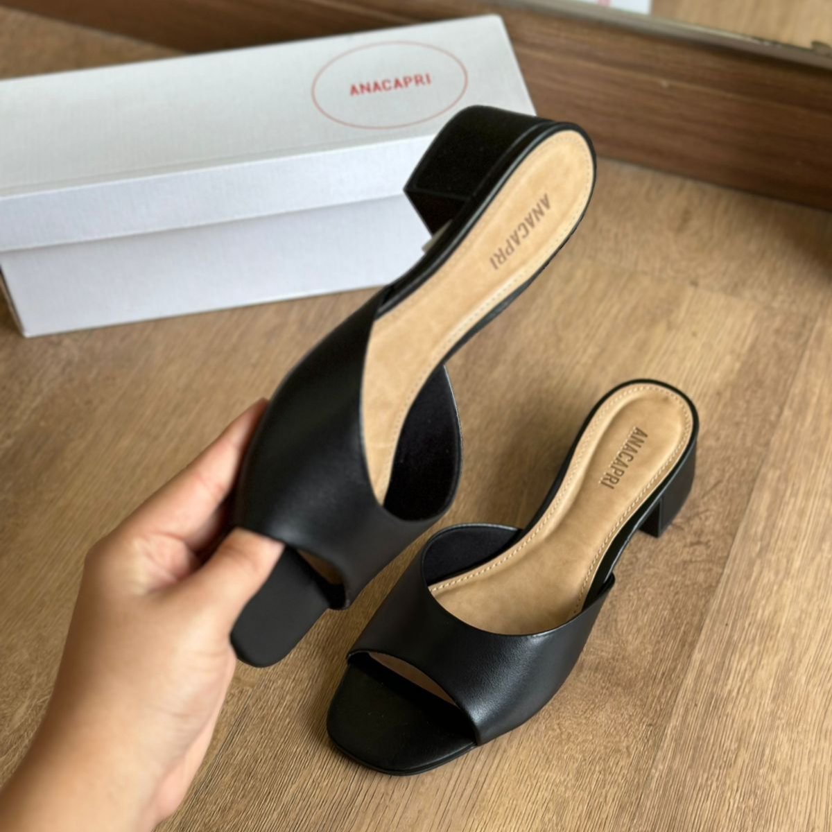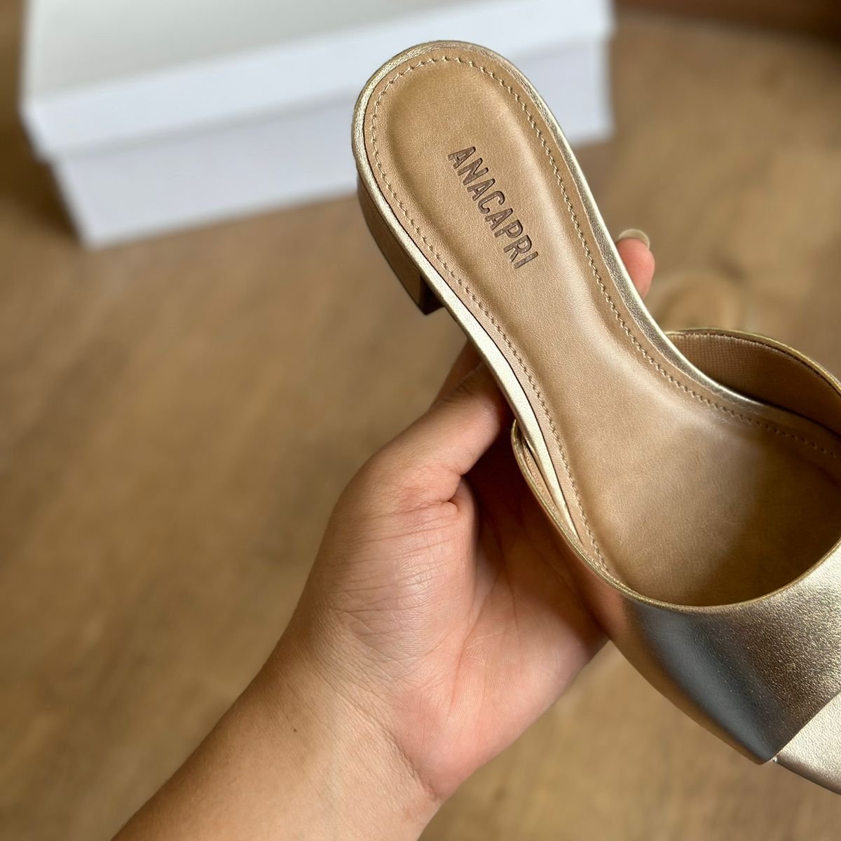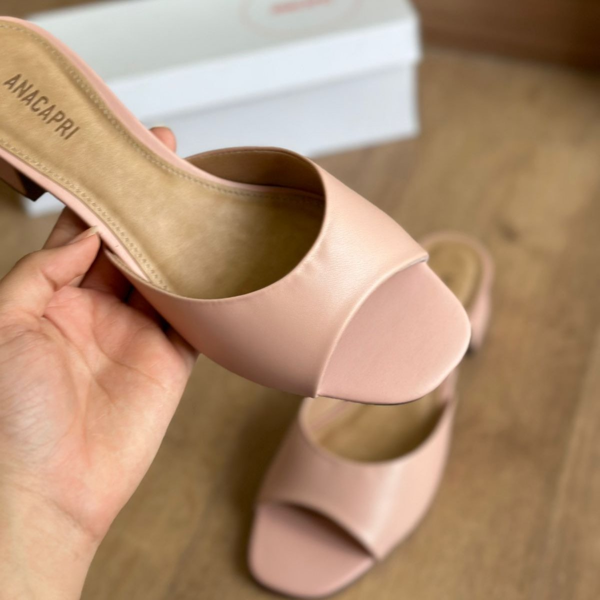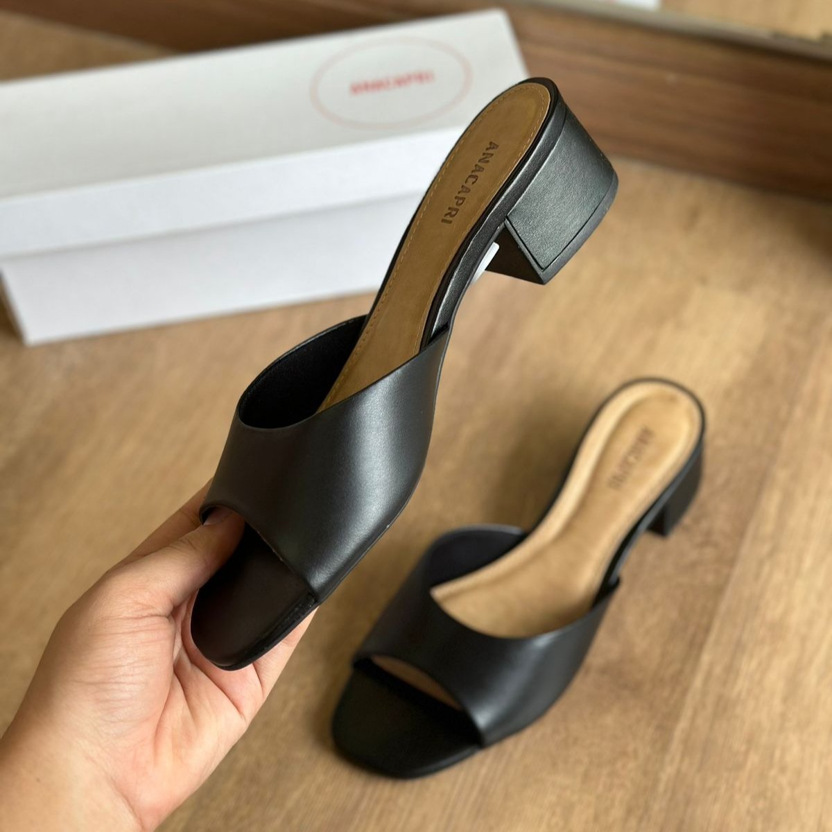 O modelo apresenta salto em bloco e bico redondo. Com tira mais larga com recorte imponente sobre os dedos e peito de pé. Traz palmilha nude com contorno em pespontos e assinatura Anacapri. Aberta, a sandália exibe parte do pé.