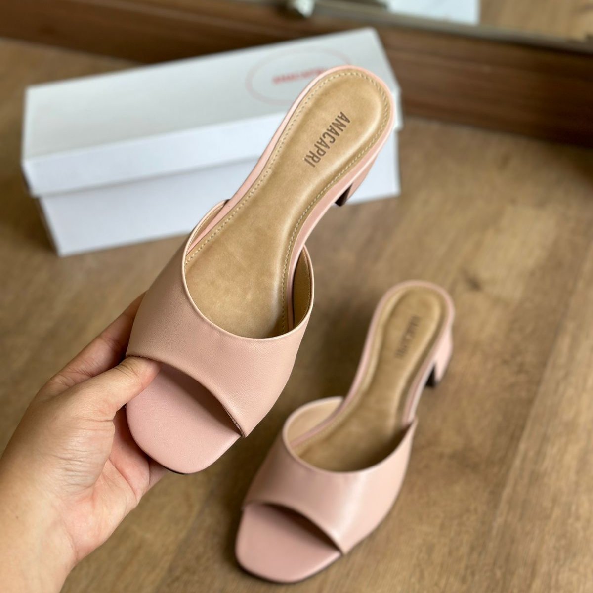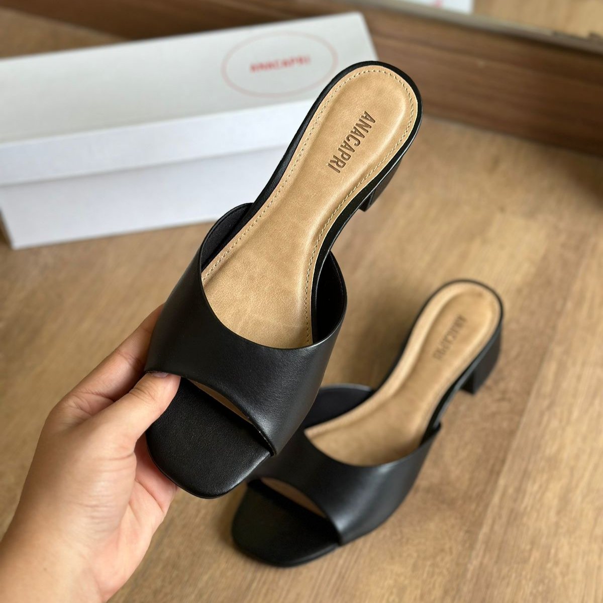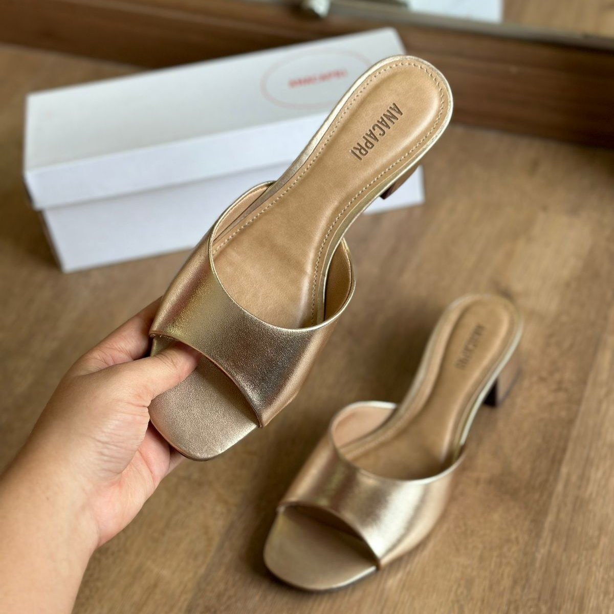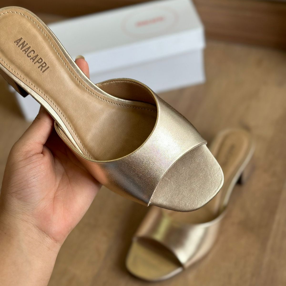 O modelo apresenta salto em bloco e bico redondo. Com tira mais larga com recorte imponente sobre os dedos e peito de pé. Traz palmilha nude com contorno em pespontos e assinatura Anacapri. Aberta, a sandália exibe parte do pé.