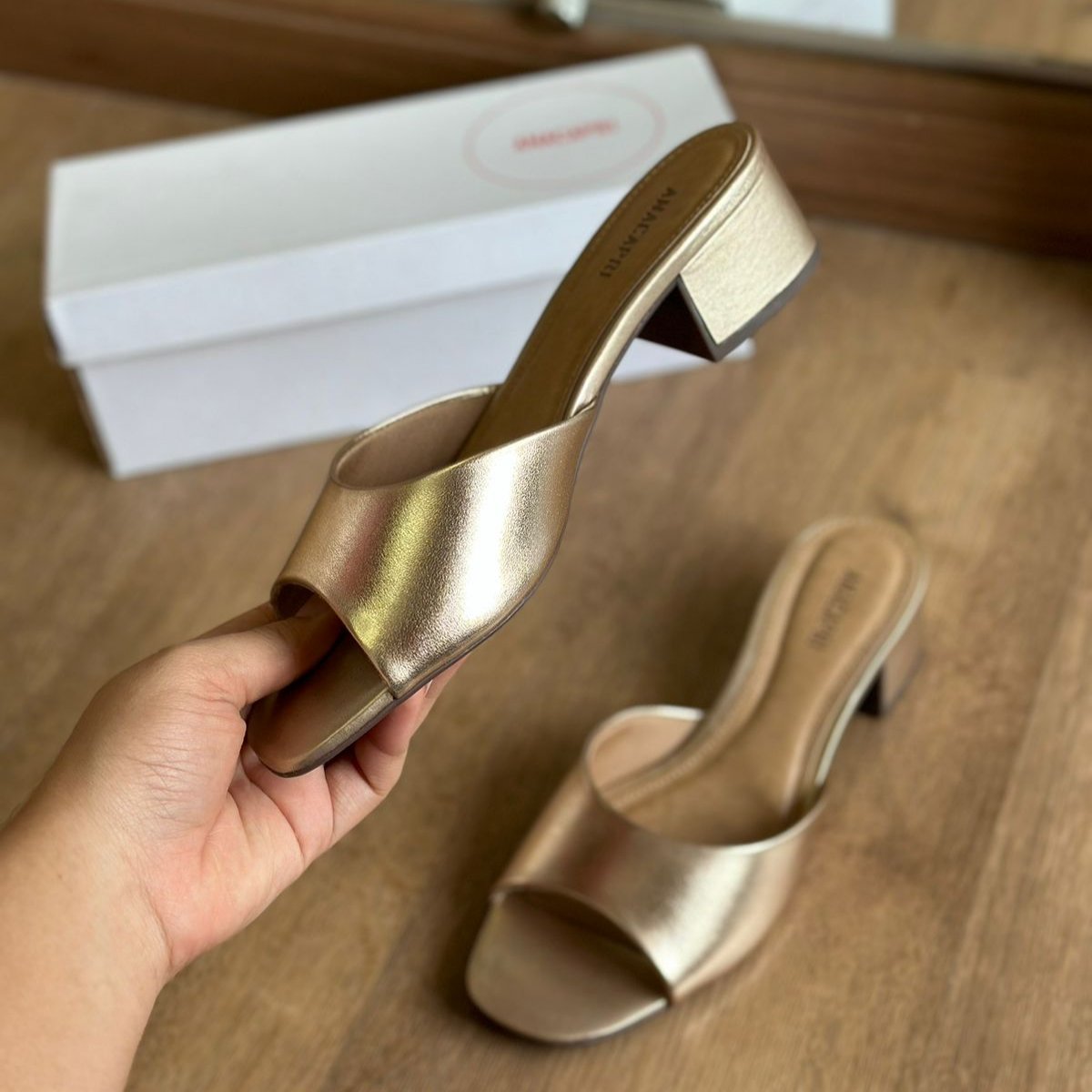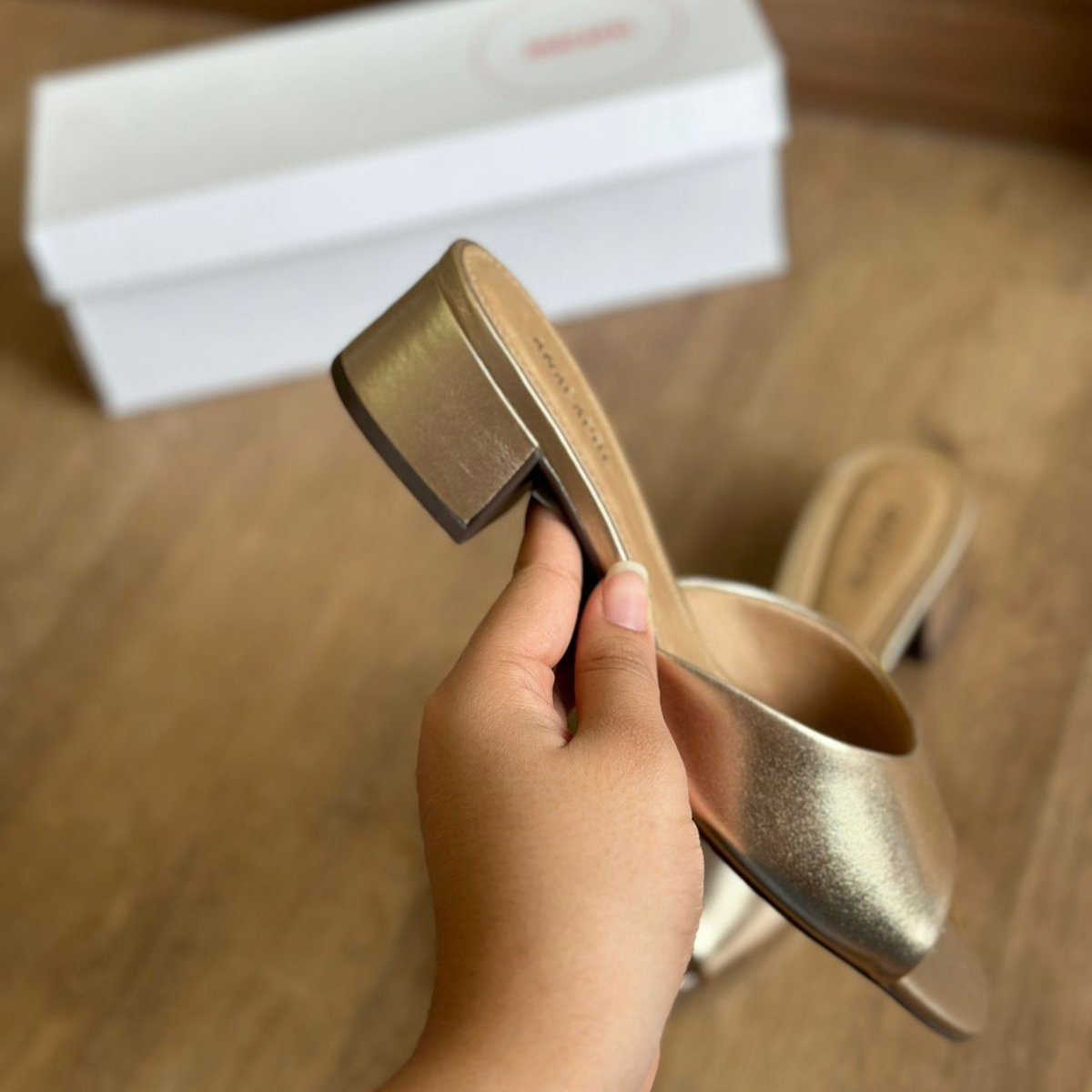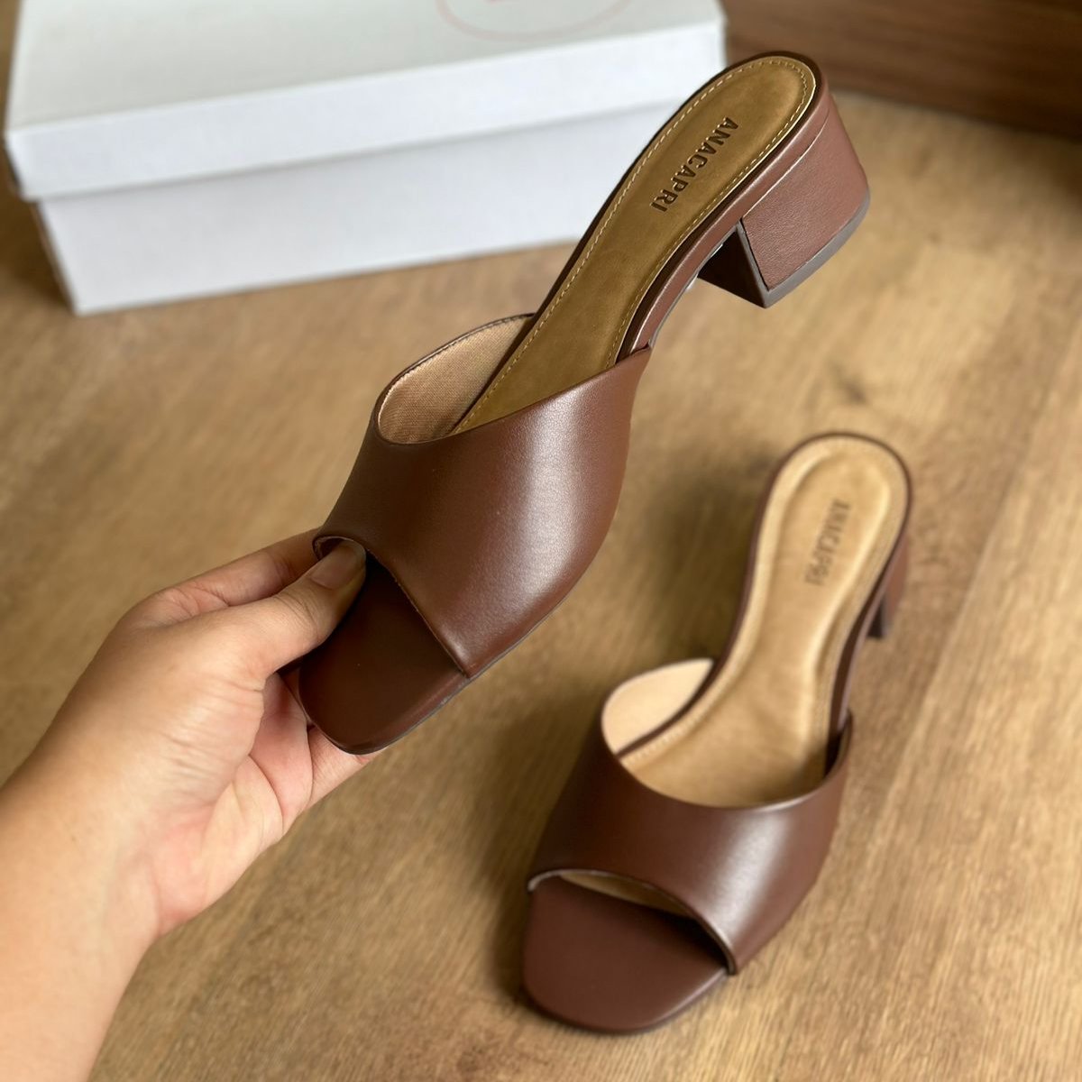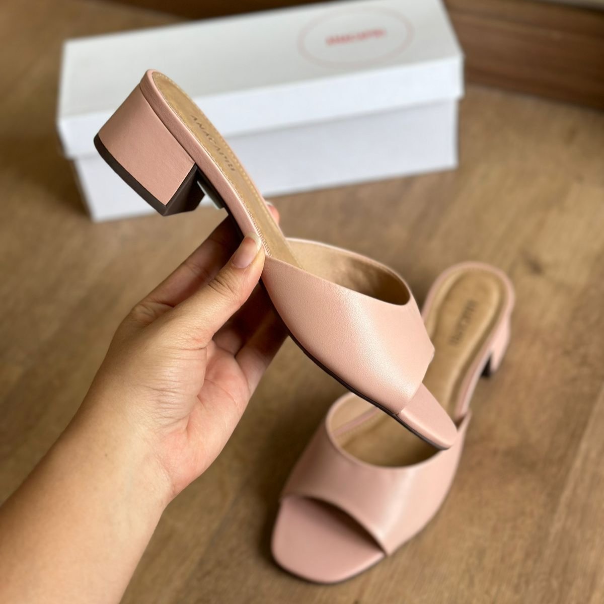 O modelo apresenta salto em bloco e bico redondo. Com tira mais larga com recorte imponente sobre os dedos e peito de pé. Traz palmilha nude com contorno em pespontos e assinatura Anacapri. Aberta, a sandália exibe parte do pé.