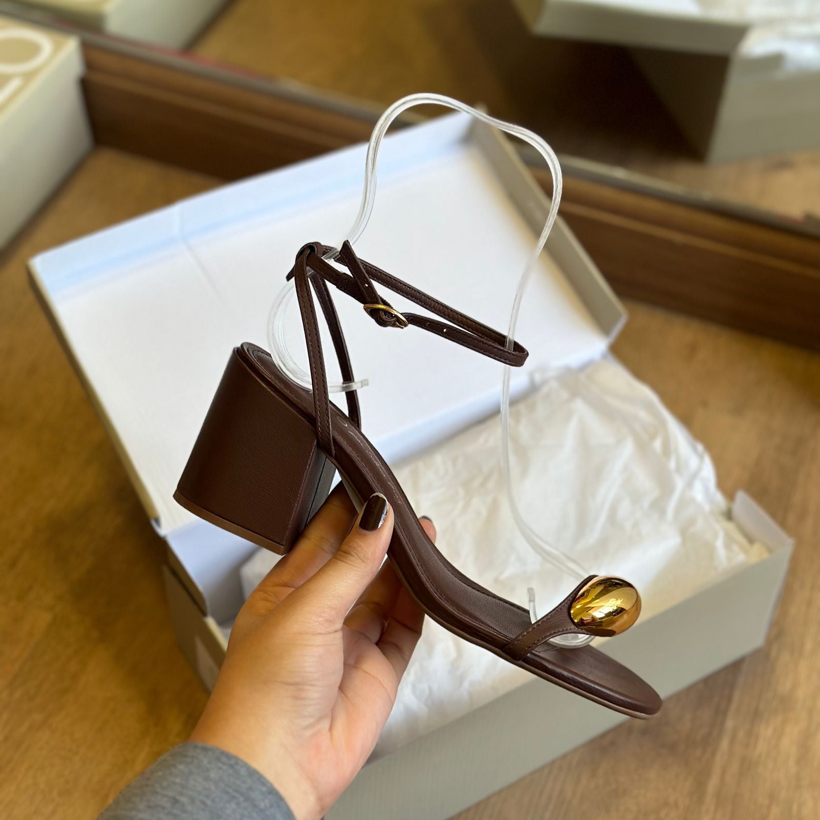 Descrição: O sapato tem salto médio bloco e formato arredondado na ponta. Traz tira sobre os dedos com aplicação de metal dourado, espesso e orgânico. Possui tira fina que sai das laterais, se cruza no calcanhar, contorna o tornozelo e fecha em fivela lateral. Com palmilha da cor da sandália e inscrição do nome da marca. A sandália exibe todo o pé.