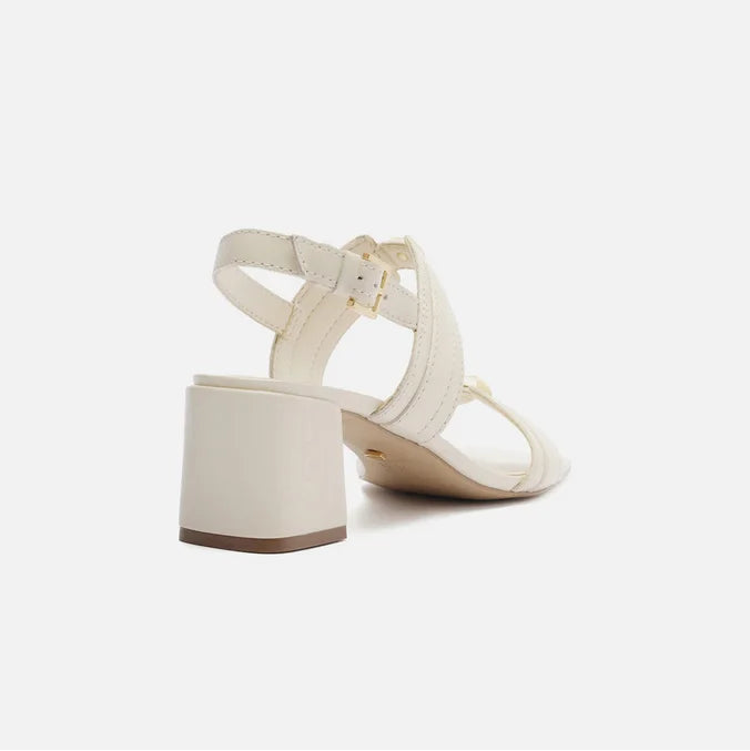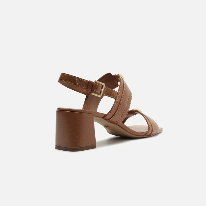 Descrição: O sapato tem salto médio bloco e formato quadrado na ponta. Traz tiras médias sobre os dedos e na parte superior do pé recortadas, conectadas por tira fina e com aplicação de tacha no centro. Possui ainda tira no calcanhar que fecha em fivela lateral. Com palmilha da cor da sandália e inscrição do nome da marca.