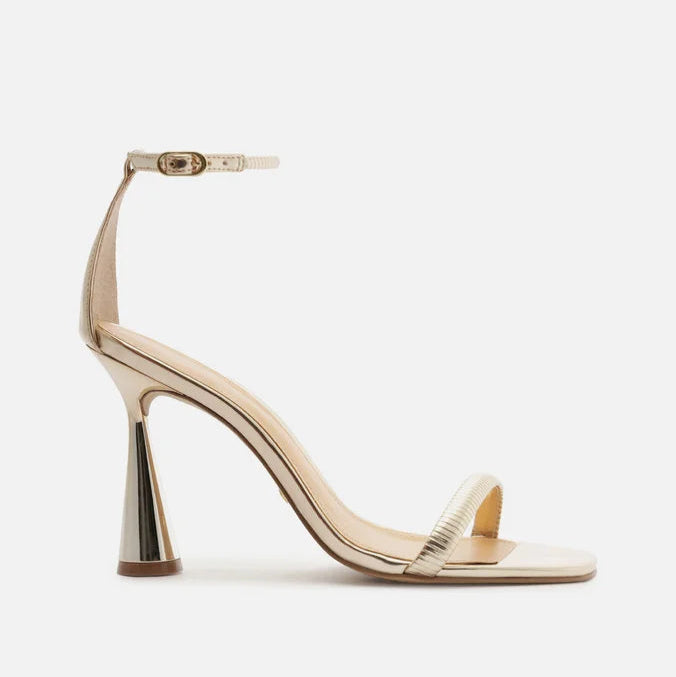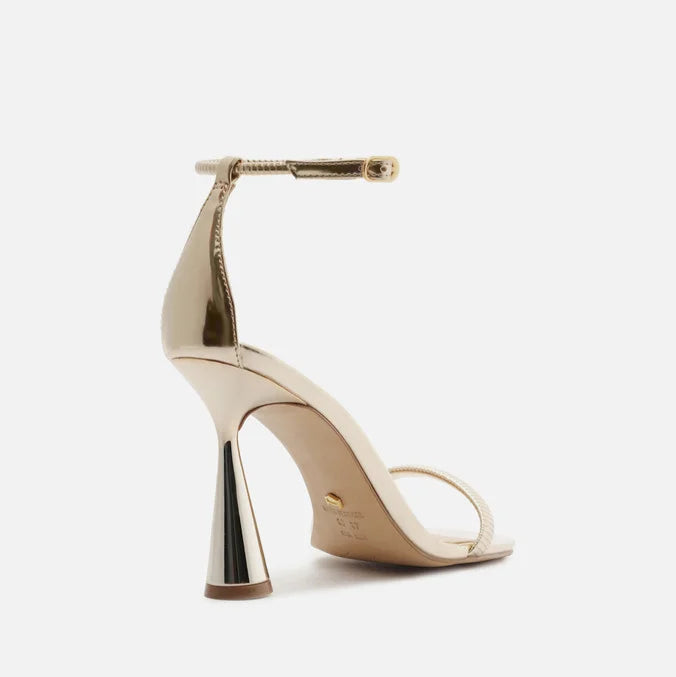 Descrição: O sapato tem salto alto metalizado, dourado e em forma de ampulheta. Traz formato quadrado na ponta e tira com textura sobre os dedos. Fechada no calcanhar, possui tira fina em torno do tornozelo com fivela metálica lateral. Com palmilha bege e inscrição do nome da marca.