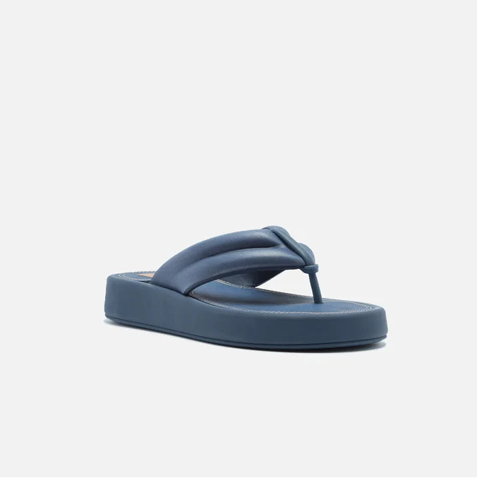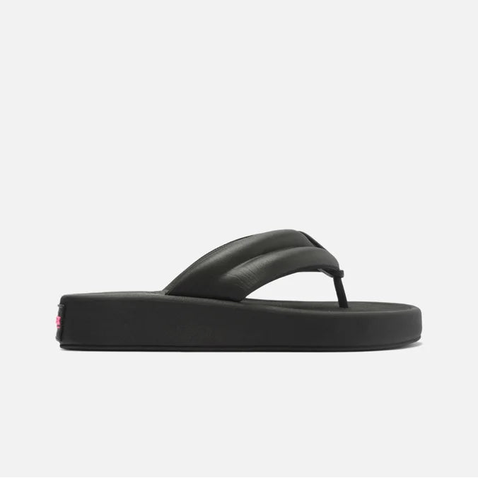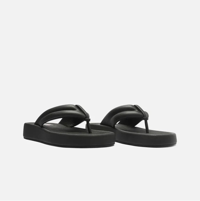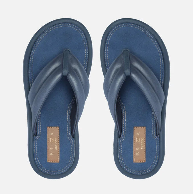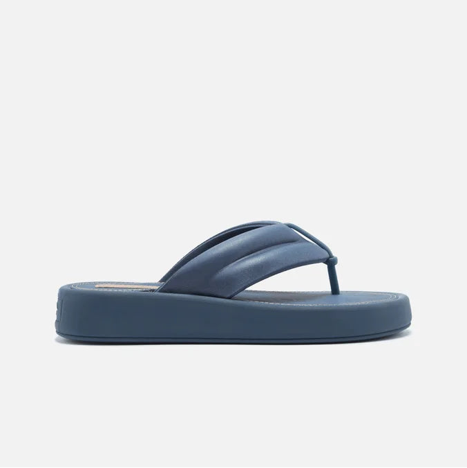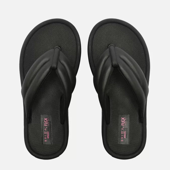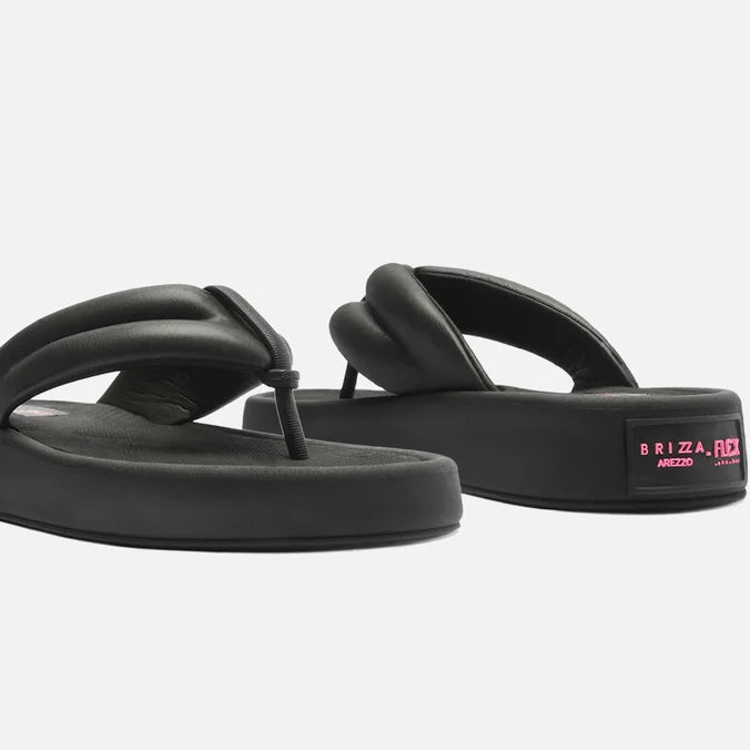 Descrição: O modelo tem salto baixo, palmilha texturizada em EVA e com tag Brizza + Flex. Possui solado flatform em PVC e bico redondo. Traz tiras largas de EVA dividindo os dedos e com efeito estofado. Exibe todo o pé.