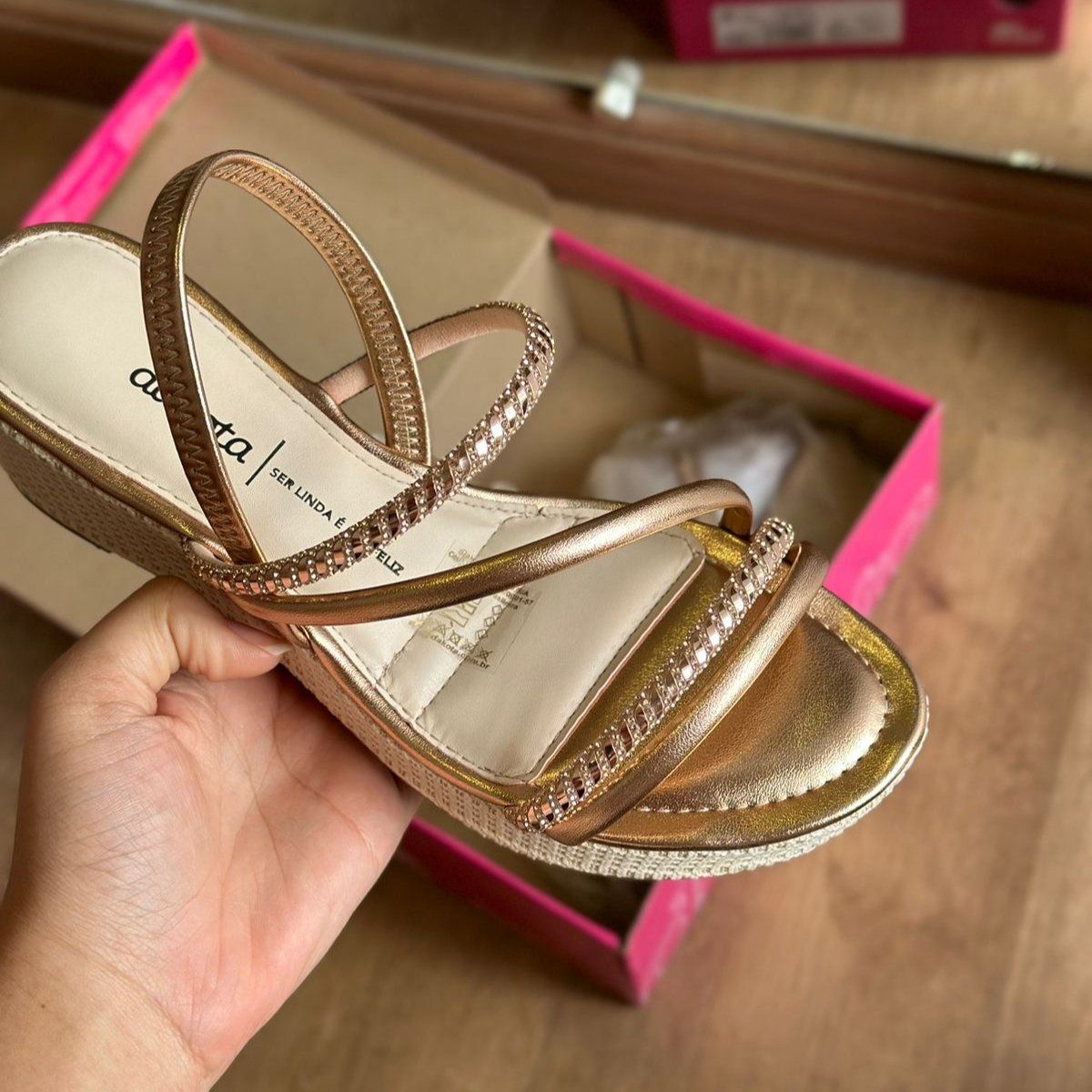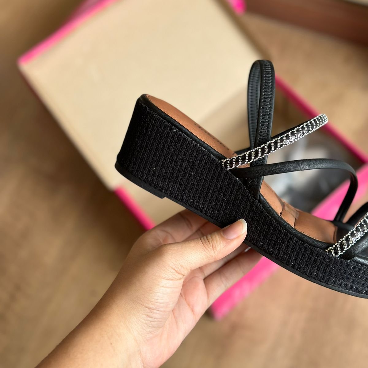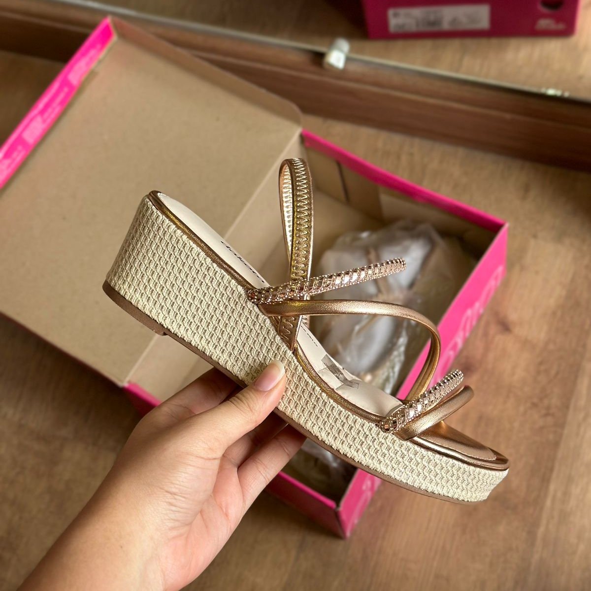 O destaque desse modelo fica por conta das tiras finas e macias que envolvem os pés, proporcionando um ajuste perfeito e seguro, além do calce fácil graças à tira maleável e sem fechamentos que envolve o calcanhar. As tiras com brilhos adicionam um toque de sofisticação e modernidade ao calçado, tornando-o perfeito para diversas ocasiões, desde um passeio casual até um look mais elaborado. O revestimento artesanal no salto anabela confere um toque único e especial ao calçado, além de garantir durabilidade e resistência. Com seu peso leve de apenas 0,721 kg e altura do salto de 5,80 cm, ela é a opção ideal para quem busca conforto e estilo sem abrir mão da praticidade.