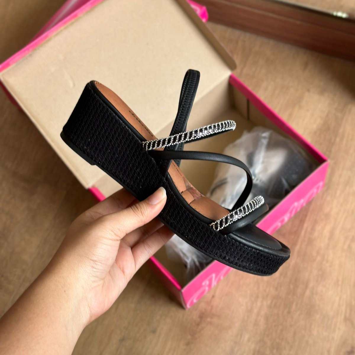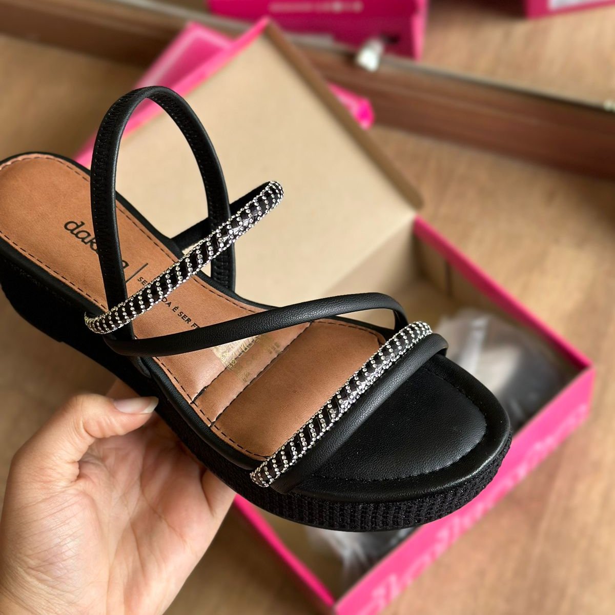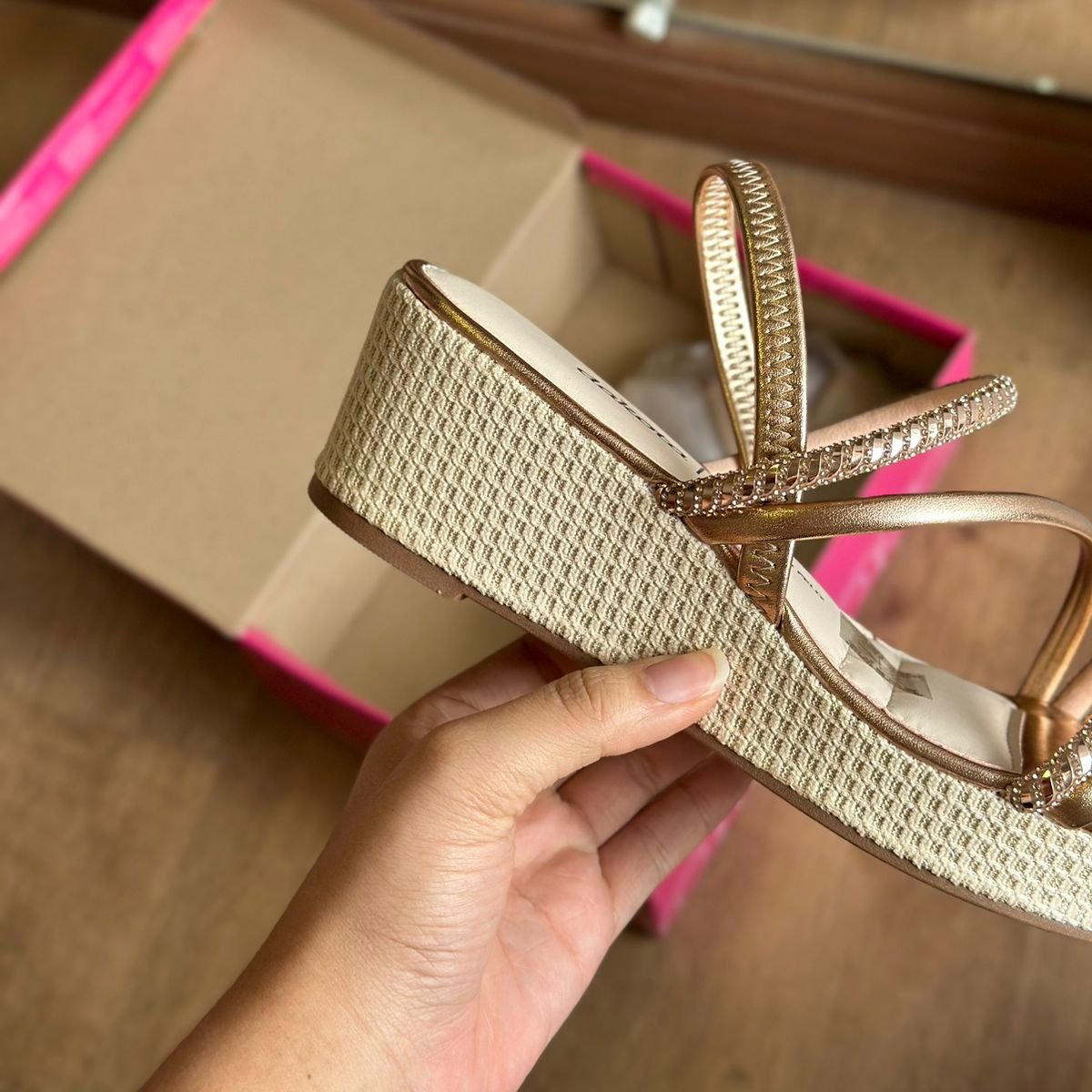 O destaque desse modelo fica por conta das tiras finas e macias que envolvem os pés, proporcionando um ajuste perfeito e seguro, além do calce fácil graças à tira maleável e sem fechamentos que envolve o calcanhar. As tiras com brilhos adicionam um toque de sofisticação e modernidade ao calçado, tornando-o perfeito para diversas ocasiões, desde um passeio casual até um look mais elaborado. O revestimento artesanal no salto anabela confere um toque único e especial ao calçado, além de garantir durabilidade e resistência. Com seu peso leve de apenas 0,721 kg e altura do salto de 5,80 cm, ela é a opção ideal para quem busca conforto e estilo sem abrir mão da praticidade.