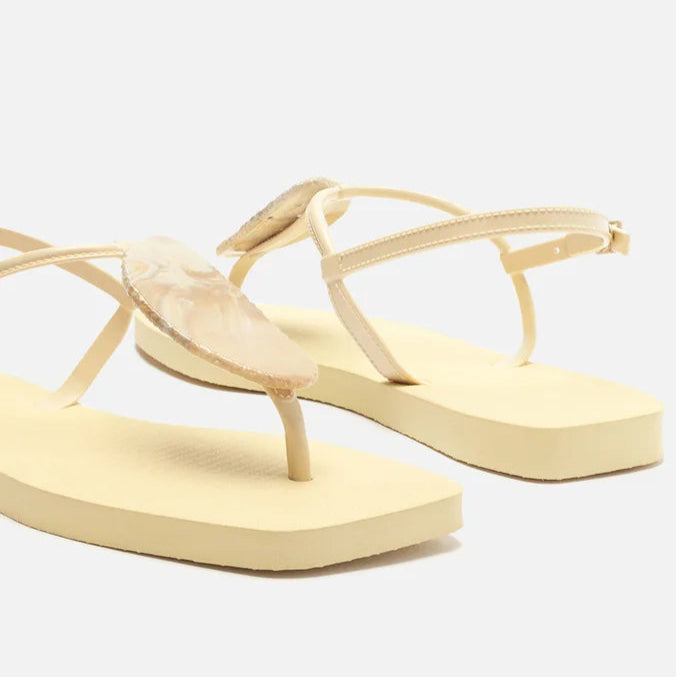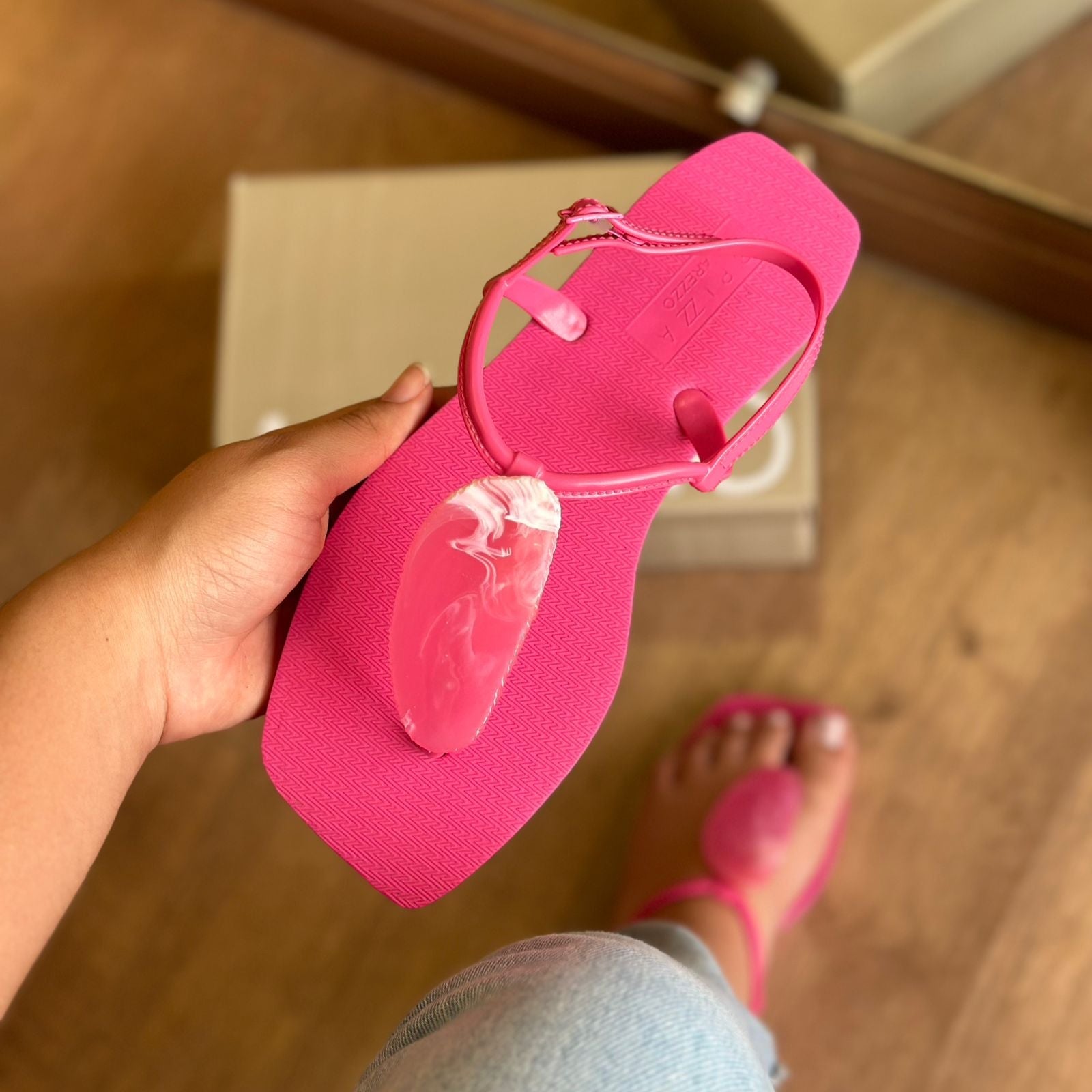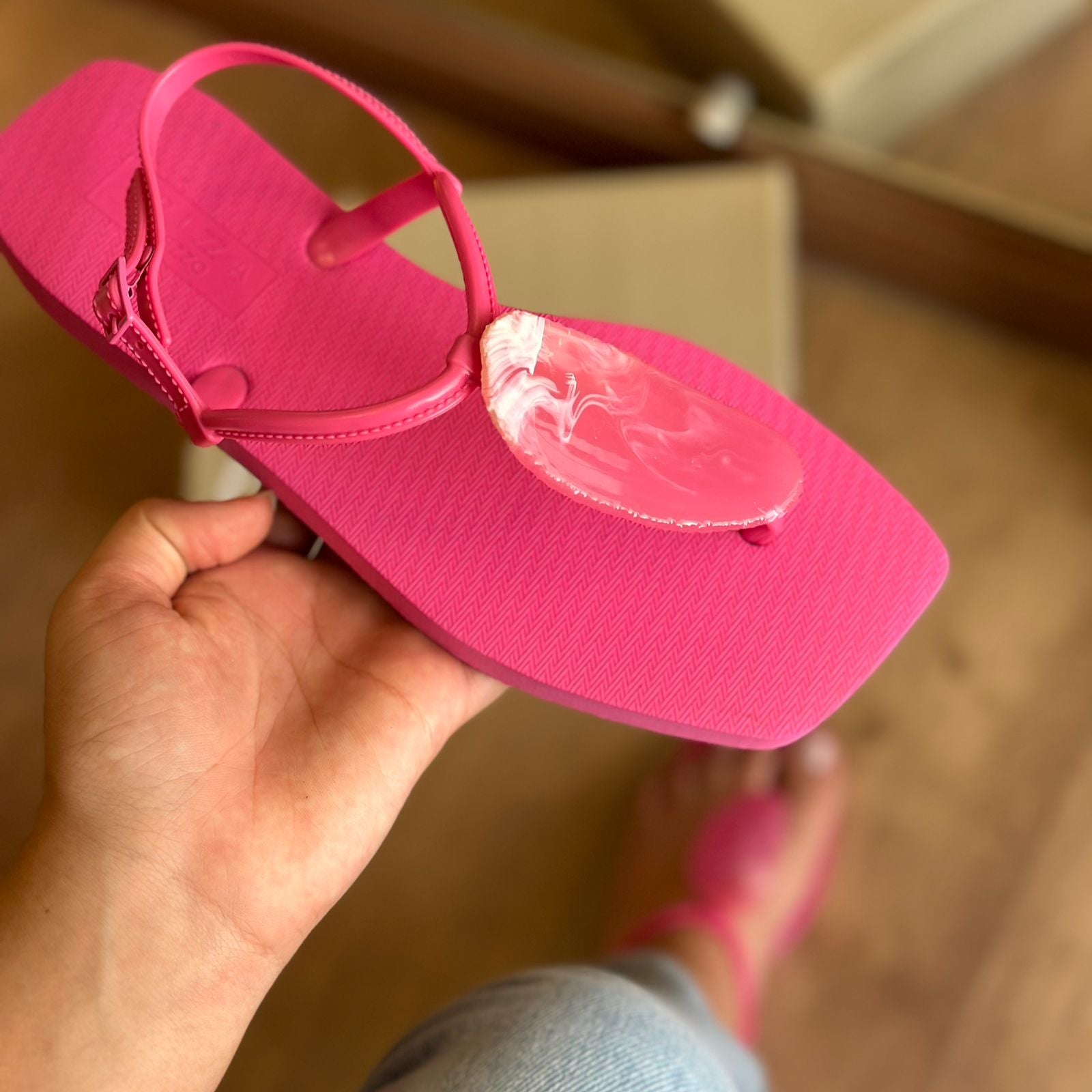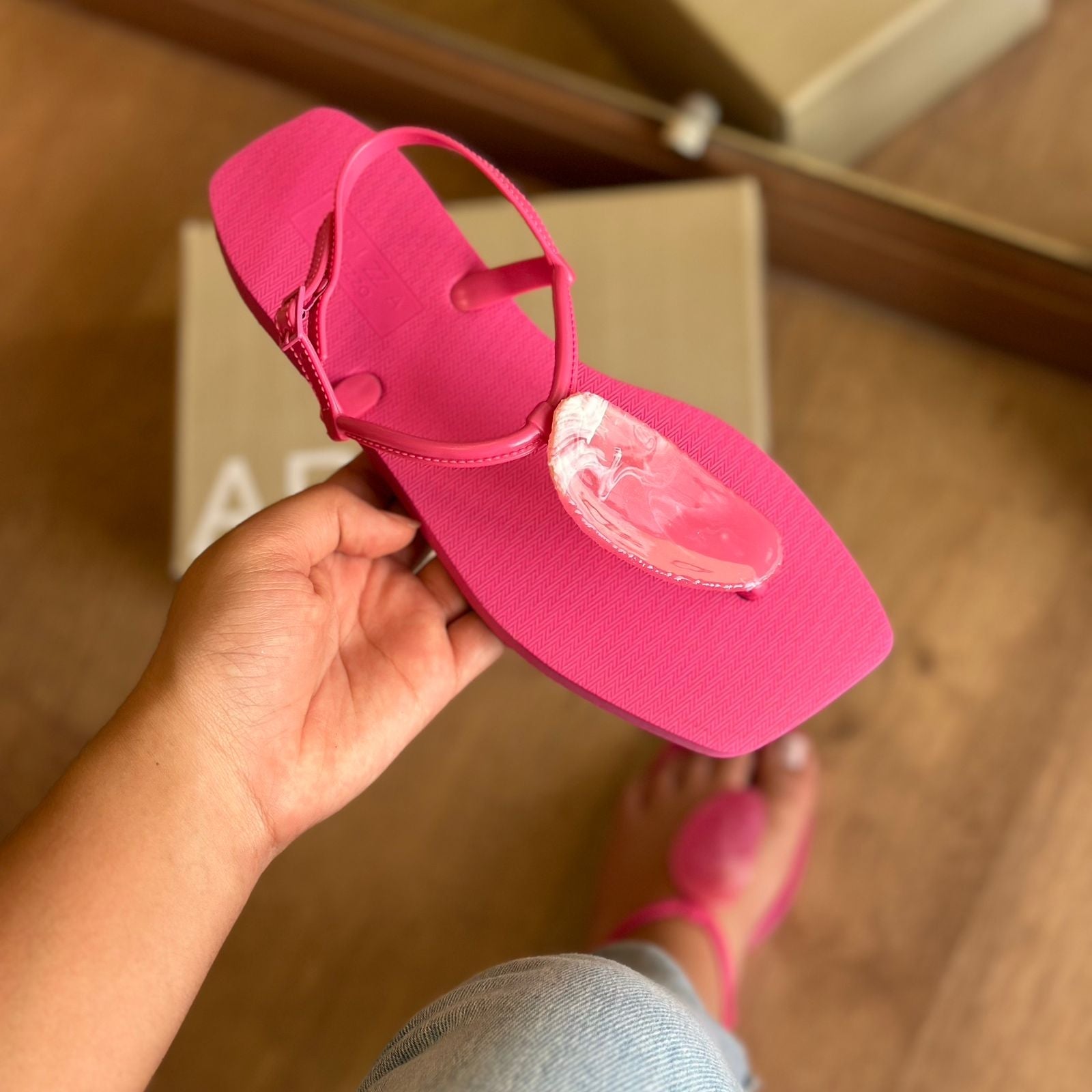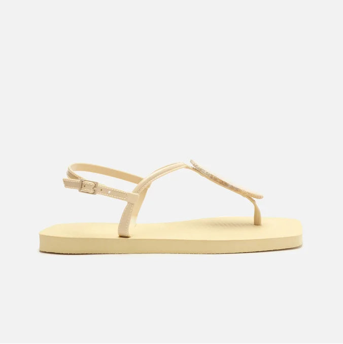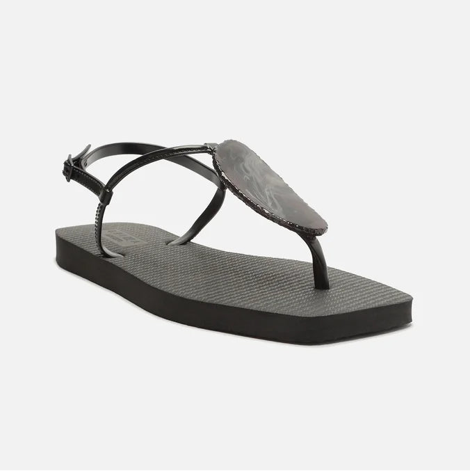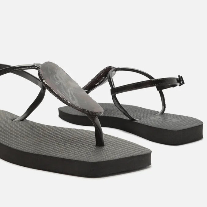 Descrição: O modelo slim tem sola flat emborrachada e palmilha texturizada com inscrição do nome da marca. De bico quadrado, traz tira fina injetada que passa entre os dedos, com aplicação de pedra grande e conectada a mais uma tira fina no peito do pé. Possui ainda tira fina em torno do calcanhar com fecho em fivela metálica lateral. Deixa todo o pé à mostra.