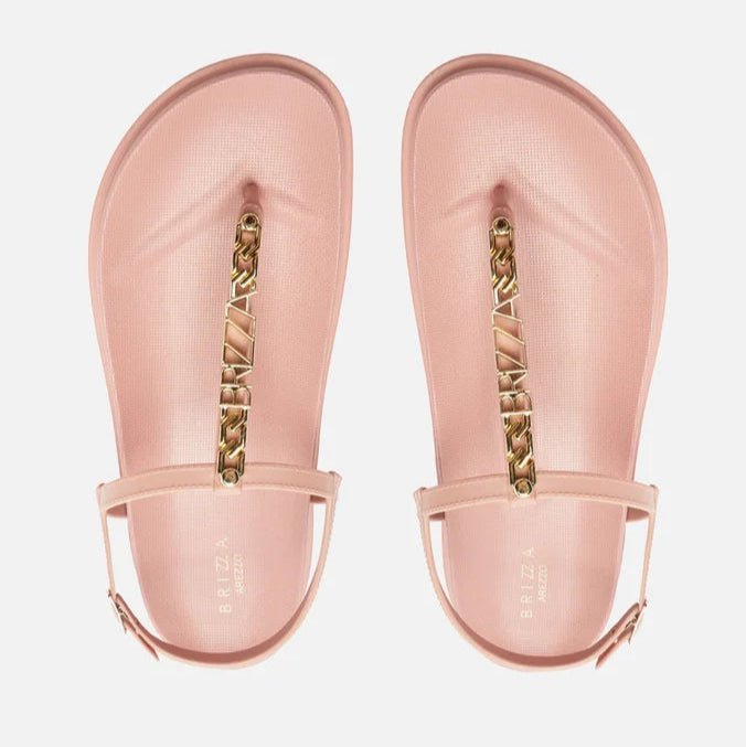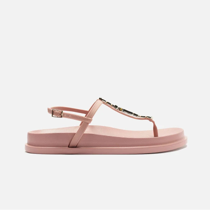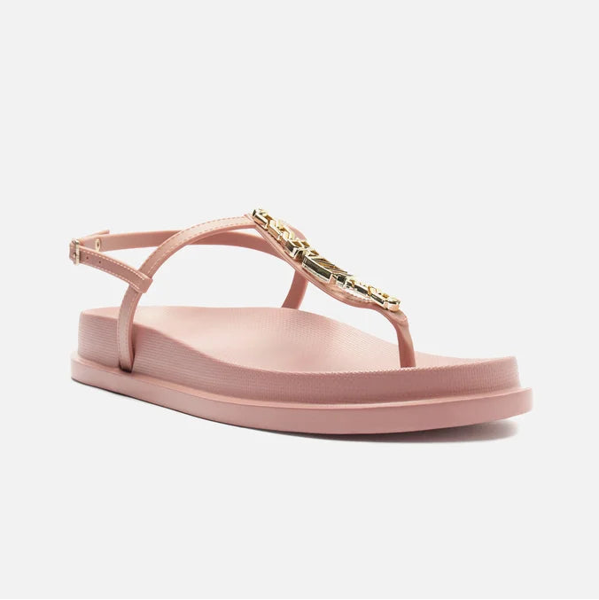 Descrição: O sapato tem salto rasteiro, palmilha com formato anatômico e inscrição do nome da marca. Possui solado em EVA e formato arredondado na ponta. Traz tira fina com strass que passa entre os dedos, conectada a mais uma tira fina na parte superior do pé. Possui ainda tira fina em torno do calcanhar com fecho em fivela metálica lateral. Deixa todo o pé à mostra.