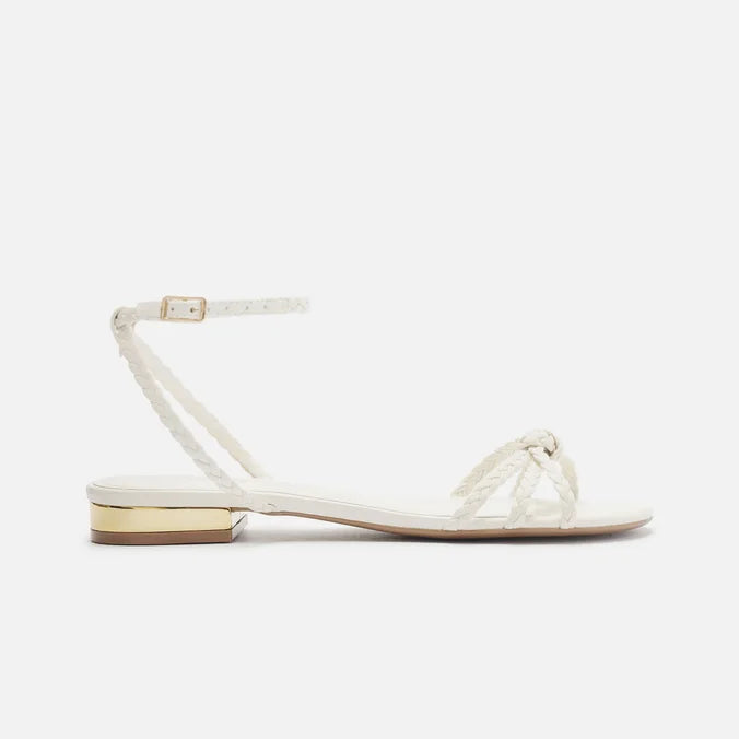 Descrição: O sapato tem salto bloco bem baixo metálico e formato arredondado na ponta. Traz tiras finas trançadas e unidas por nó sobre os dedos. Possui tira fina trançada que sai das laterais, se cruza no calcanhar, contorna o tornozelo e fecha em fivela lateral. Com palmilha da cor da sandália e inscrição do nome da marca. A sandália exibe todo o pé.