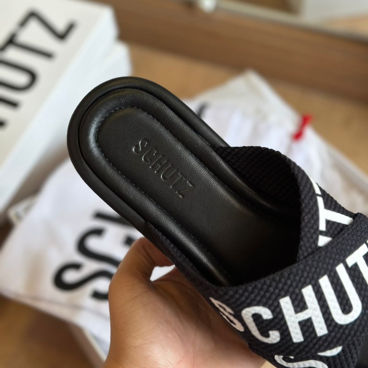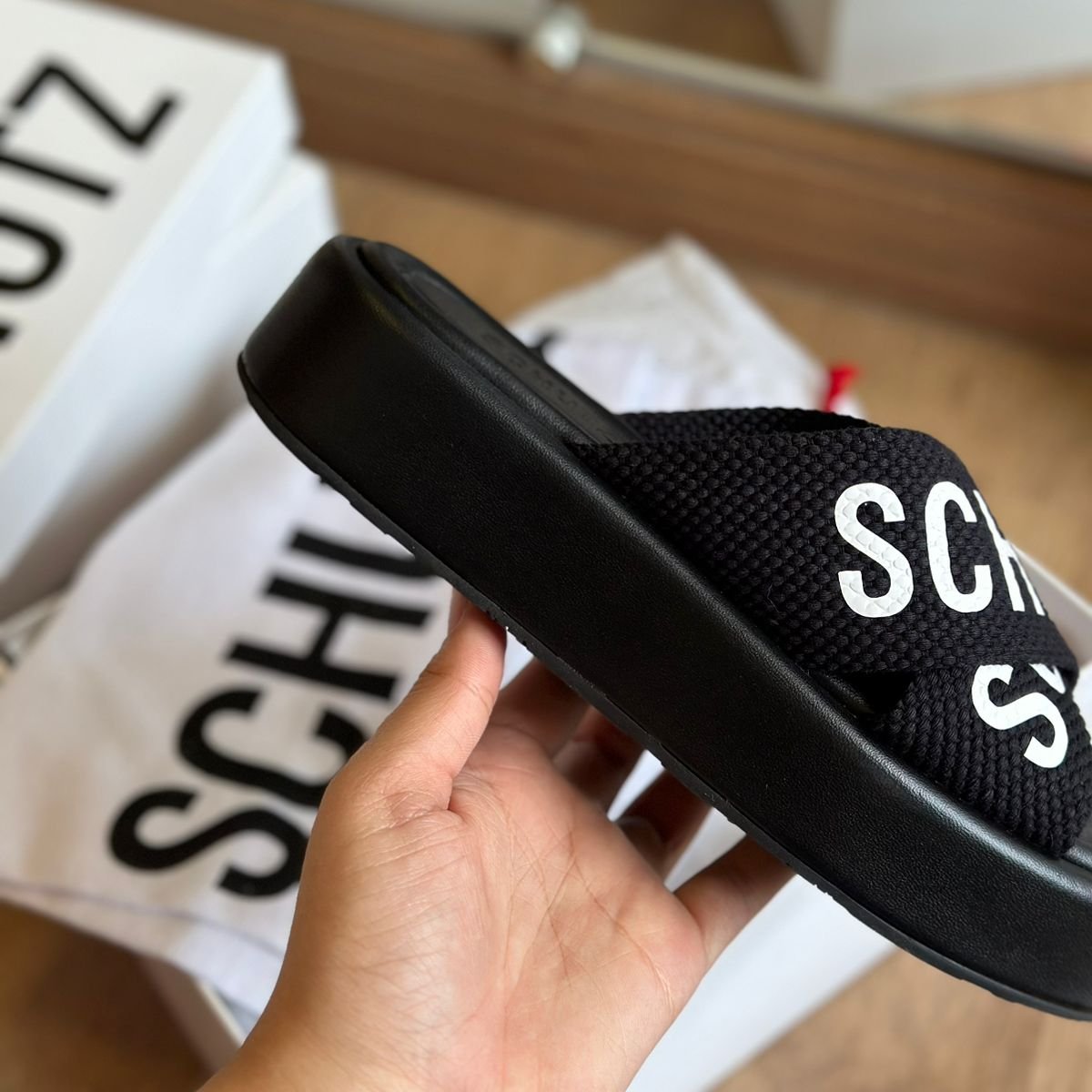 Arrase com esse chinelo plataforma no estilo slide! As tiras de gorgorão cruzadas e o detalhe de logo Schutz trazem um toque chic, enquanto o bico quadrado e a palmilha em cor natural garantem um visual clean e moderno. A escolha certa para quem quer estilo e conforto sem esforço.