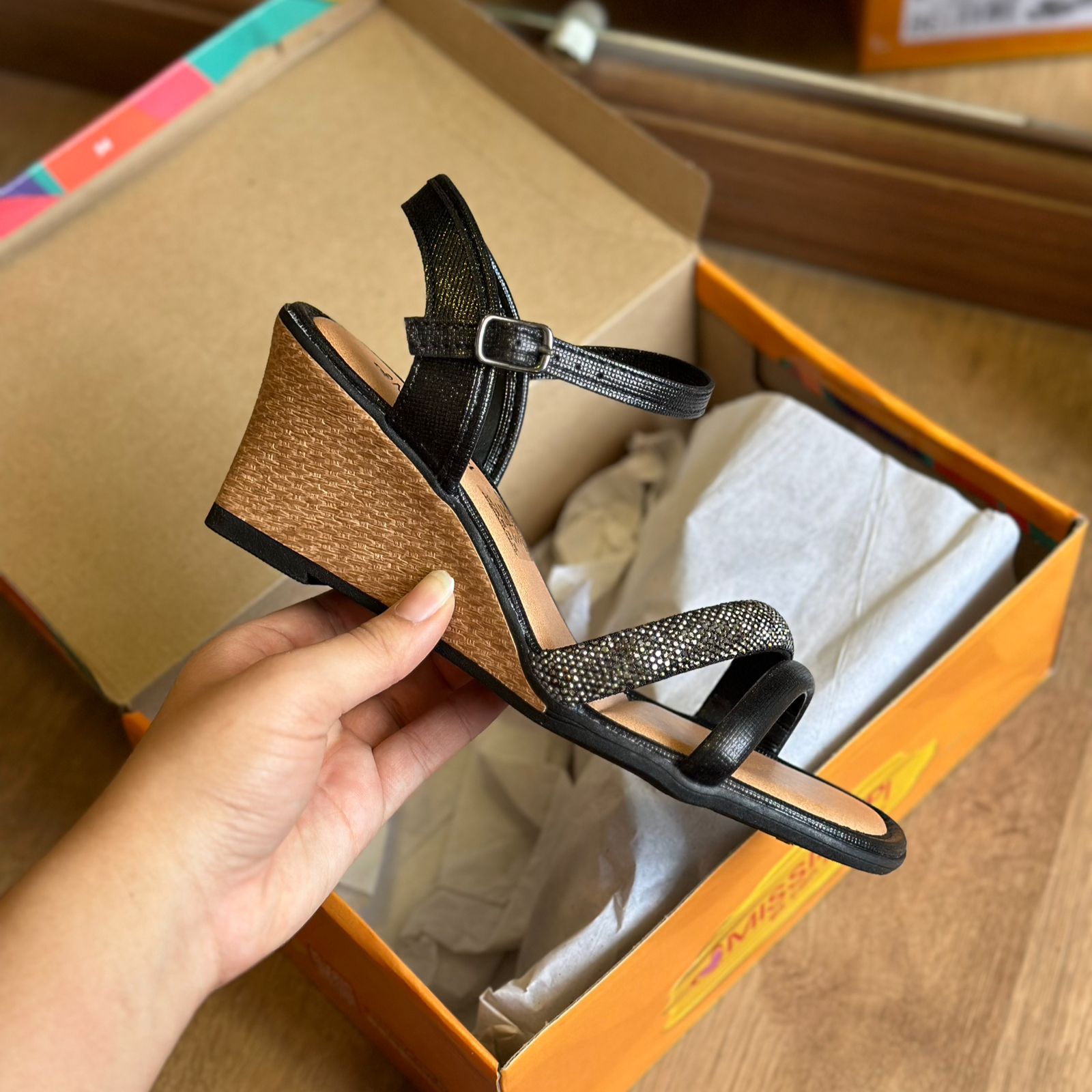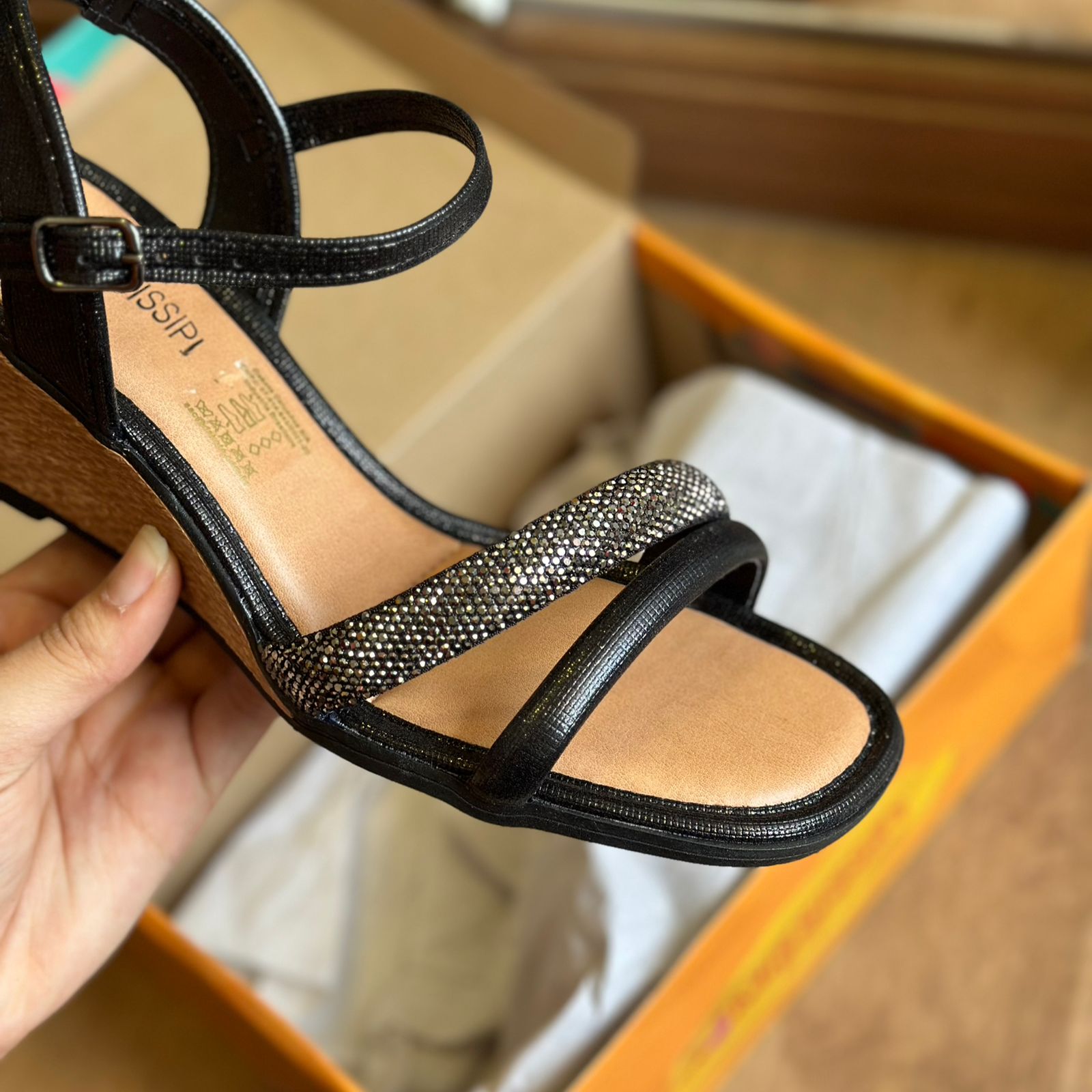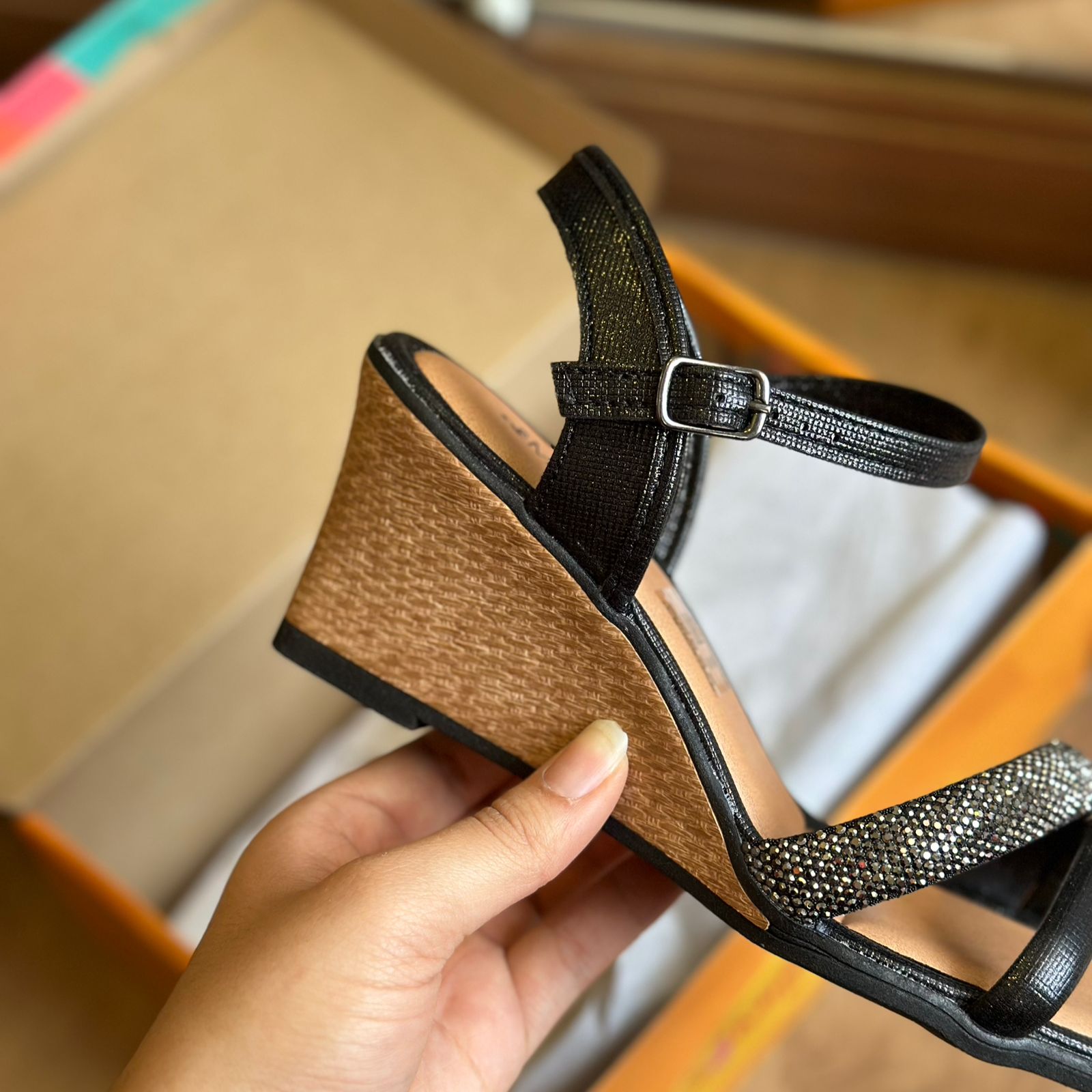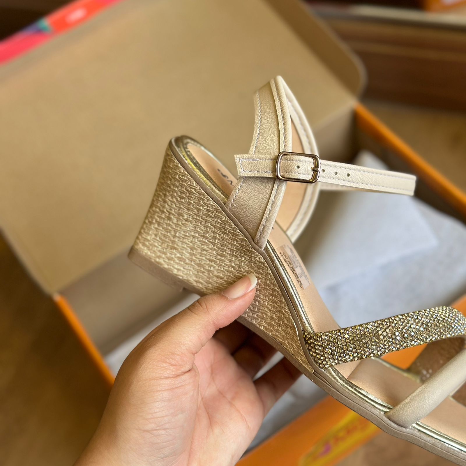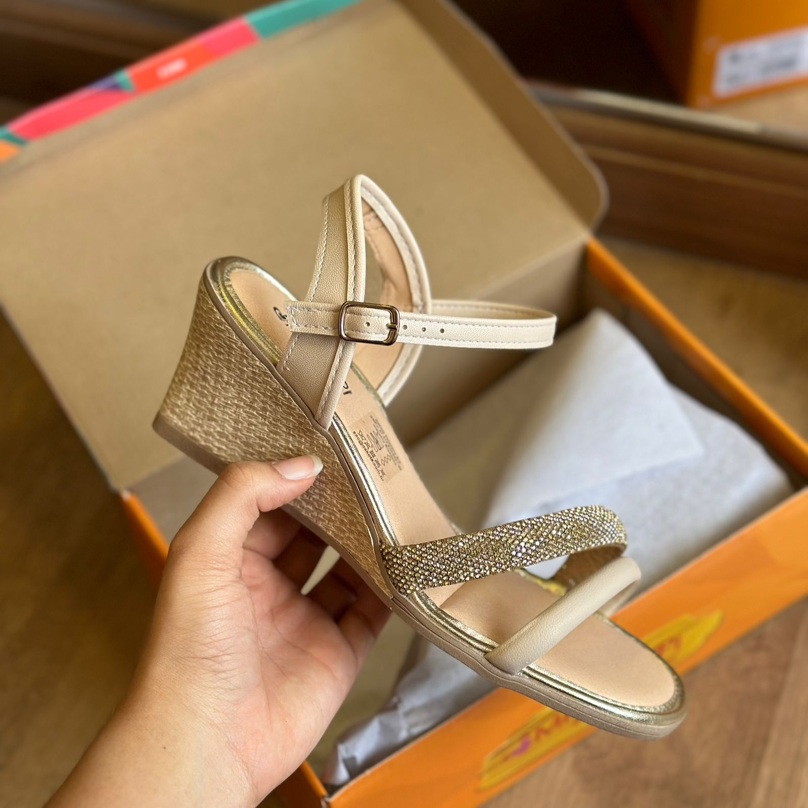 Seu destaque fica por conta da tira frontal repleta de brilhos, que adiciona um toque de glamour e sofisticação ao modelo. O salto anabela de 7 cm proporciona conforto e estabilidade ao caminhar, enquanto o fechamento de fivela no tornozelo garante um ajuste perfeito e seguro.