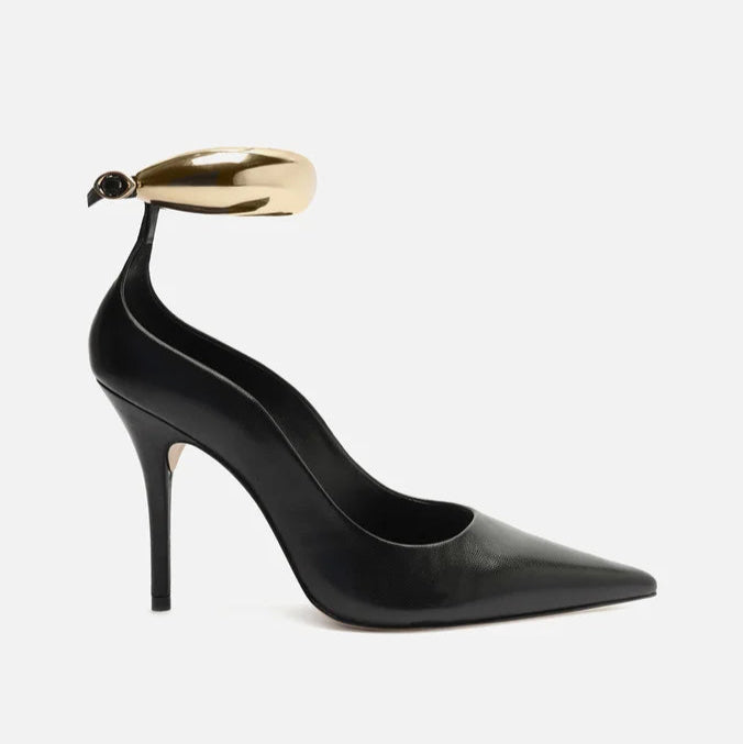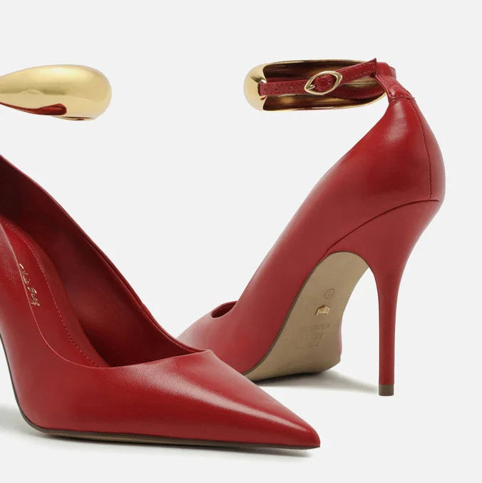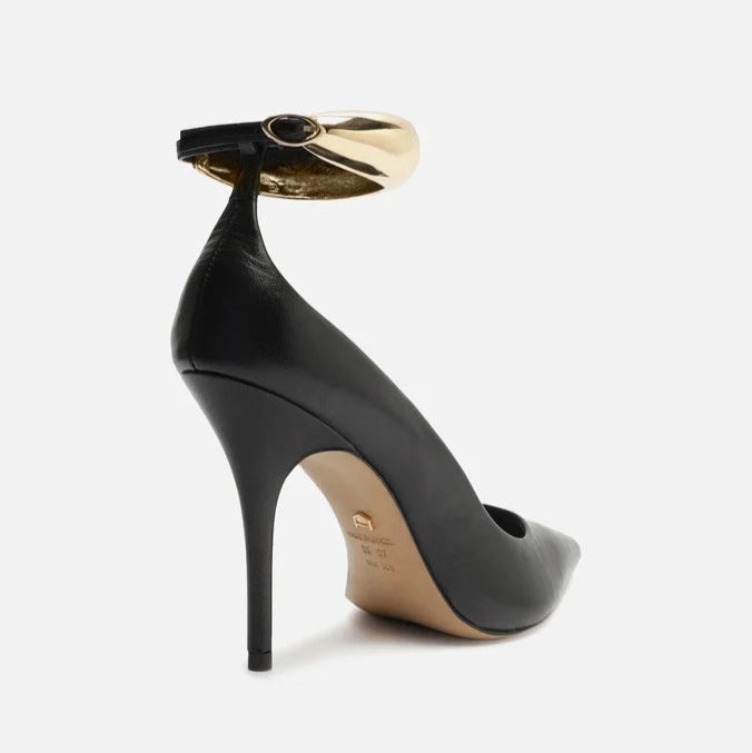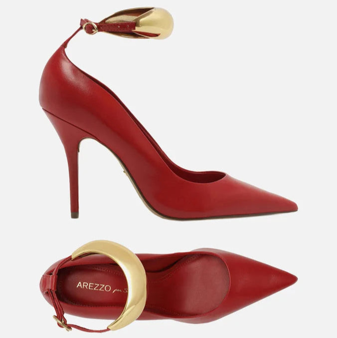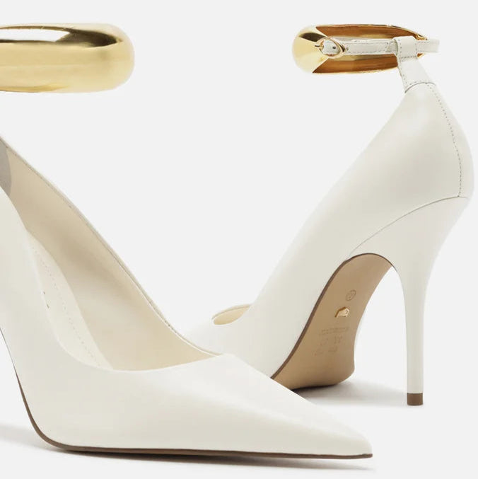 Um clássico renovado! O scarpin de ponta fina surge com tira no tornozelo e metal imponente, expressando a tendência dos bold accessories da temporada. Perfeito para inserir elegância e sofisticação nas suas produções! O sapato é parte da collab com a influenciadora Silvia Braz.