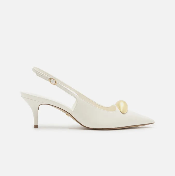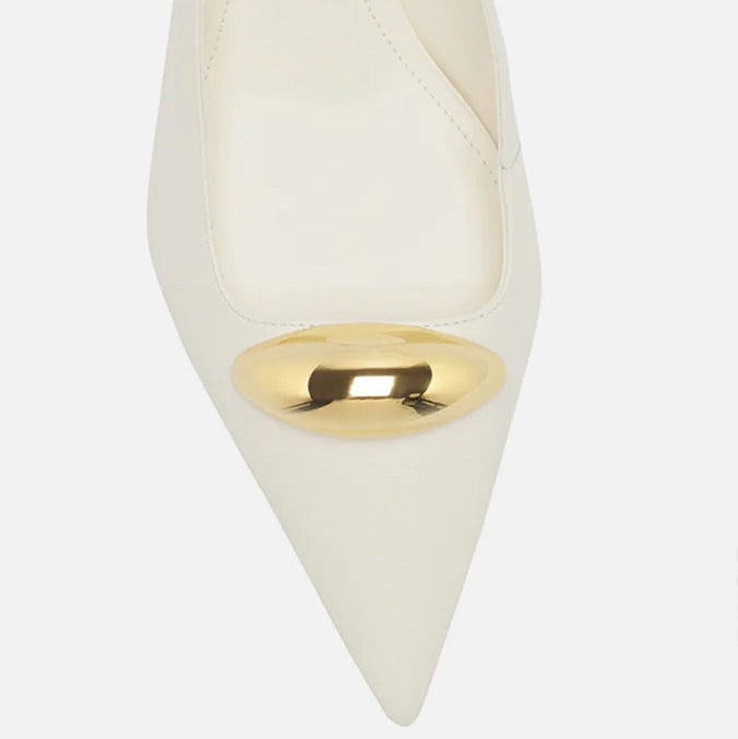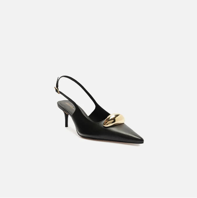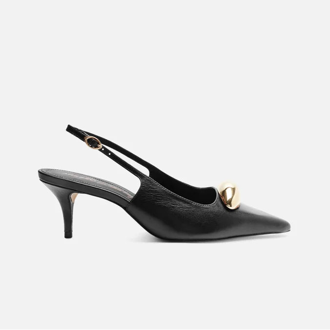Um clássico renovado! O scarpin de ponta fina surge com tira slingback e metal imponente, expressando a tendência dos bold accessories da temporada. Perfeito para inserir elegância e sofisticação nas suas produções! O sapato é parte da collab com a influenciadora Silvia Braz.