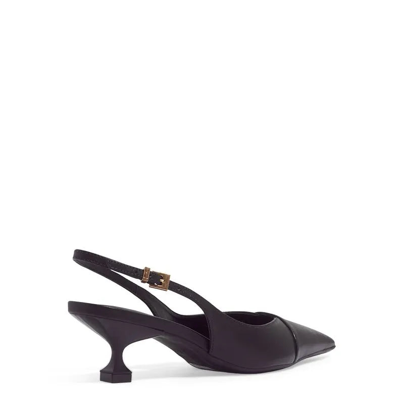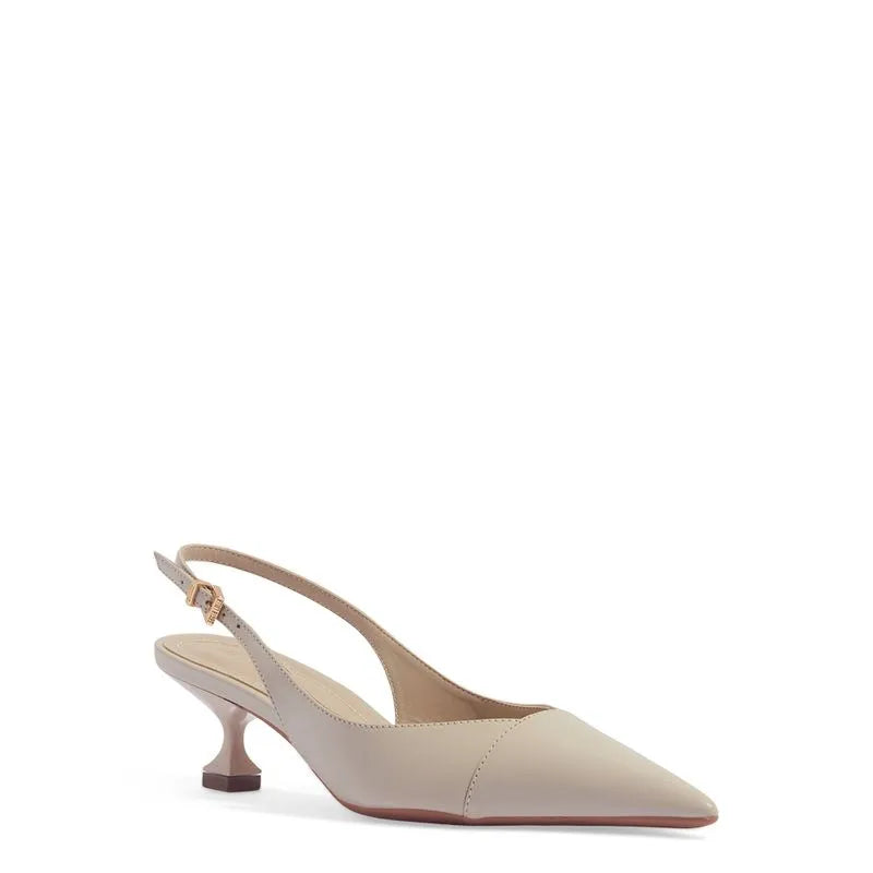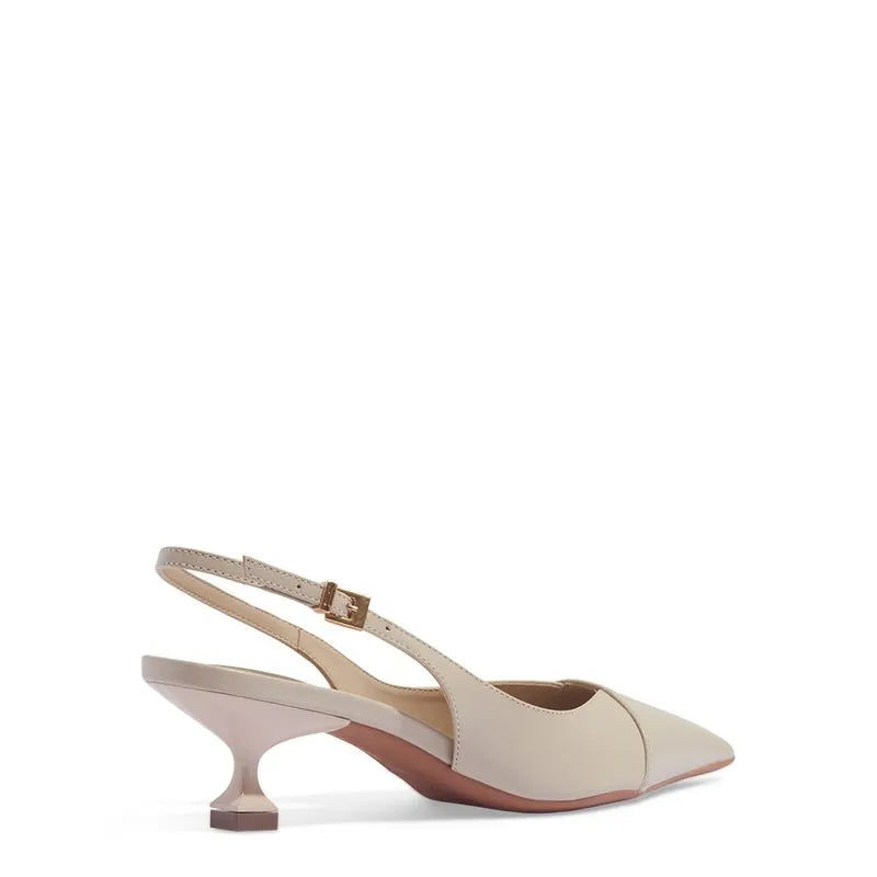 Este produto é um sapato feminino elegante, de salto baixo, no estilo slingback, com uma alça ajustável e fechamento delicado. Ele apresenta um design minimalista em tom neutro, perfeito para compor looks sofisticados e versáteis. O bico fino confere um toque refinado, enquanto o salto curvado oferece estilo e conforto para uso prolongado. É ideal para ocasiões formais ou casuais que pedem um toque de elegância.