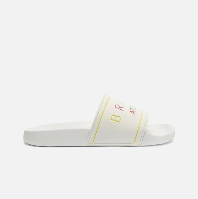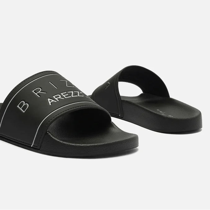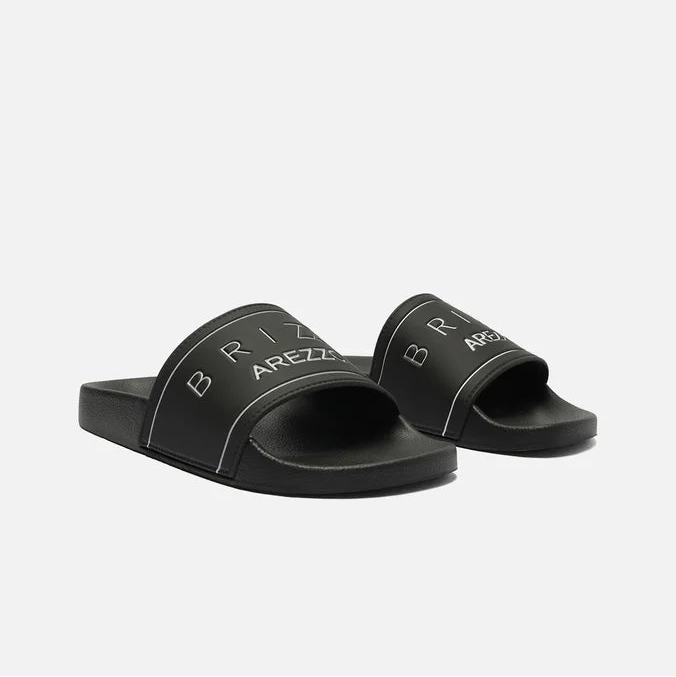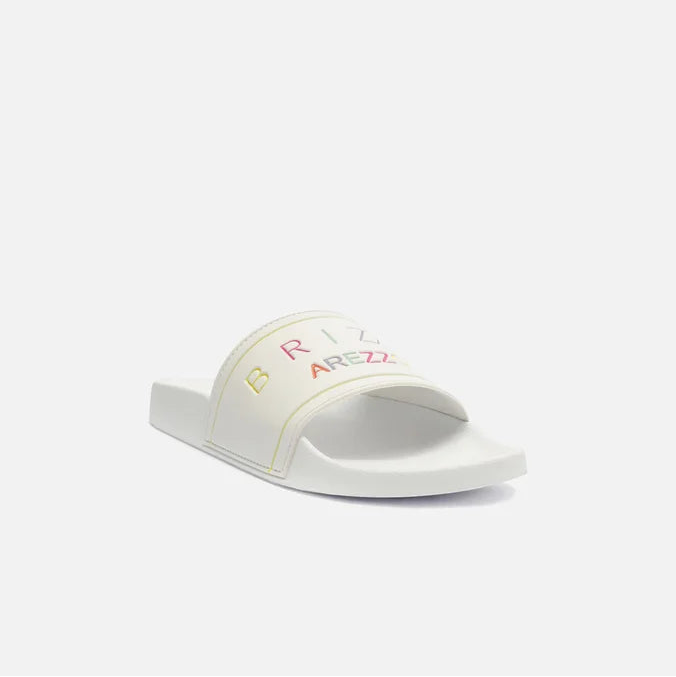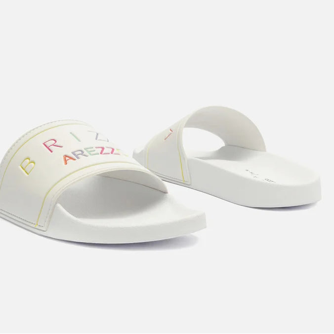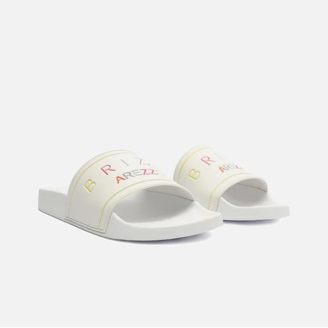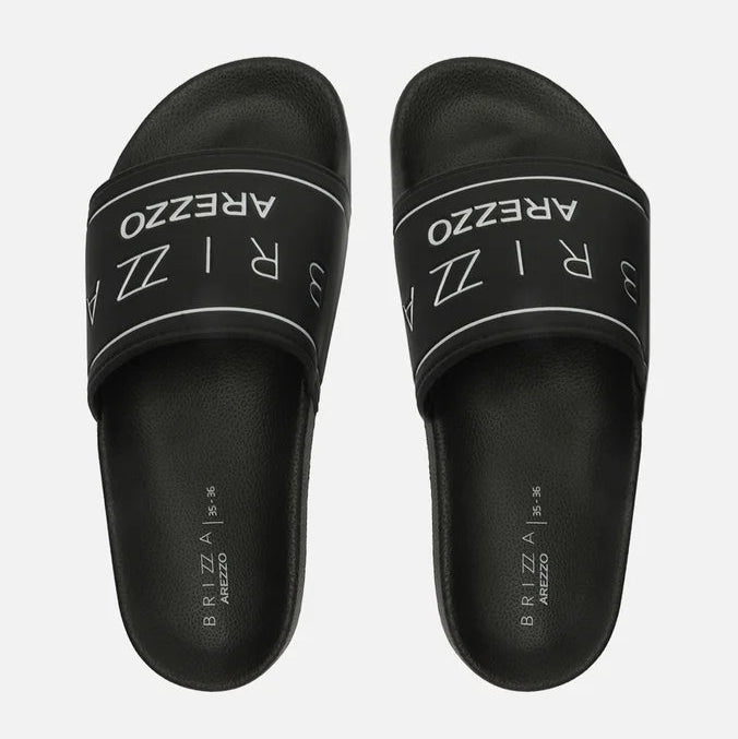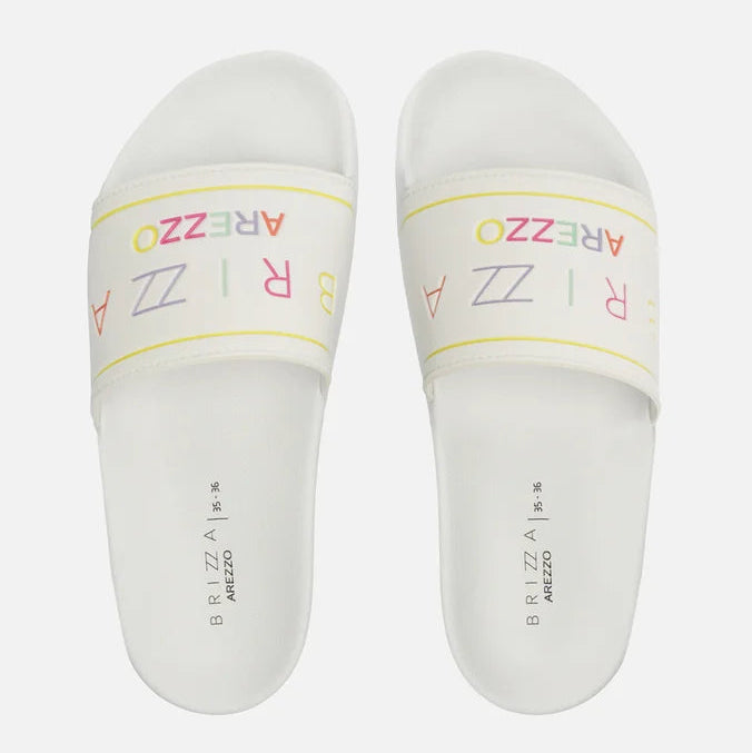 Descrição: O modelo tem salto rasteiro, palmilha com formato anatômico e inscrição do nome da marca. Possui solado em EVA e bico redondo. Traz tira larga e única sobre os dedos e o peito do pé com lettering Brizza Arezzo em branco.