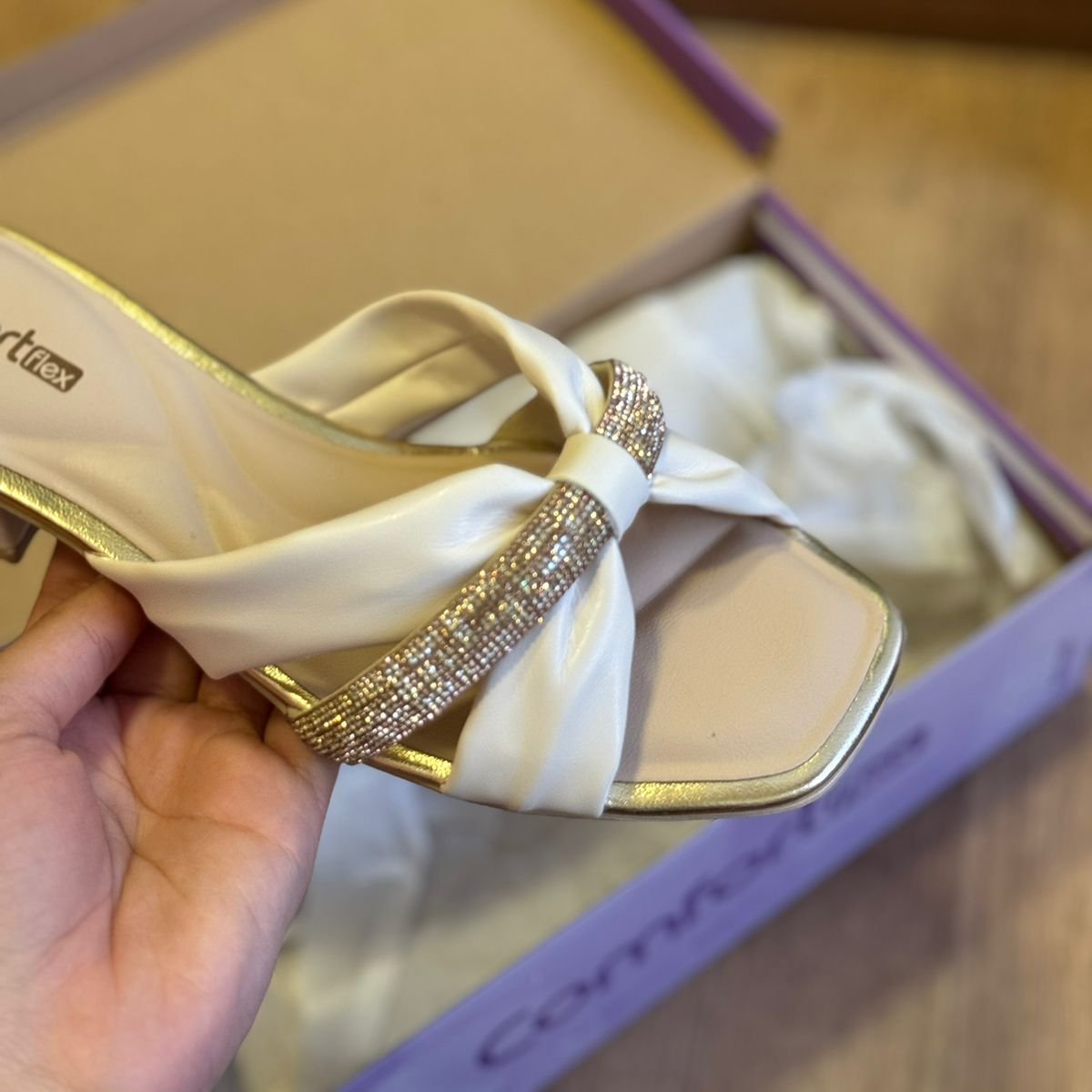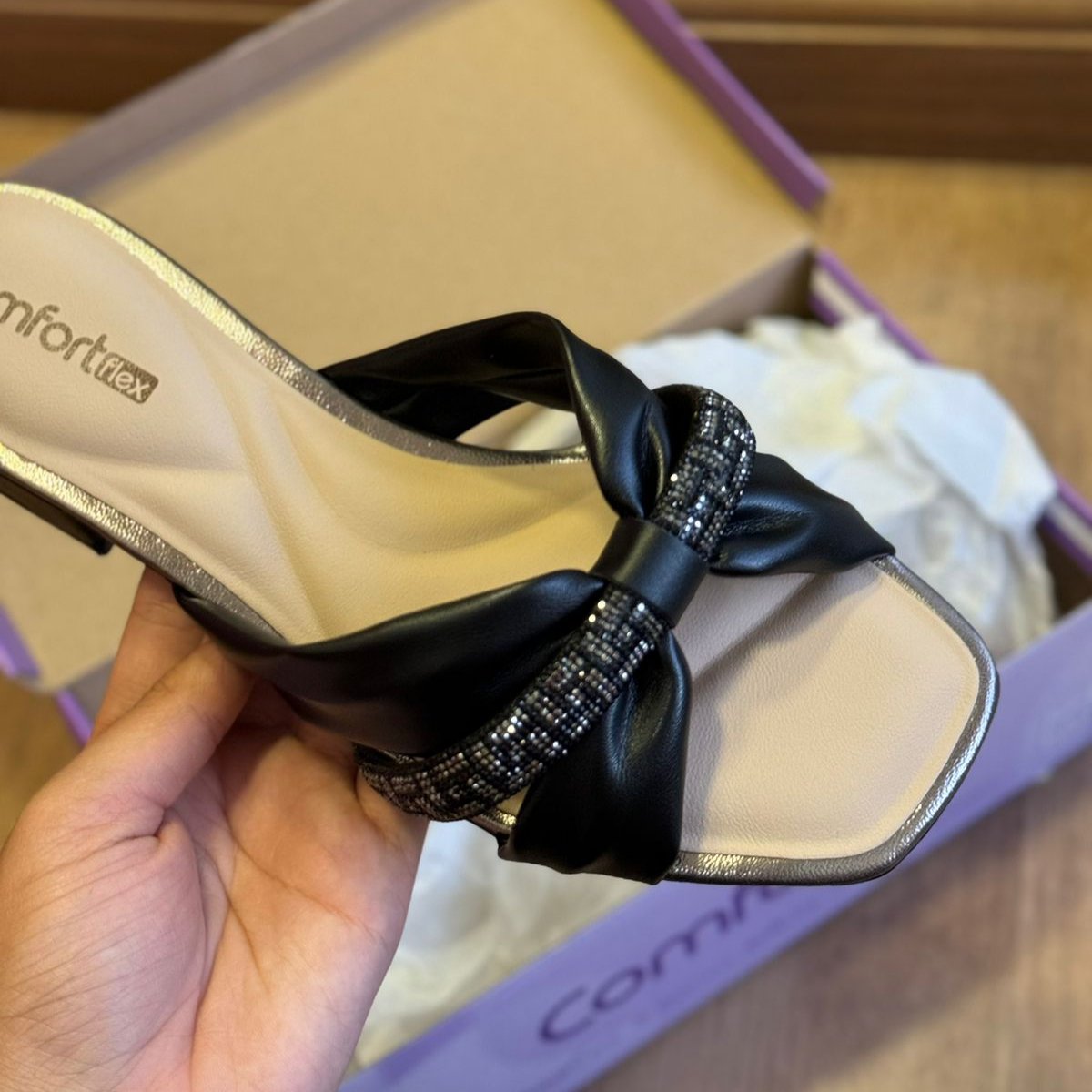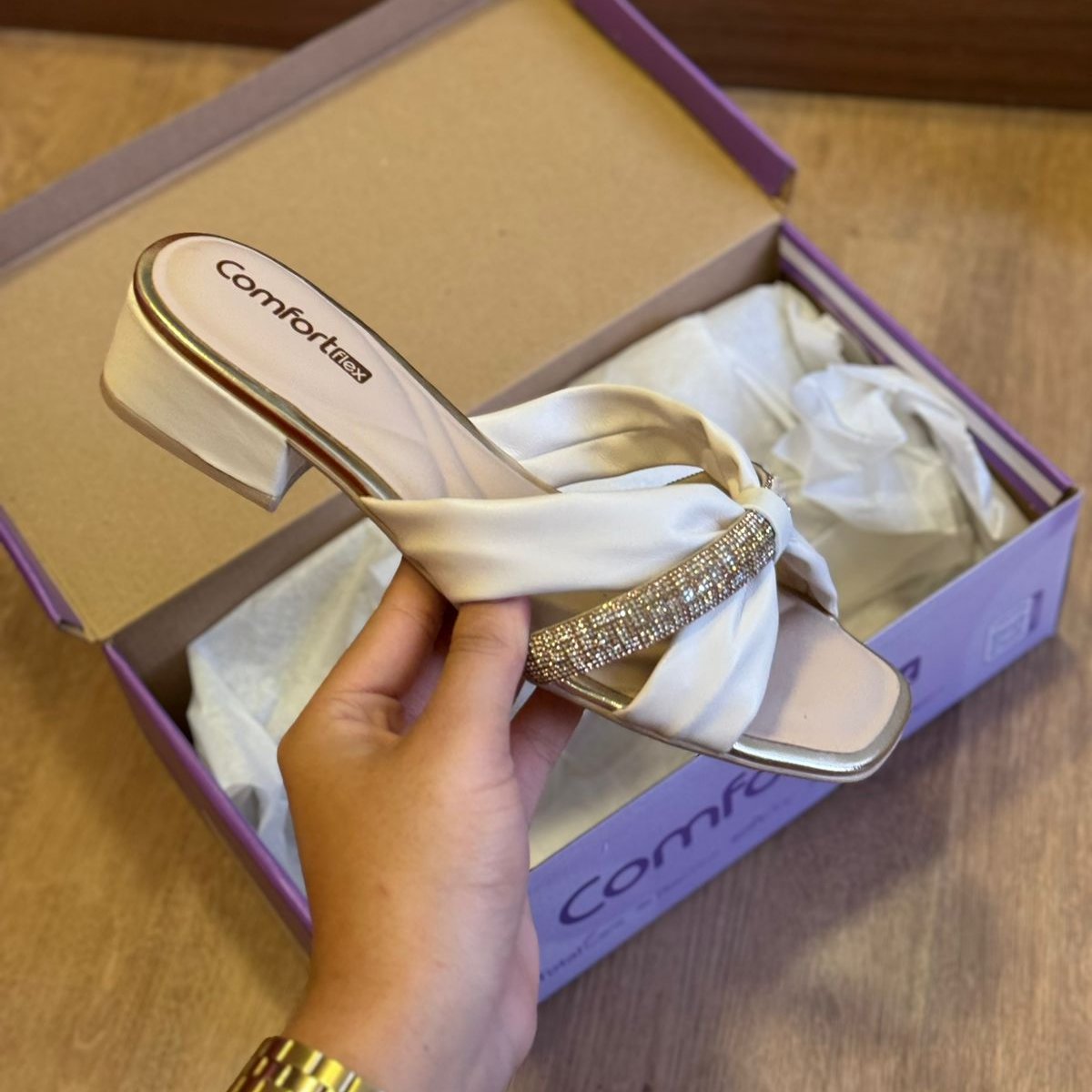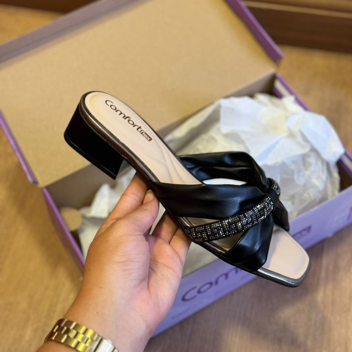 Tamanco de Salto Bloco Feminino Comfortflex, confeccionado em material sintético com detalhes em strass e salto bloco de aproximadamente 4cm, esse tamanco é sinônimo de conforto e bem estar, podendo ser usado em ocasiões casuais ou dia a dia.