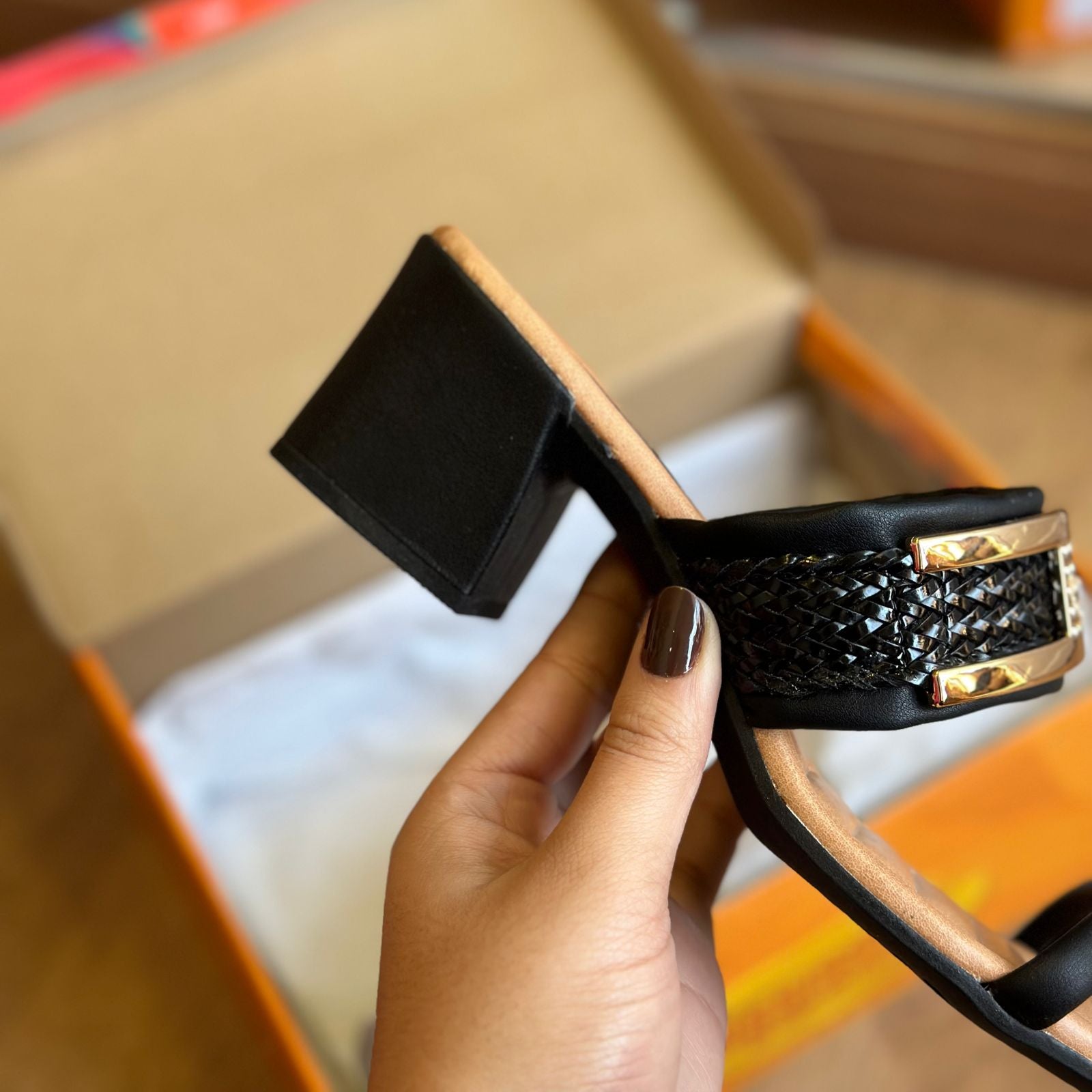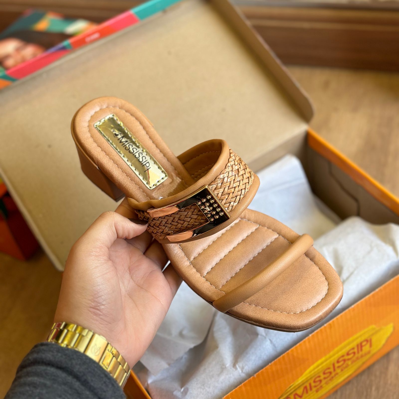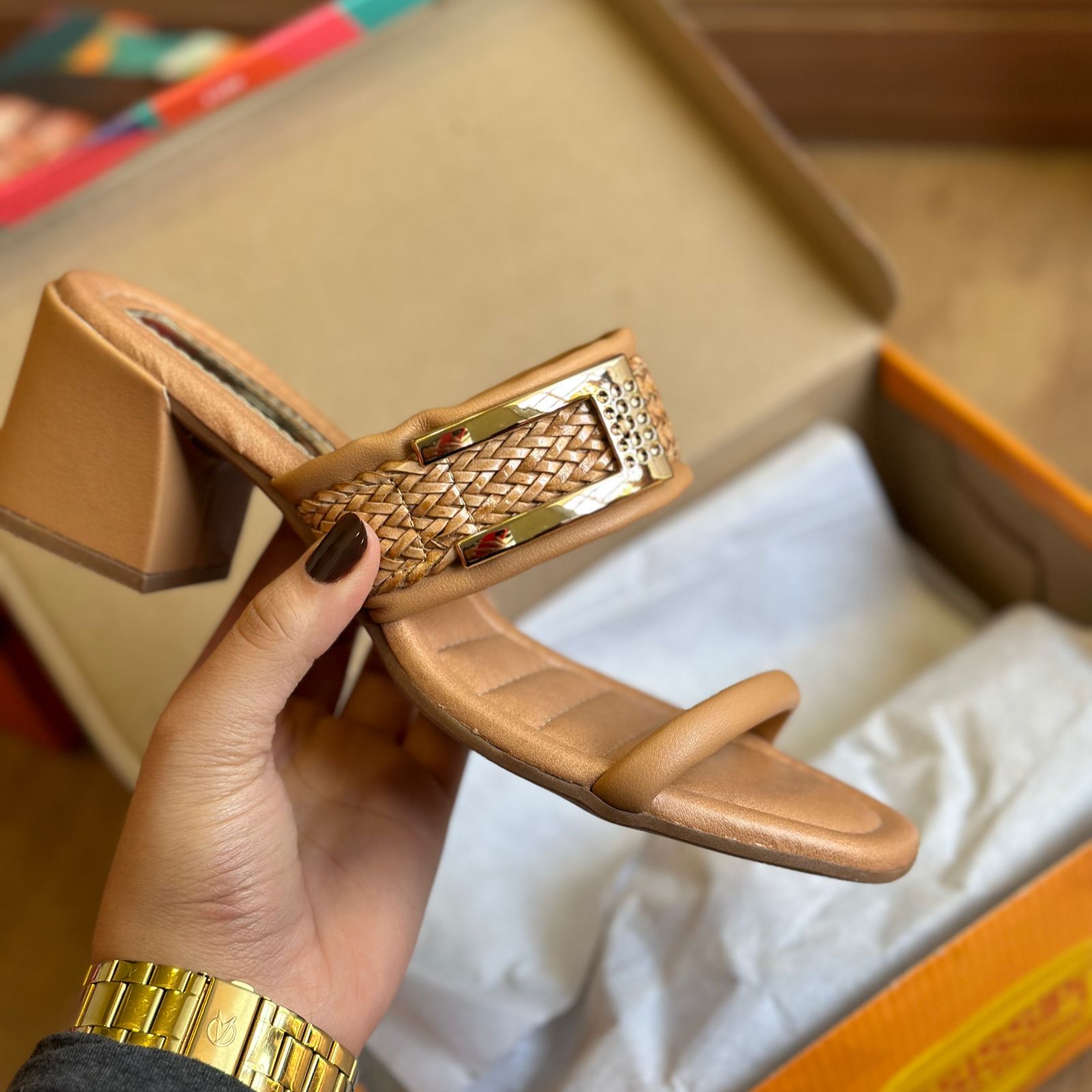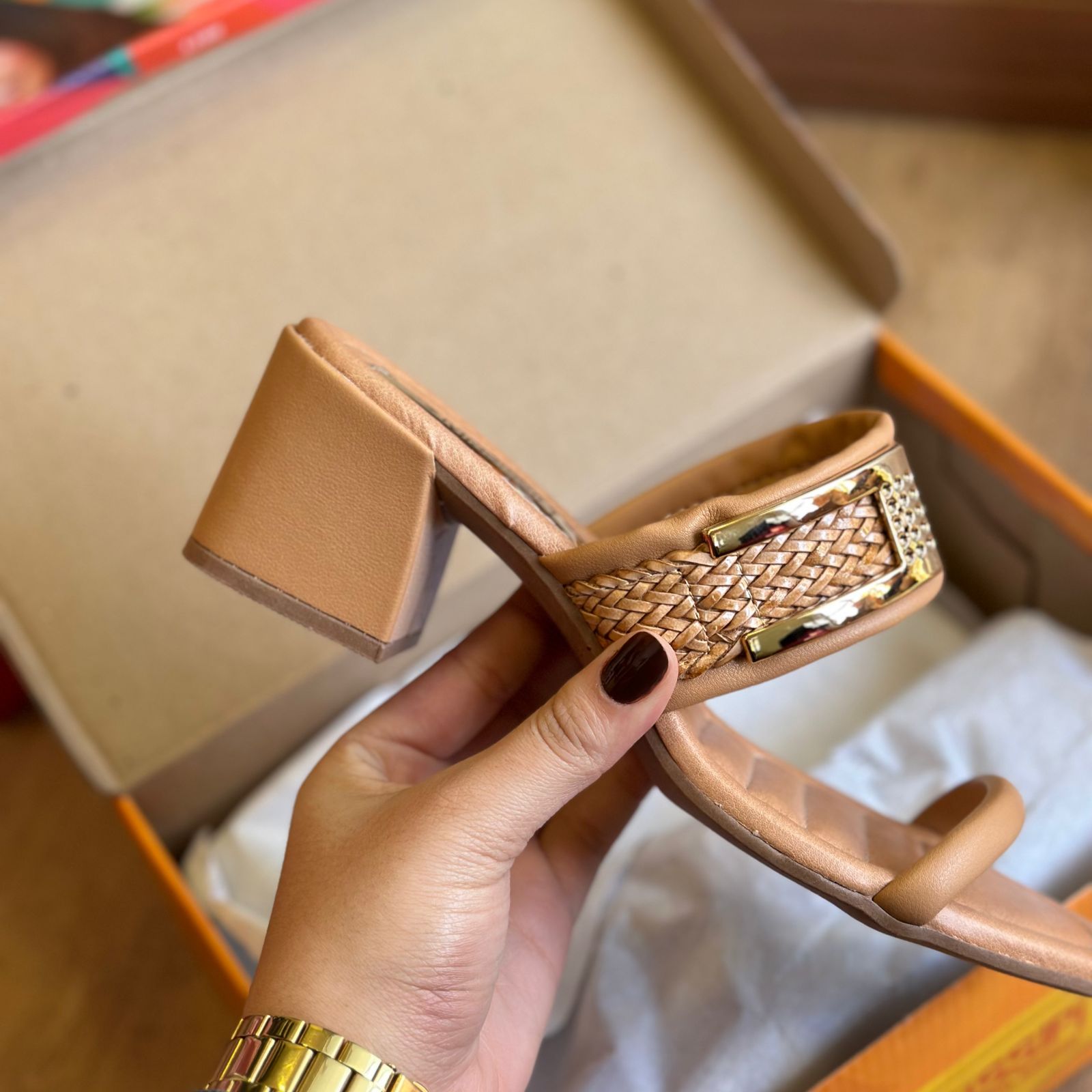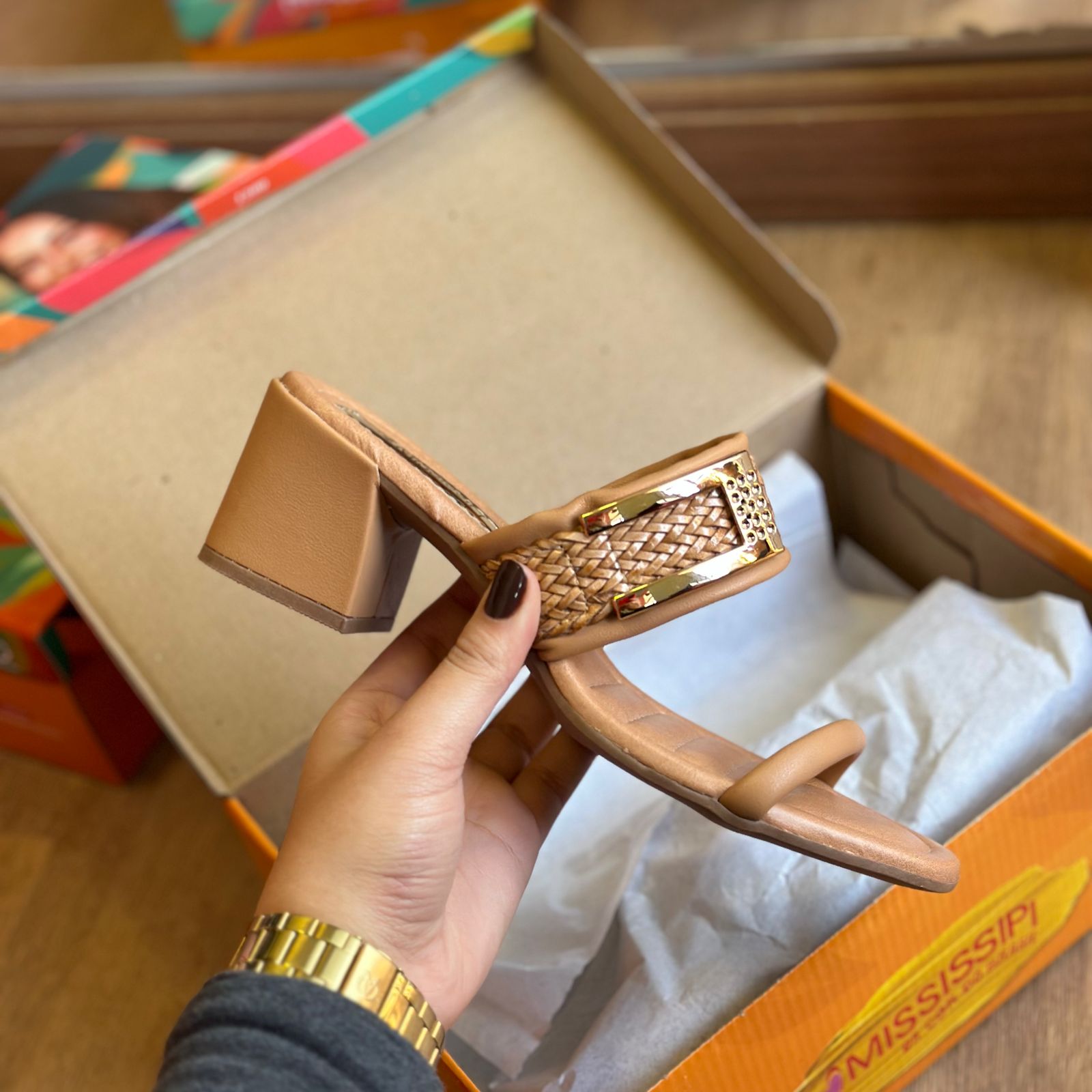 O Tamanco Mississipi de Salto Bloco Caramelo traz a união de conforto e estilo e está disponível na cor caramelo. O destaque do modelo fica por conta do detalhe trançado e da peça metalizada aplicados sobre o pé, que conferem um ar artesanal e elegante ao tamanco. O salto bloco com 6 cm de altura garante um leve aumento na estatura e proporciona maior conforto ao caminhar, sem abrir mão da estabilidade. Com um peso de apenas 0,593 kg, o tamanco é extremamente leve e confortável, ideal para o dia a dia e momentos de lazer.