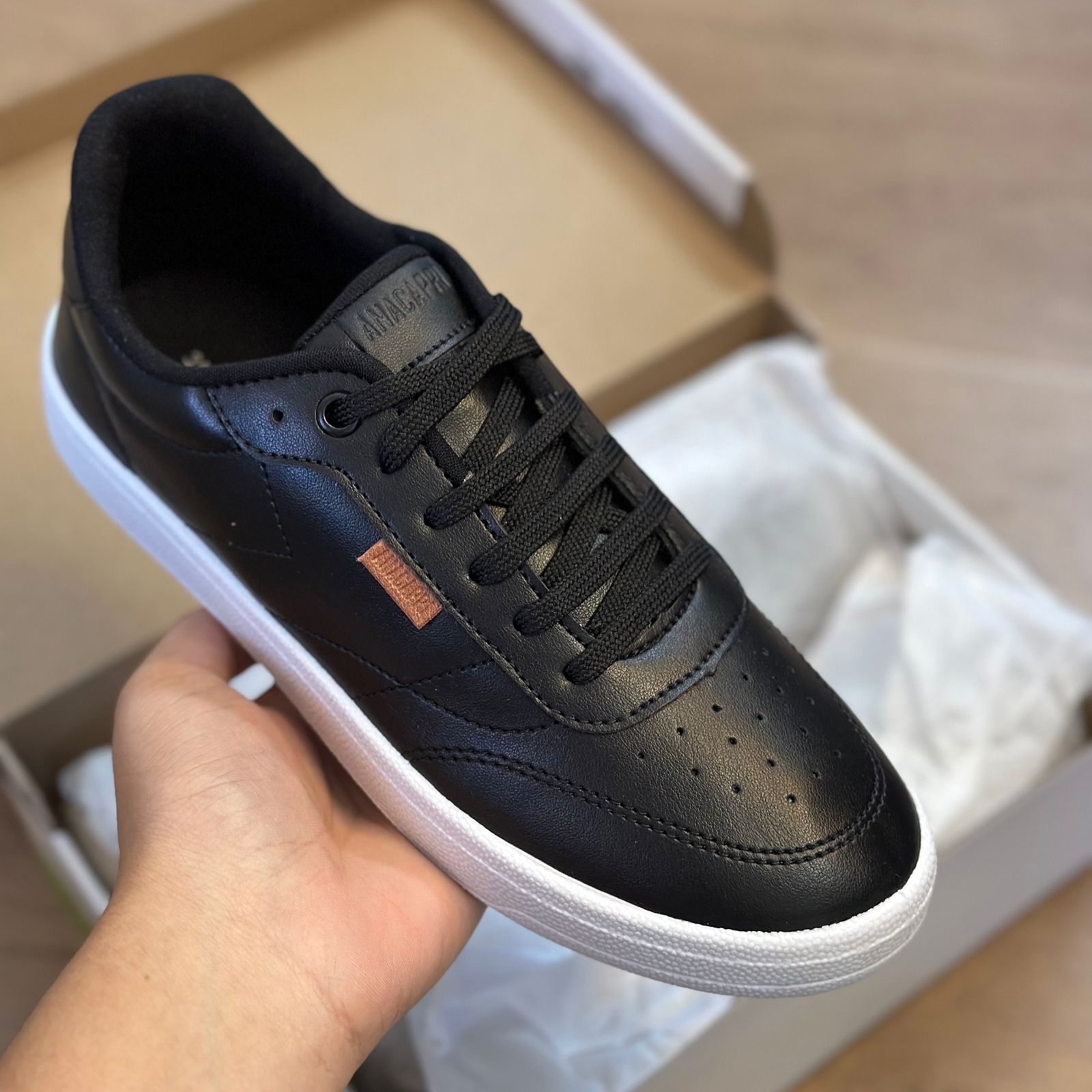 Possui detalhes em pesponto aparente, formando desenhos nas laterais, e atacadores da cor do modelo. Etiqueta na lingueta com a marca ANACAPRI carimbada e tag marrom lateral com o nome da marca.