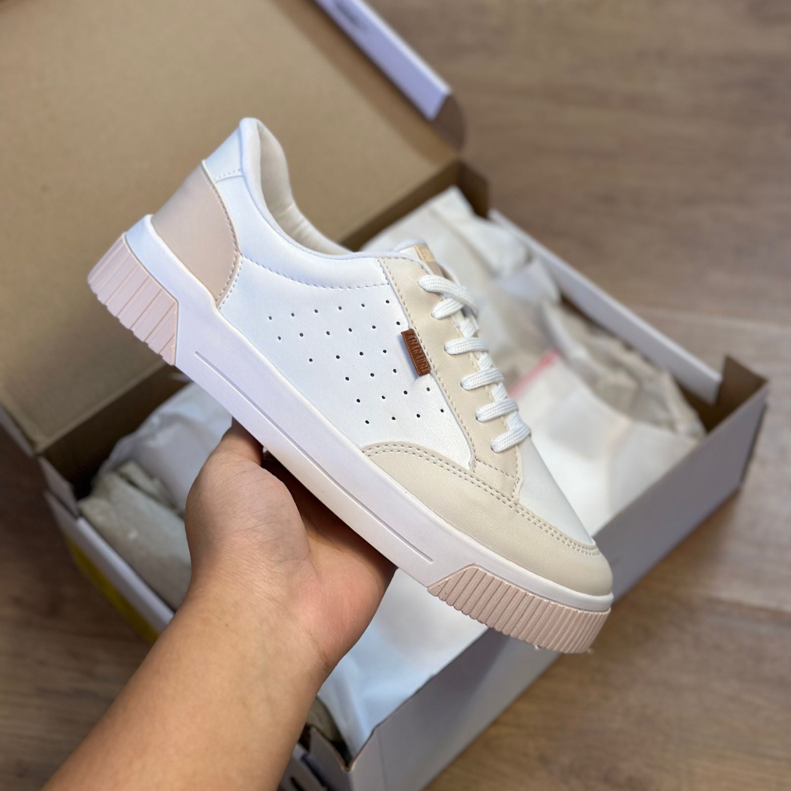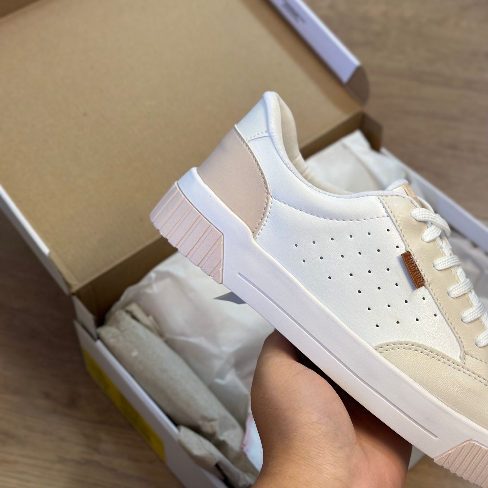 Este modelo apresenta um acabamento em material sintético de alta qualidade, que é conhecido pela sua durabilidade e facilidade de limpeza. A sua cor neutra e design minimalista tornam-no uma escolha versátil, adequada para diversas combinações de roupas e estilos pessoais.