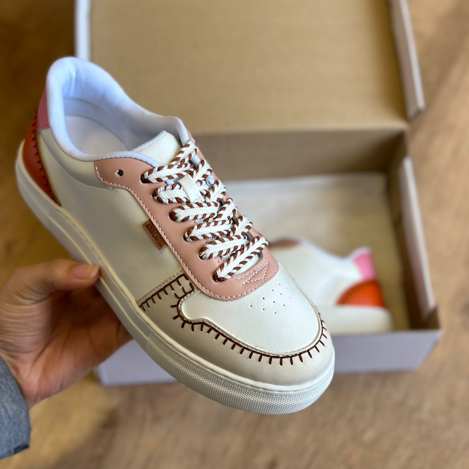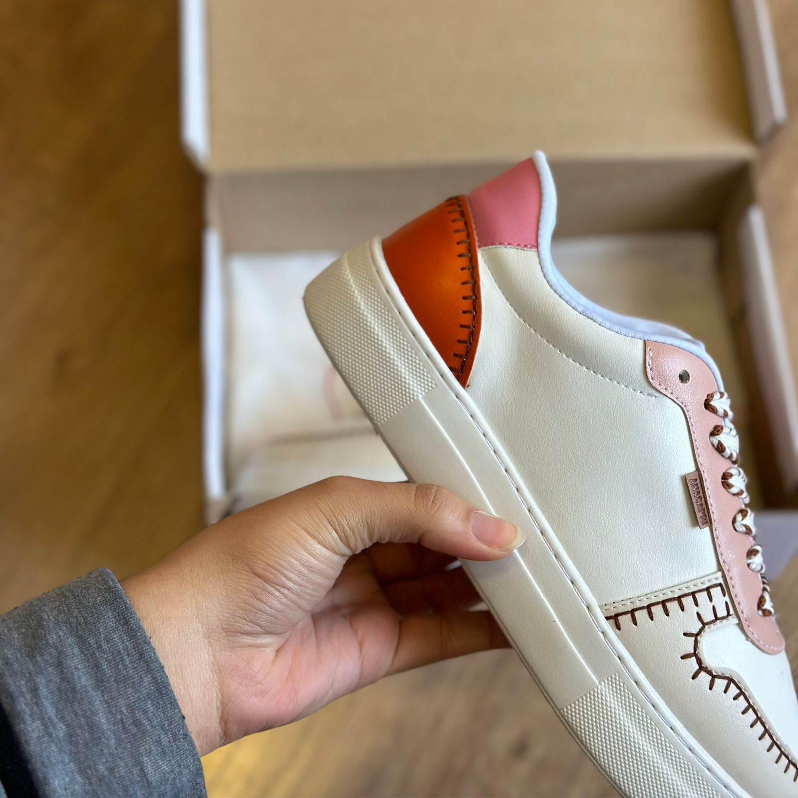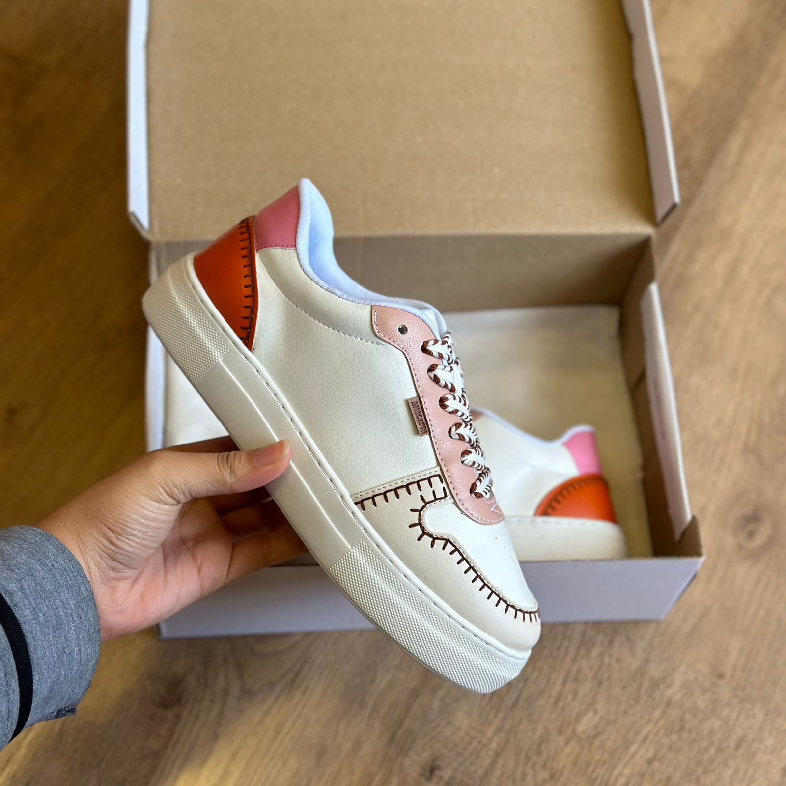 Tênis Pespontos Ayla Anacapri. O modelo possui bico arredondado e solado flatform, a palmilha traz o nome da marca gravado. Apresenta acabamento liso com detalhe de recortes e pespontos de coloração diferente, seu fechamento é por cadarço tendo tag do nome da marca na lateral.